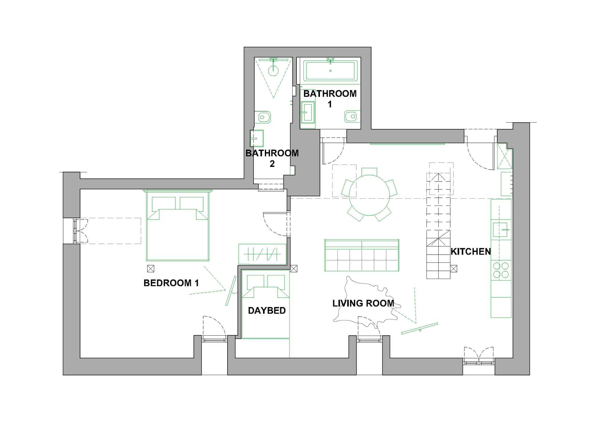 Apartment I: for 7 guests, with one bedroom, one bathroom and kitchen