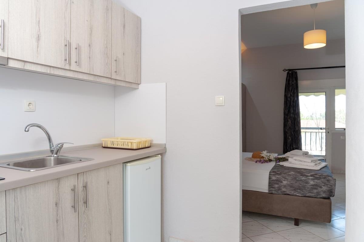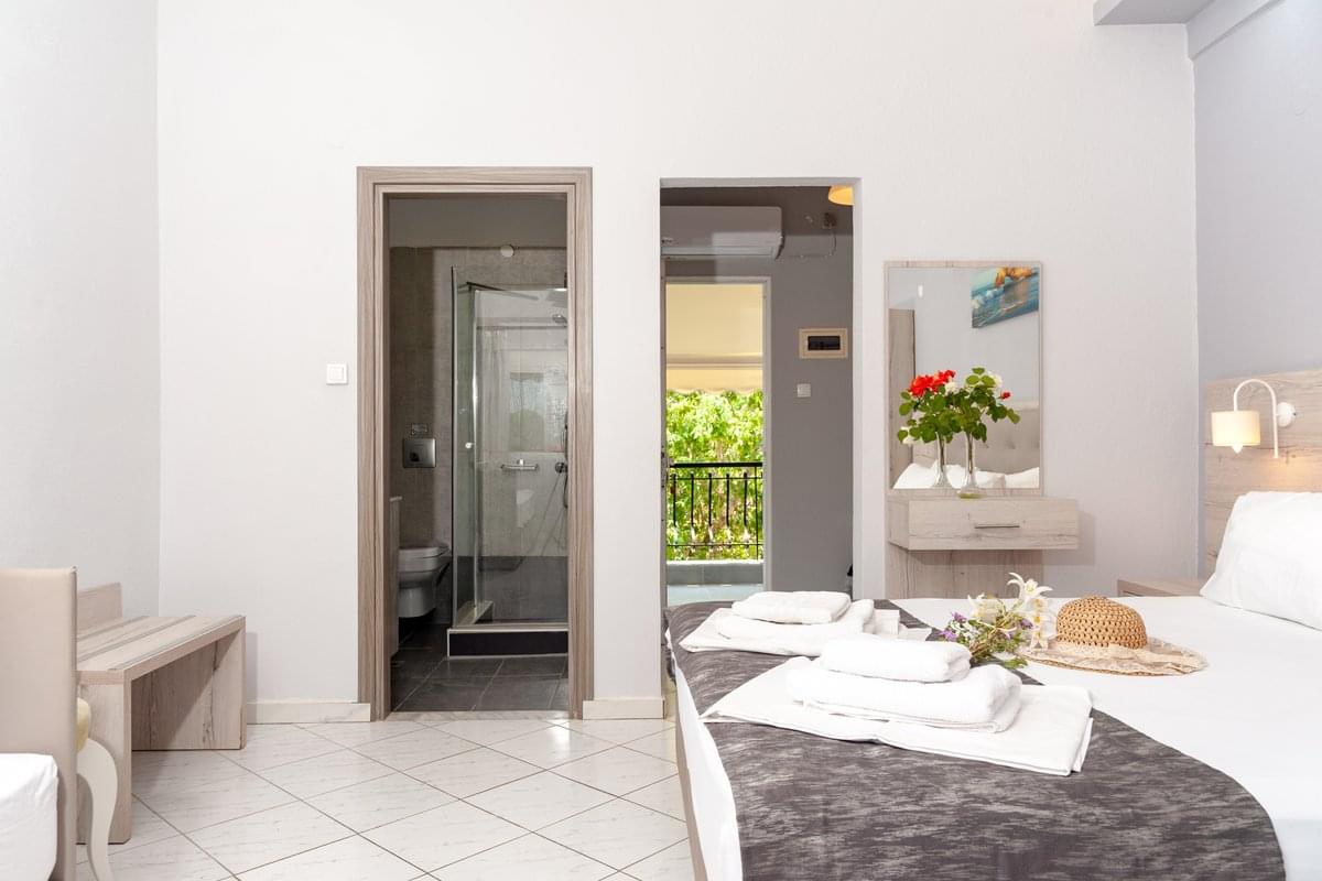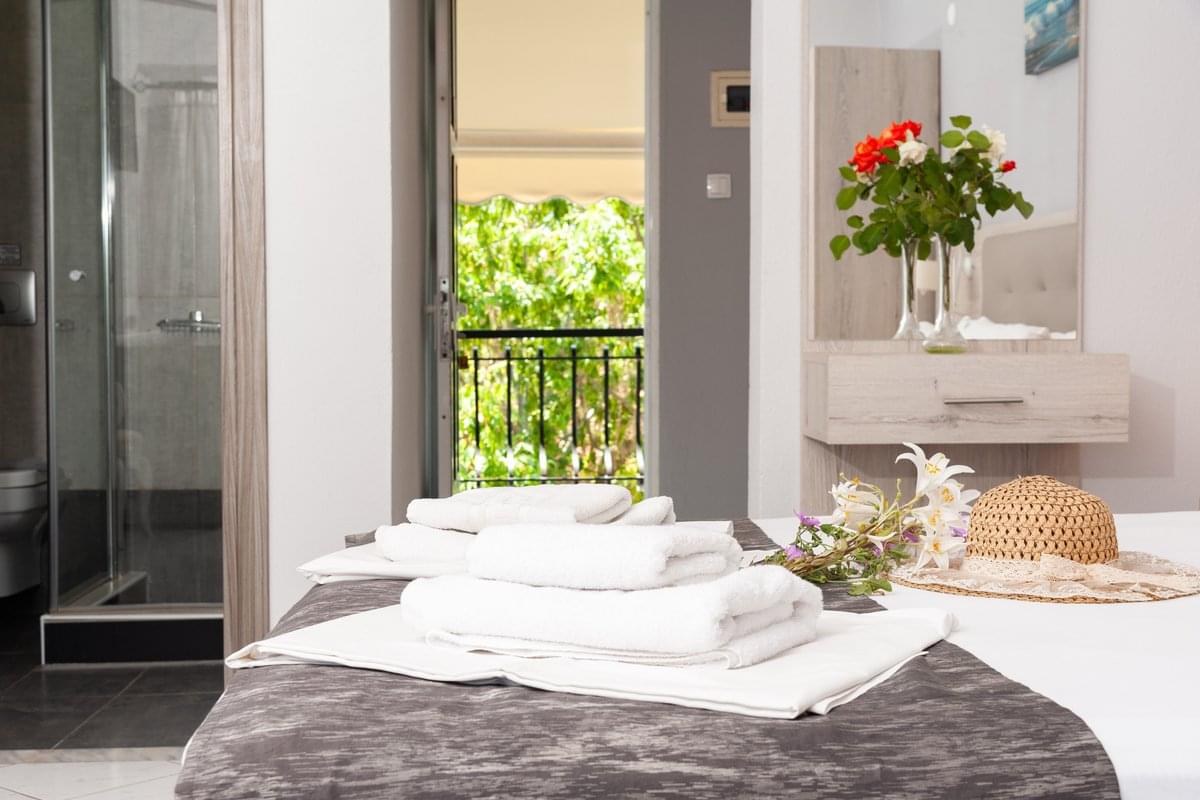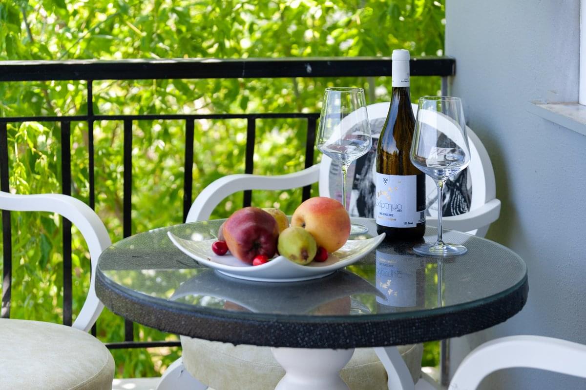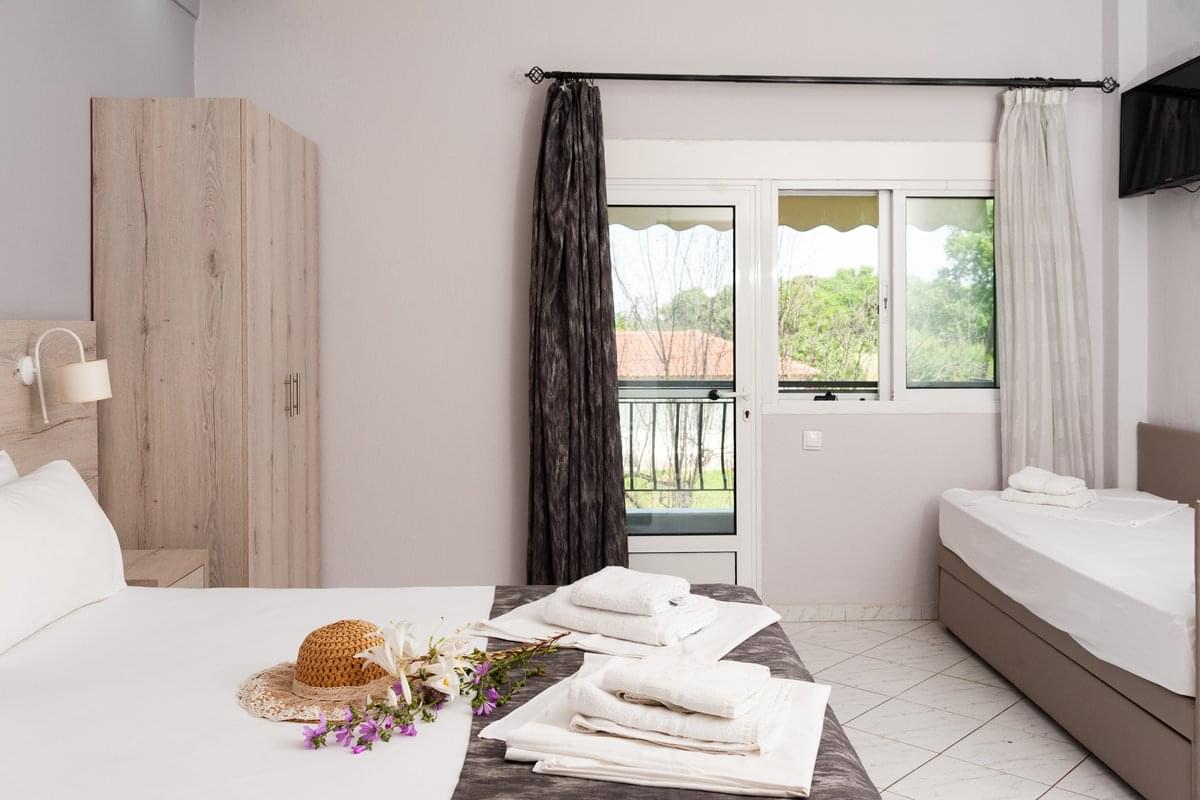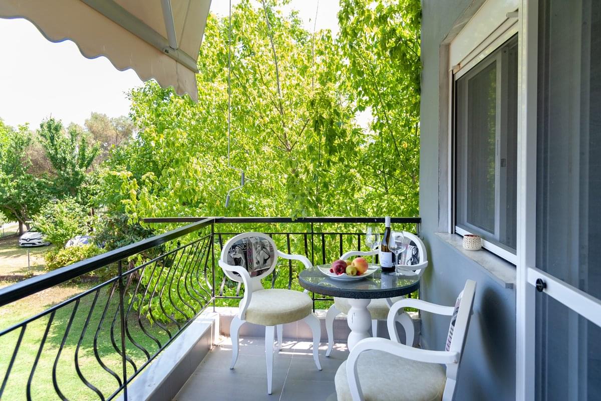 The balcony overlooks the garden or the pool, with direct access to the outdoor relaxation areas. A perfect choice for a quiet summer stay in Leptokarya.