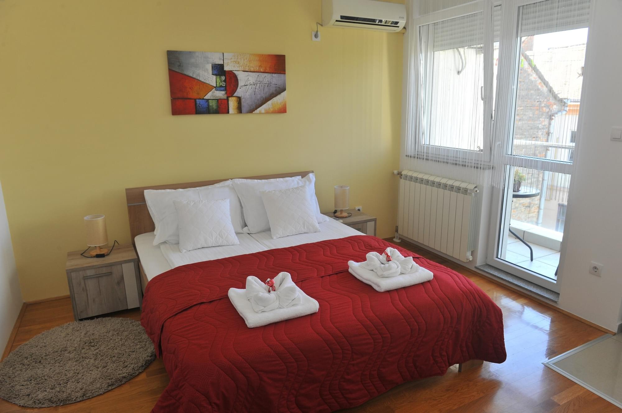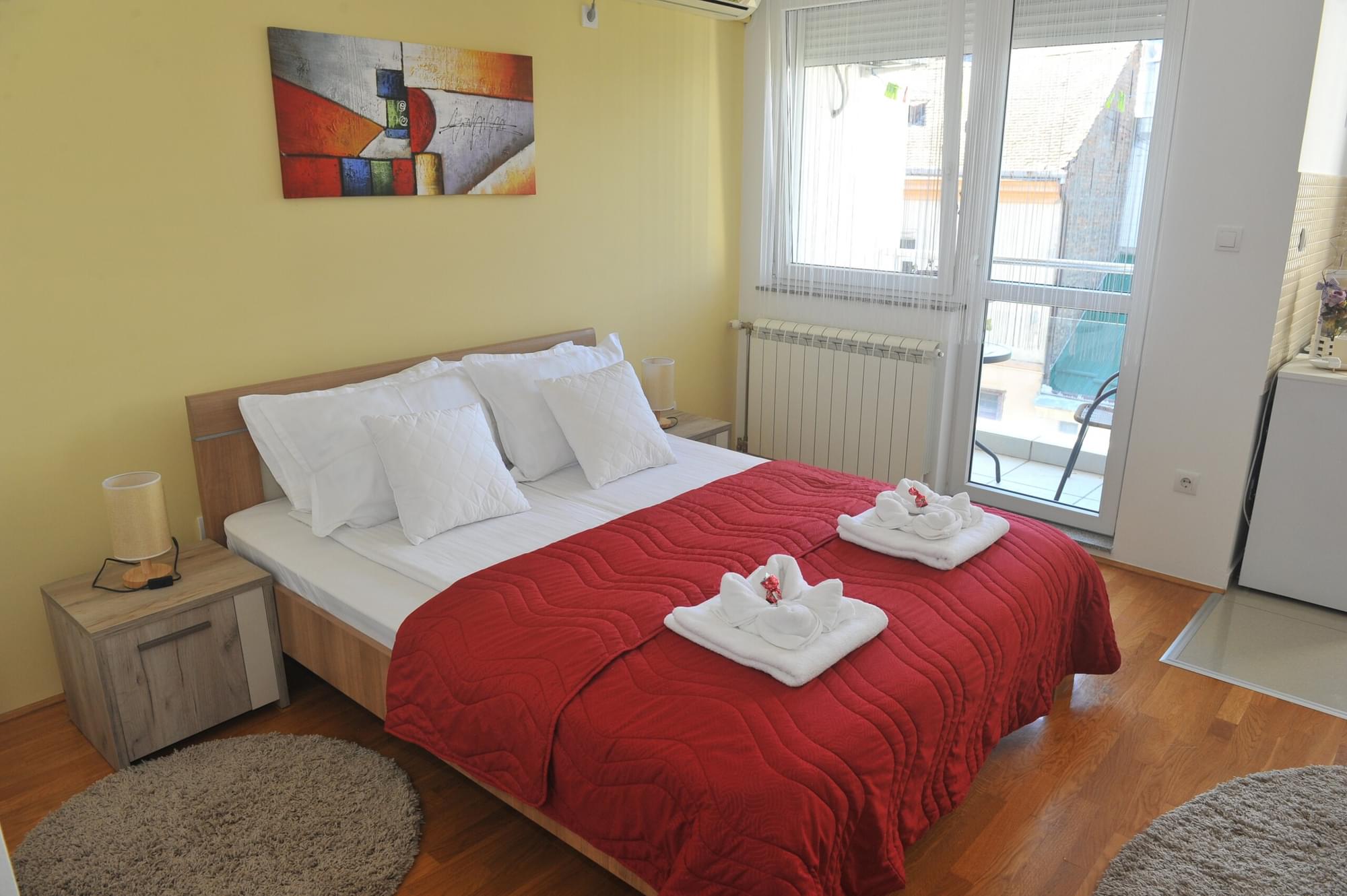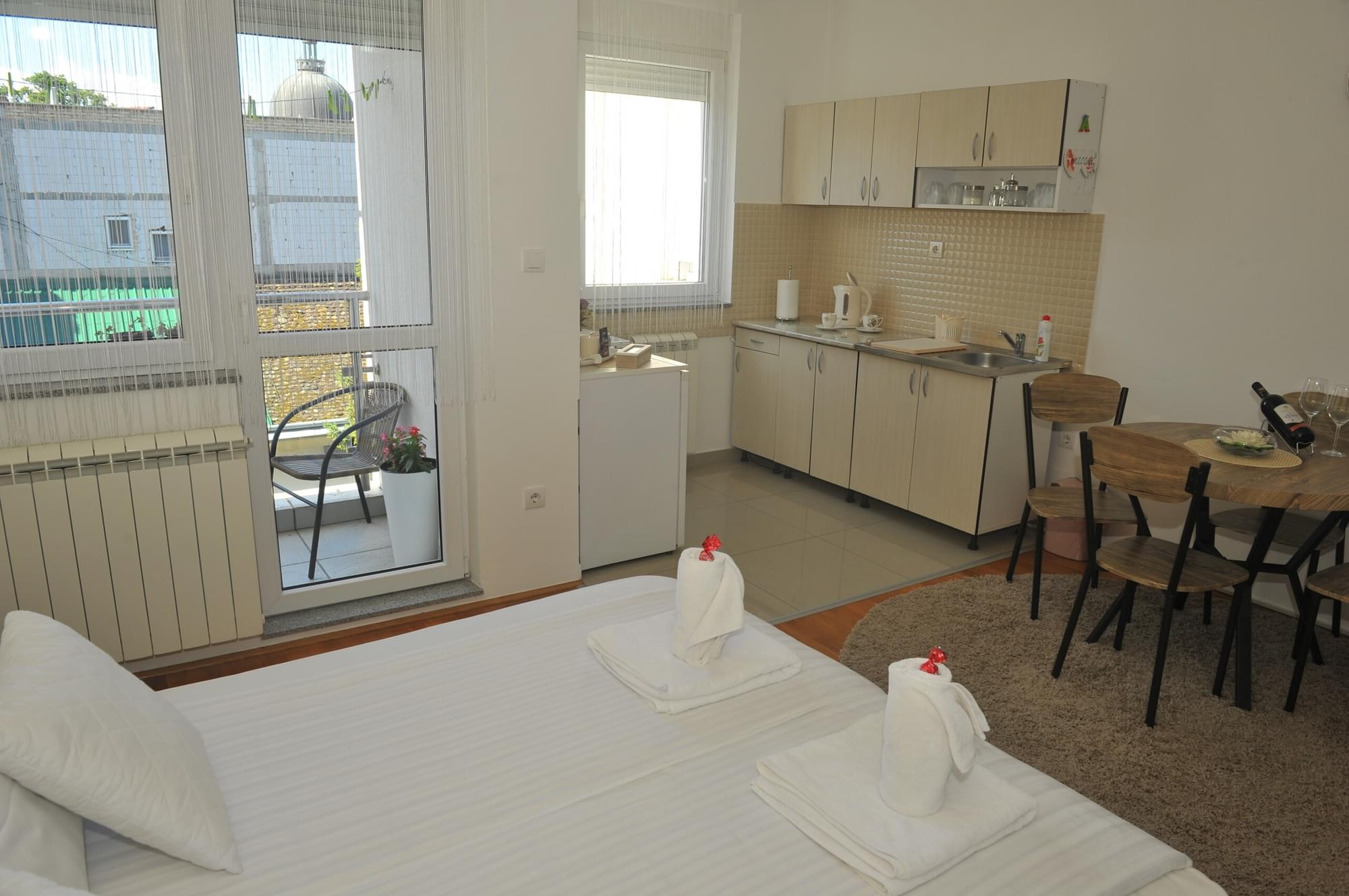 Izuzetno čist, lepo opremljen apartman u centru grada. Ima kompletno opremljenu kuhinju, izuzetno udoban bračni ležaj, kupatilo, fen, peglu, klimu, tv, wi-fi, terasu. Nalazi se u novijoj zgradi na drugom spratu, okrenut prema dvorištu, daleko od gradske buke. Zgrada ima lift pogodan za dečija i invalidska kolica.