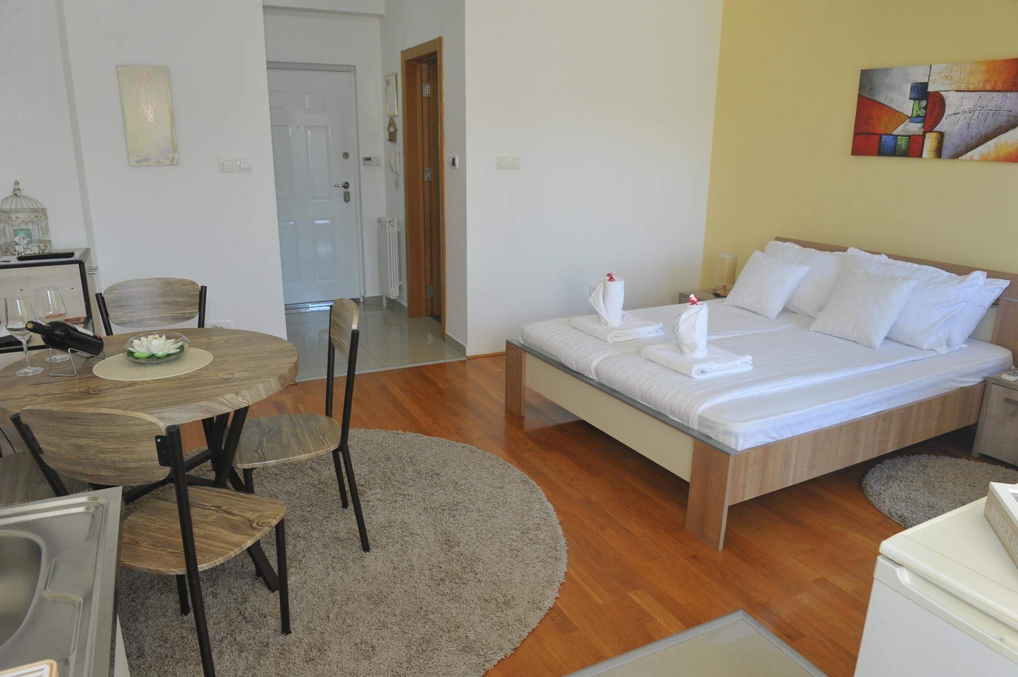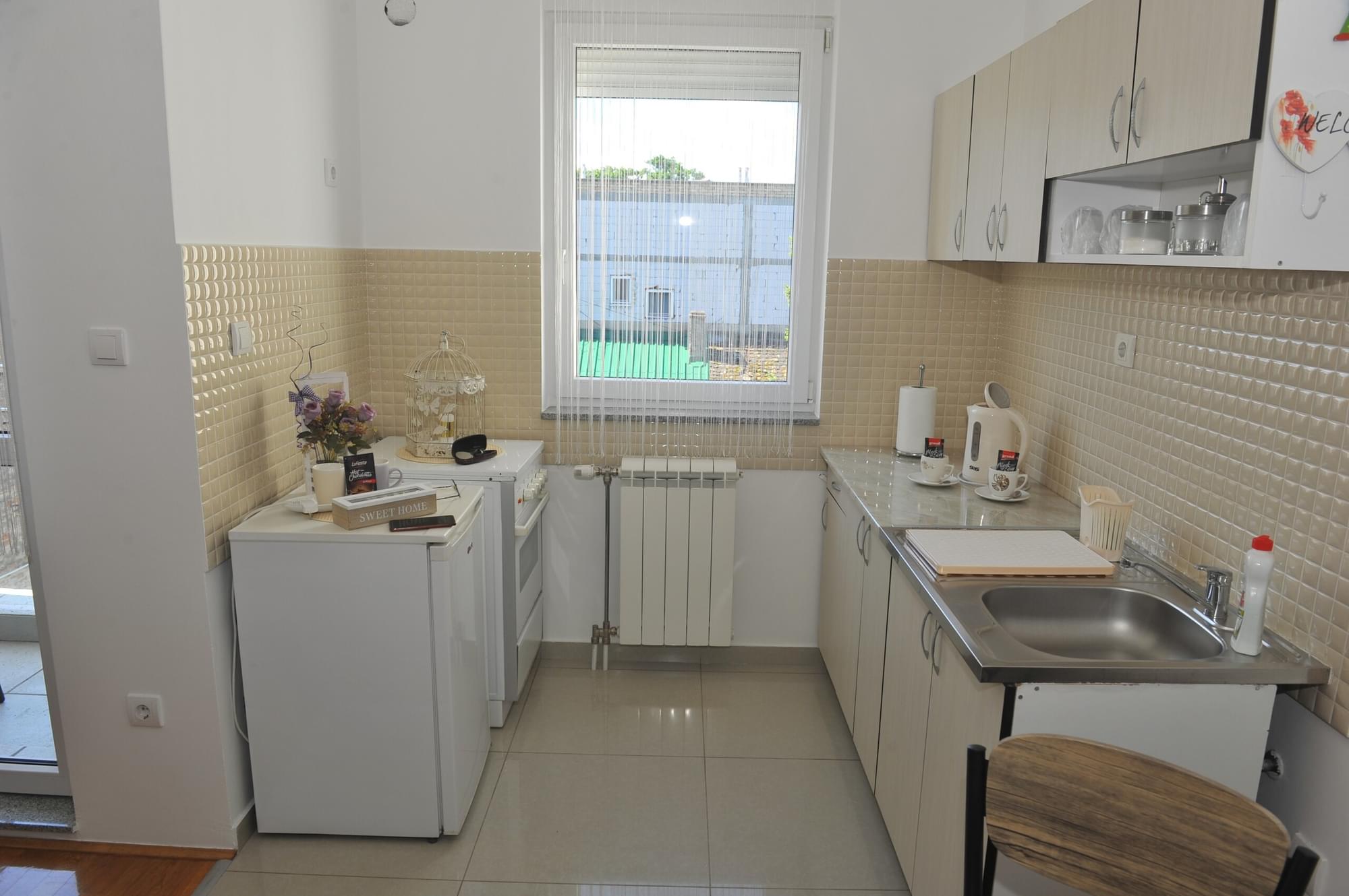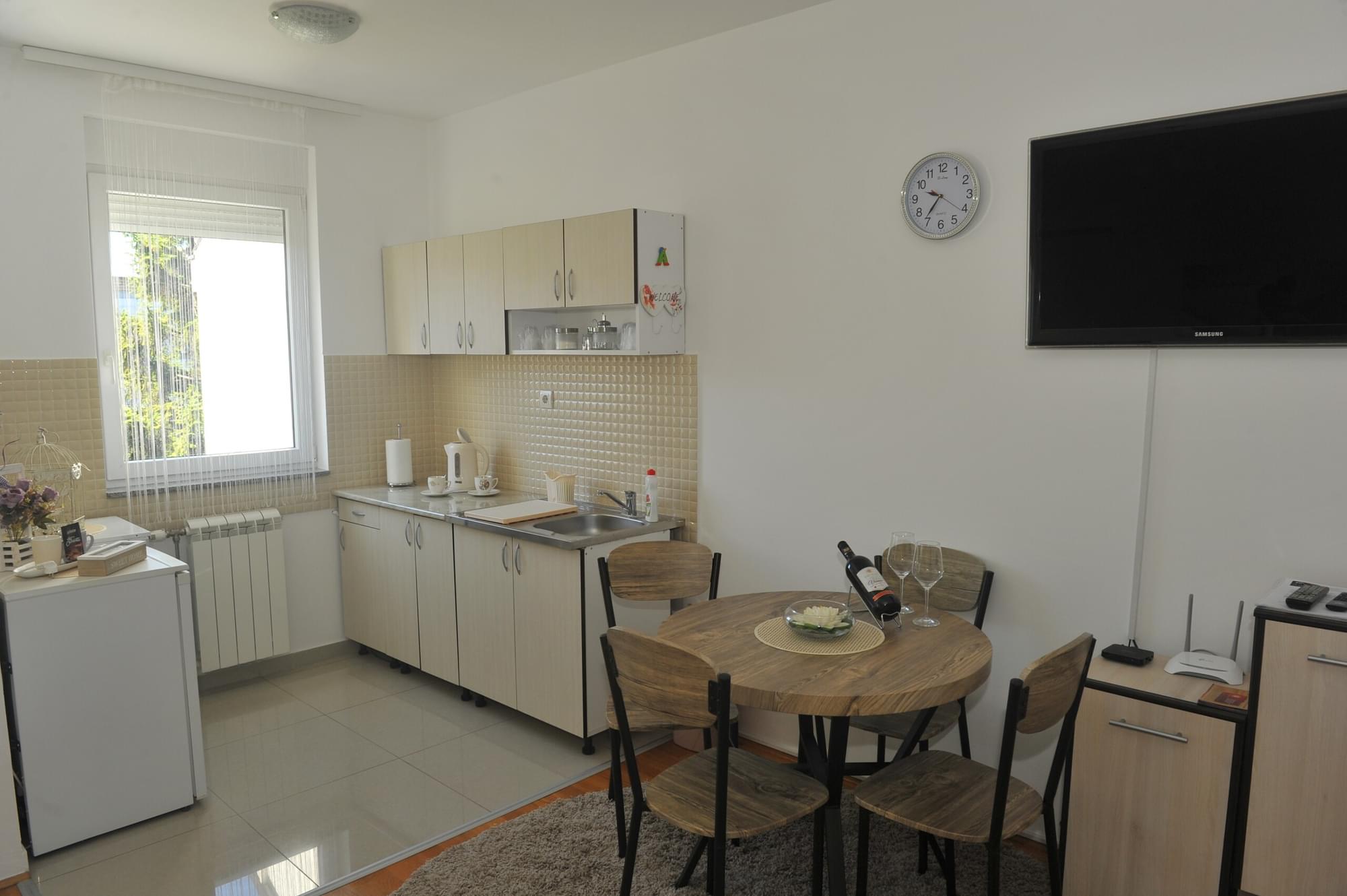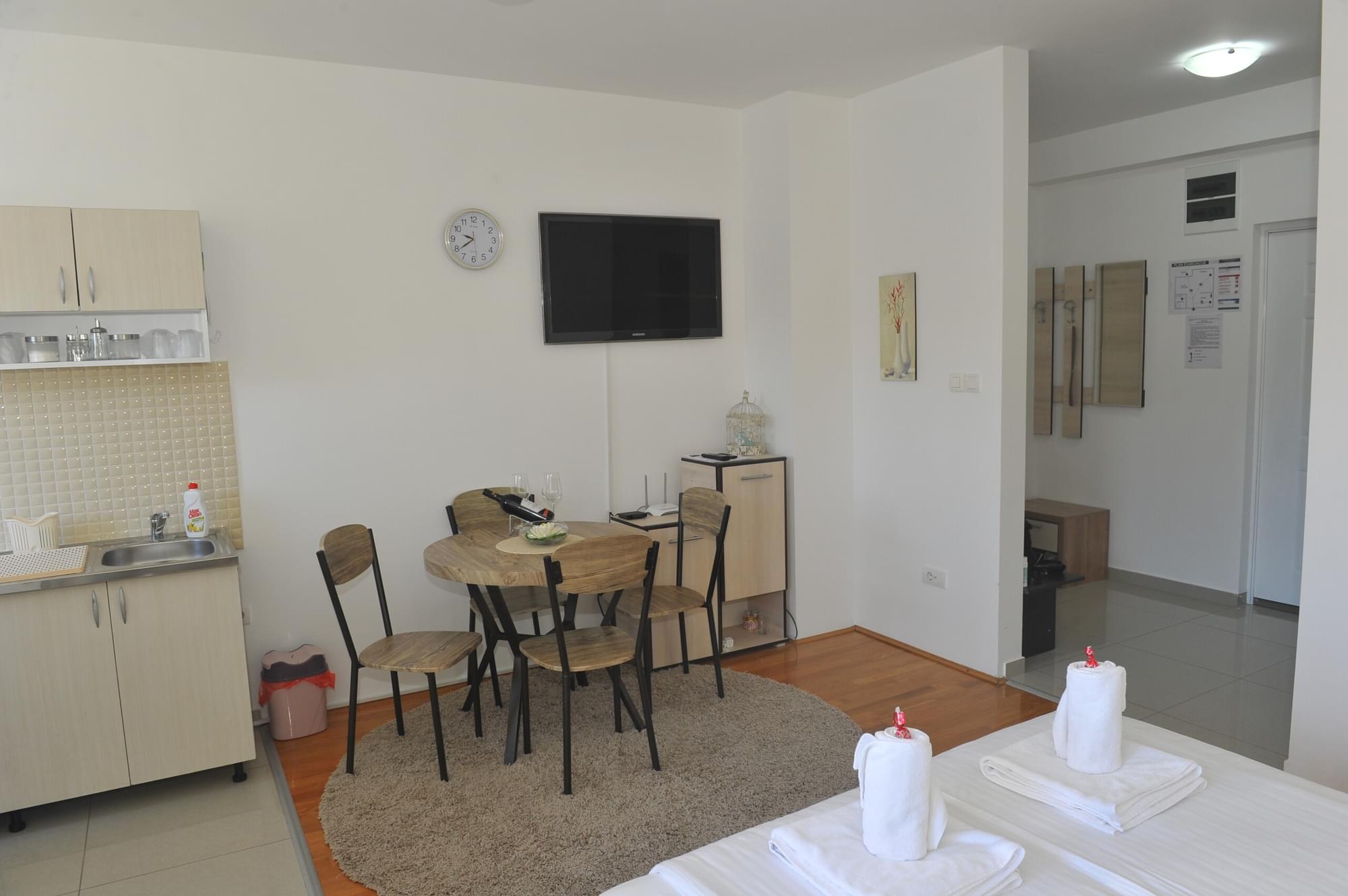 Izuzetno čist, lepo opremljen apartman u centru grada. Ima kompletno opremljenu kuhinju, izuzetno udoban bračni ležaj, kupatilo, fen, peglu, klimu, tv, wi-fi, terasu. Nalazi se u novijoj zgradi na drugom spratu, okrenut prema dvorištu, daleko od gradske buke. Zgrada ima lift pogodan za dečija i invalidska kolica.