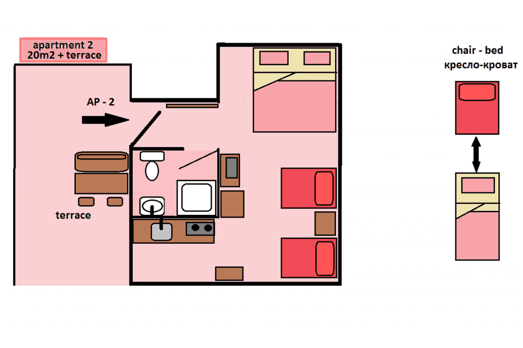 Апартман 2 (20 м2 + тераса /лођа 8м2) је студио апартман у приземљу. Има мали ходник, купатило, собу (француски лежај и две фотеље на развлачење) и кухињу. У кухињи мини шпорет, фрижидер, ел. чајник, посуђе. Апартман је климатизован, има ТВ, ДВД и Ви-Фи. Апартман 2 може да прими од 2 до 4 особе. Погодан за парове без деце и са веома мањом децом.