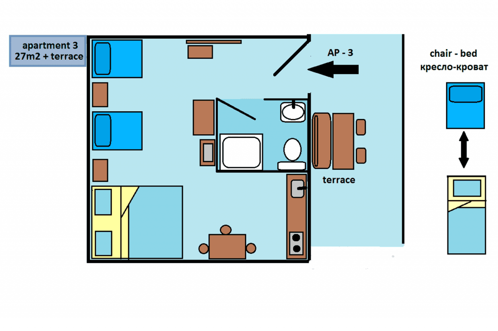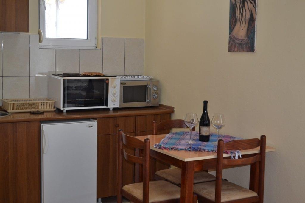 Apartman 3 (27 m2 + terasa 12 m2 s pogledom na more, grad, planine i dvorište) je studio apartman u prizemlju. Ima mali hodnik, kupatilo, sobu (francuski ležaj i dvije fotelje na razvlačenje) i kuhinju. U kuhinji mini šporet, frižider, el. čajnik, posuđe. Apartman je klimatizovan, ima TV, DVD i Wi-Fi. Apartman 3 može da primi od 2 do 4 osobe.Pogodan za parove bez i sa manjom djecom.