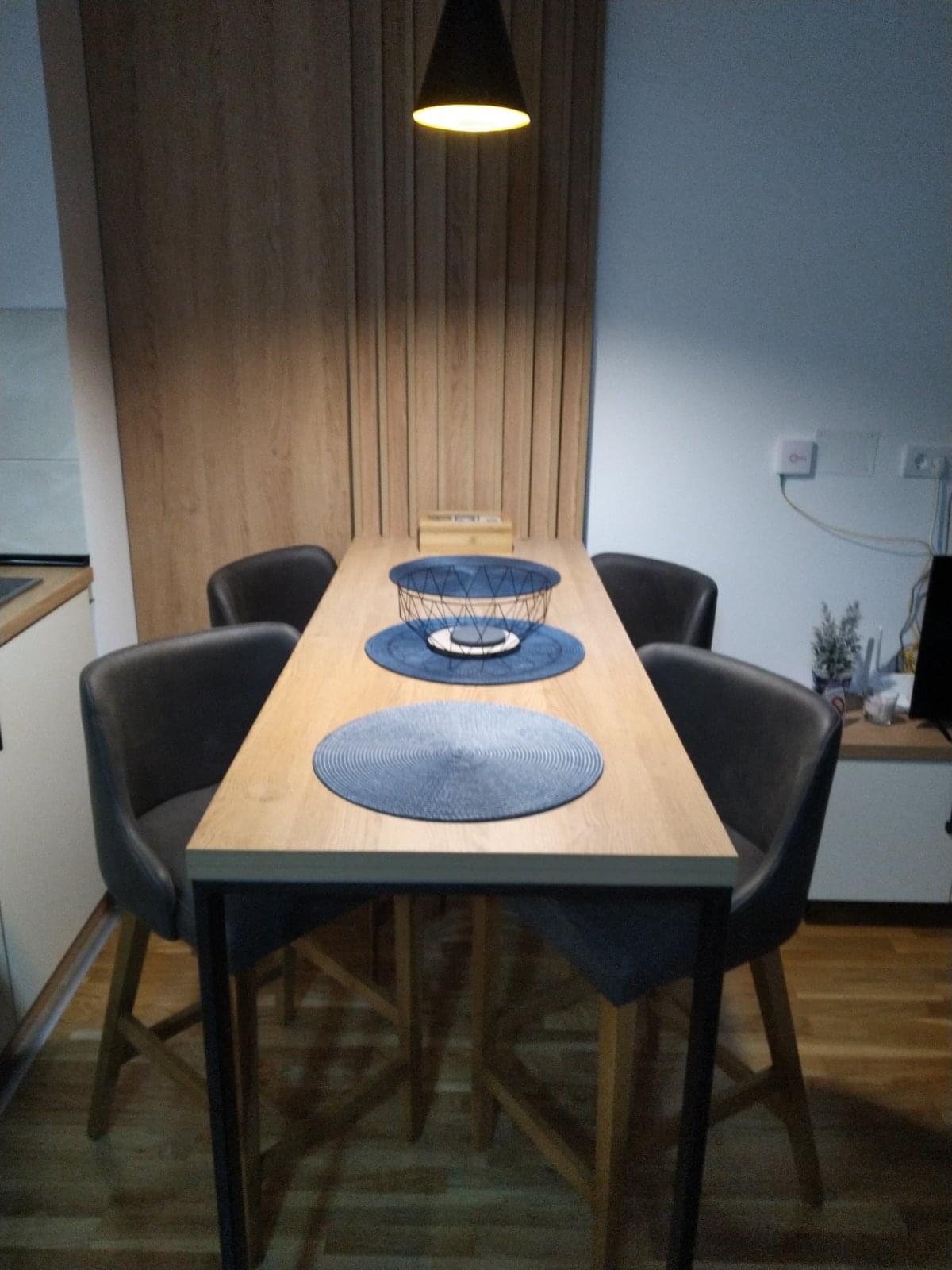 Po strukturi je jednosoban stan, veličine 37m2, pogodan je za udoban boravak do 4 osobe. Poseduje odvojenu sobu sa komfornim bračnim krevetom, dnevni boravak sa garniturom na rasklapanje za dve osobe, kompletno opremljenu kuhinju sa indukcionom pločom, rernom, frižiderom, tuš kabinom i fenom za kosu. Iz dnevnog boravka izlazi na prostranu terasu sa garniturom za sedenje. Od dodatnih pogodnosti, gostima su na raspolaganju Wi-Fi, kablovski kanali, flat screen TV, norveški radijatori, kao i čisti peškiri i posteljina.