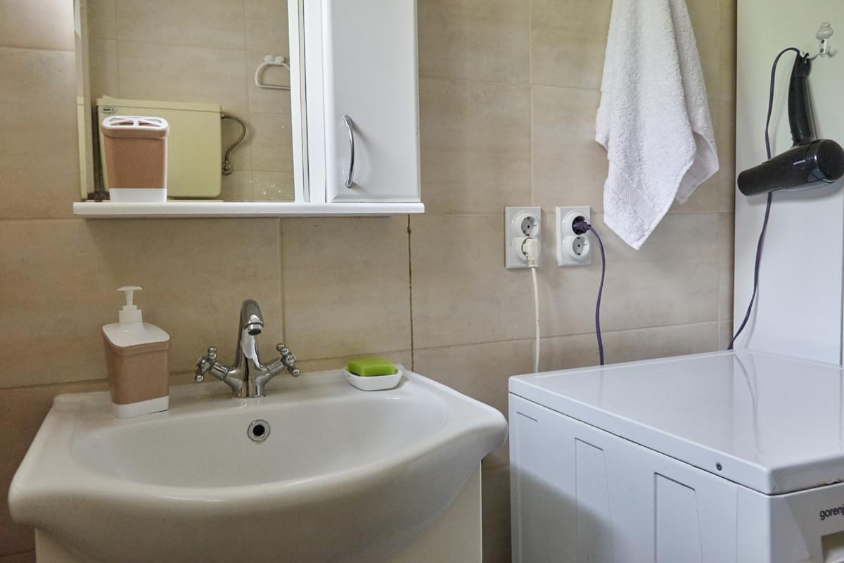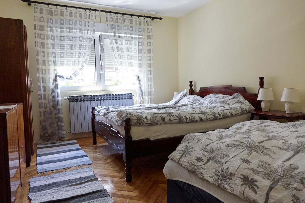 The“ Meri“ apartment has two separate rooms and a dining room with kitchen: the bedroom has a double bed with space for an additional bed, and the living room has two sofa beds. Completely separated dining room features a fully equipped kitchen, and there is a private bathroom with shower. The apartment is equipped with: TV, wi-fi connection, air conditioning, central heating, intercom, towels, linens, cookware and dishes for preparing and eating meals, microwave oven, washing machine, hairdryer. A cosy, functional and clean apartment, with a spacious and pleasant balcony, renovated in spring 2017. Free parking space for 2-3 cars. The apartment has the possibility to accommodate 3-5 people.
