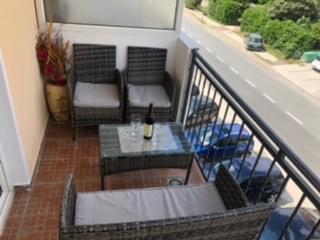 Apartman posjeduje dnevni boravak sa kuhinjom i dvije odvojene spavaće sobe, iz svih prostorija ima izlazak na prostrani balkon sa kojeg se pruža fantastičan pogled na more, planine i na parking, koji je, takođe, besplatan. Pogodan je za boravak do pet osoba.