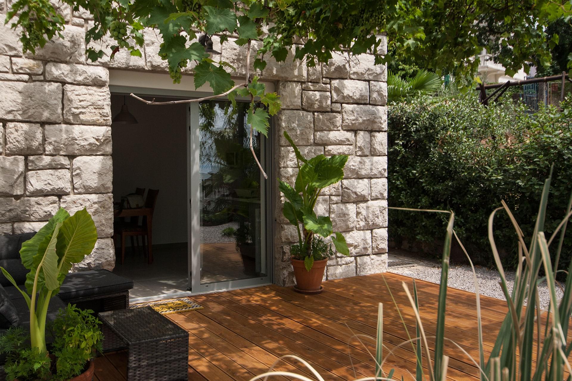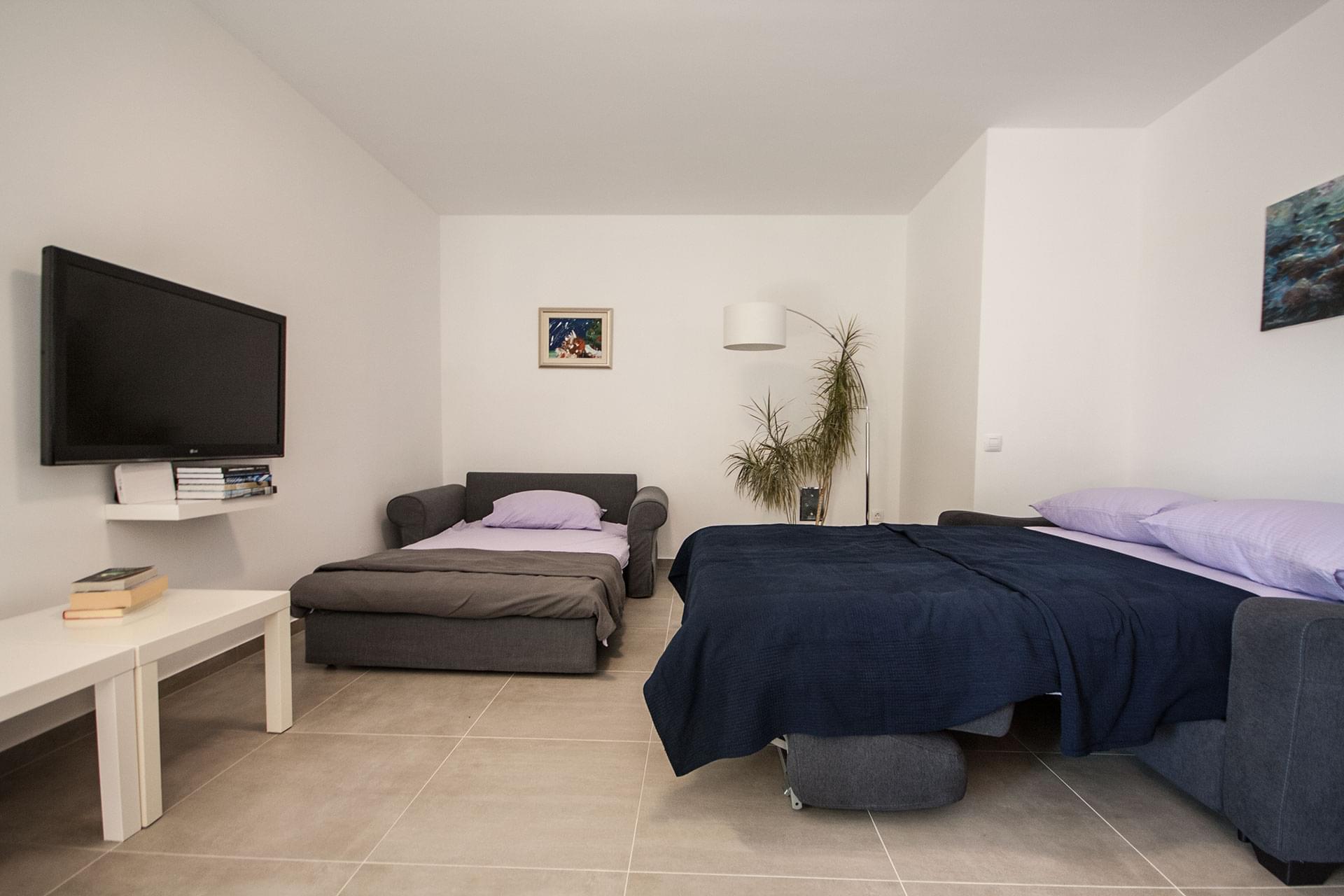 Jednosoban apartman s dnevnim boravkom opremljen s bračnim krevetom i 2 pomoćna kreveta (2+3) kupaonicom (ručnici uključeni), WiFi, TV grijanjem. Za ugodan boravak gosti na raspolaganju imaju uređeno dvorište od 250m2 s roštiljem