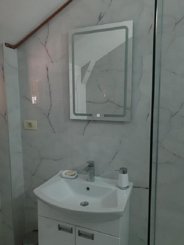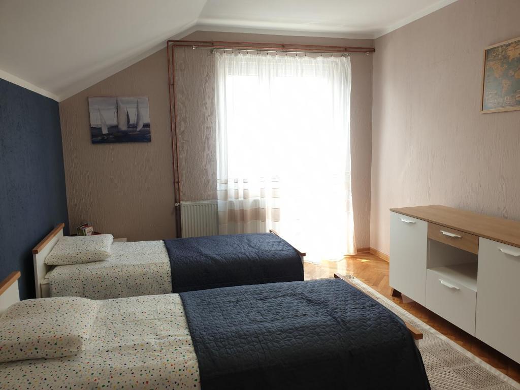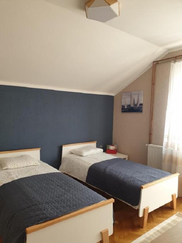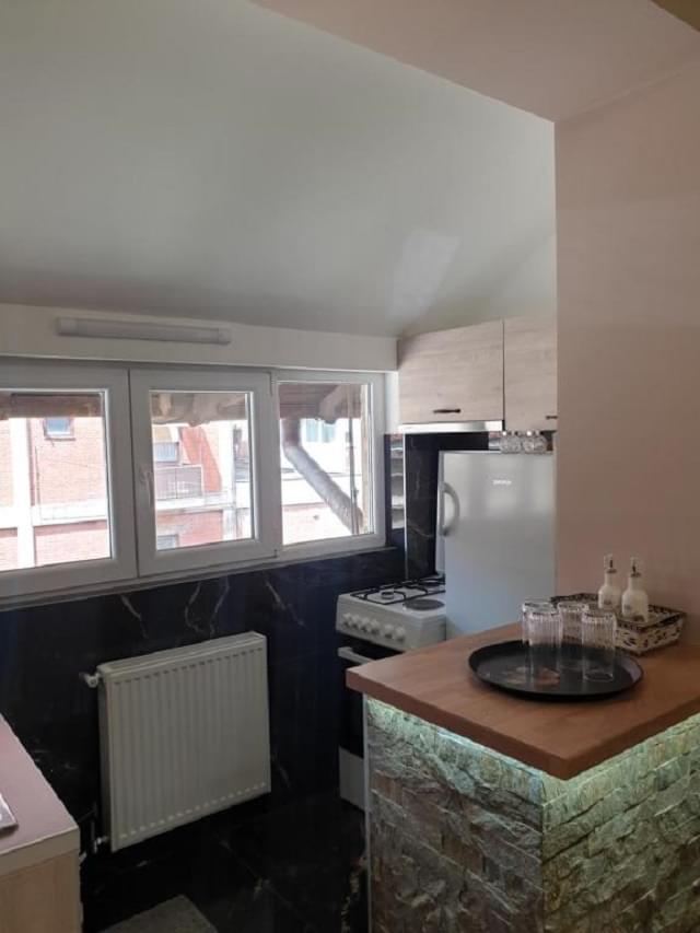 U neposrednoj blizini nalaze se apoteke, marketi, pekare, restorani, klubovi, bioskop, butici …. do pijace se stiže za 5 minuta laganog hoda, isto toliko je potrebno i do autobuske stanice. Izuzetno prostran, ovaj apartman od 70 m2 poseduje dve komforne spavaće sobe (u jednoj se nalaze dva singl kreveta, dok je u drugoj francuski ležaj), dnevnu sobu sa trpezarijom, kuhinju, kupatilo i veliku terasu. Opremljen je novim nameštajem i belom tehnikom, poseduje centralno grejanje, kao i klima uređaj. U dnevnoj sobi je TV sa kablovskim kanalima, kao i besplatan WI-FI. Peškiri i posteljina se menjaju na 4 dana. Namenjen je za 4 osobe.