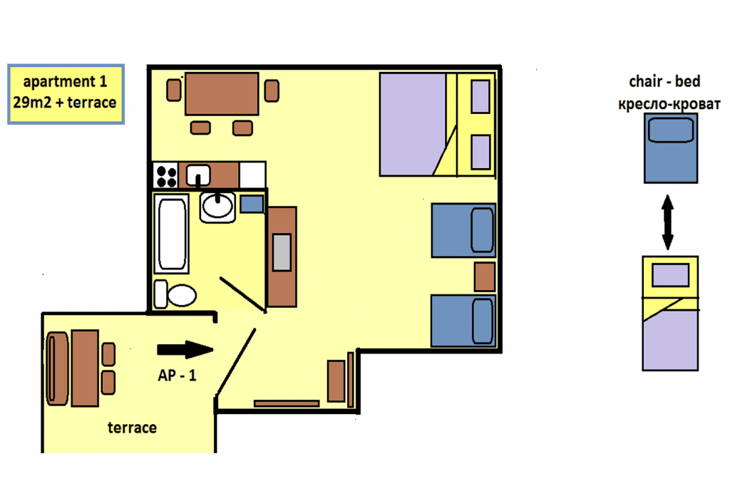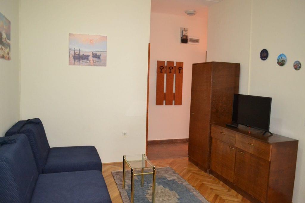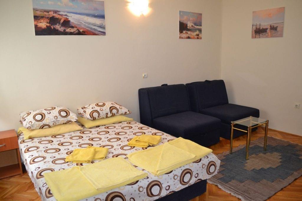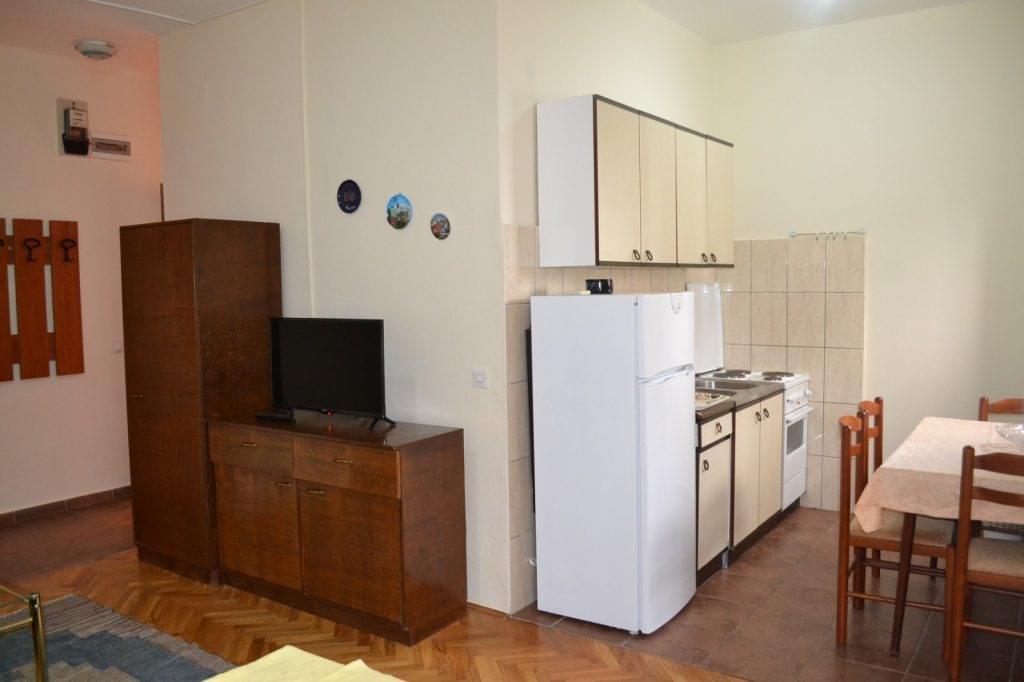 Апартман 1 (29 м2 тераса/лођа 8м2) је студио апартман у приземљу. Има мали ходник, купатило, собу (француски лежај и две фотеље на развлачење ) и кухињу. У кухињи мини шпорет, фрижидер, ел. чајник, посуђе. Апартман је климатизован, има ТВ, ДВД и Ви-Фи. Апартман 1 може да прими од 2 до 4 особе. Погодан за парове без и са мањoм децом.