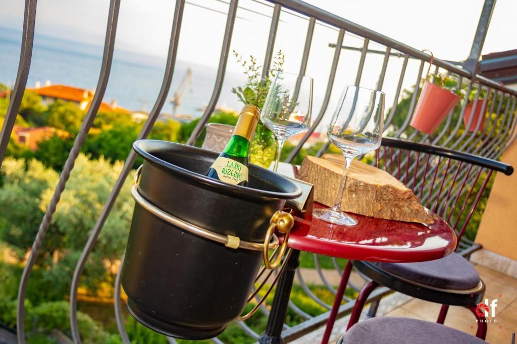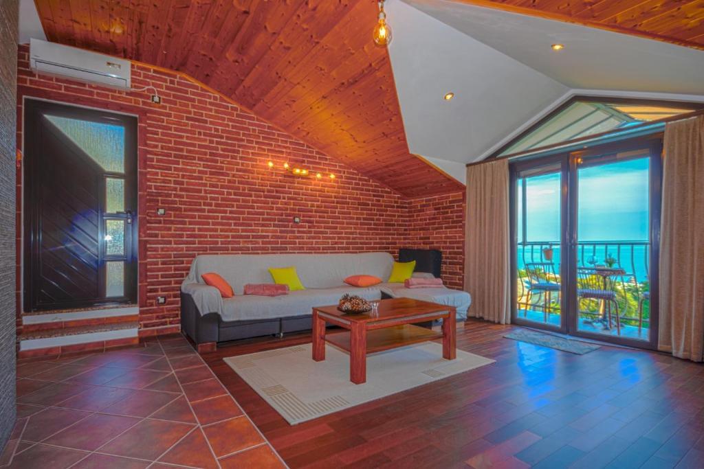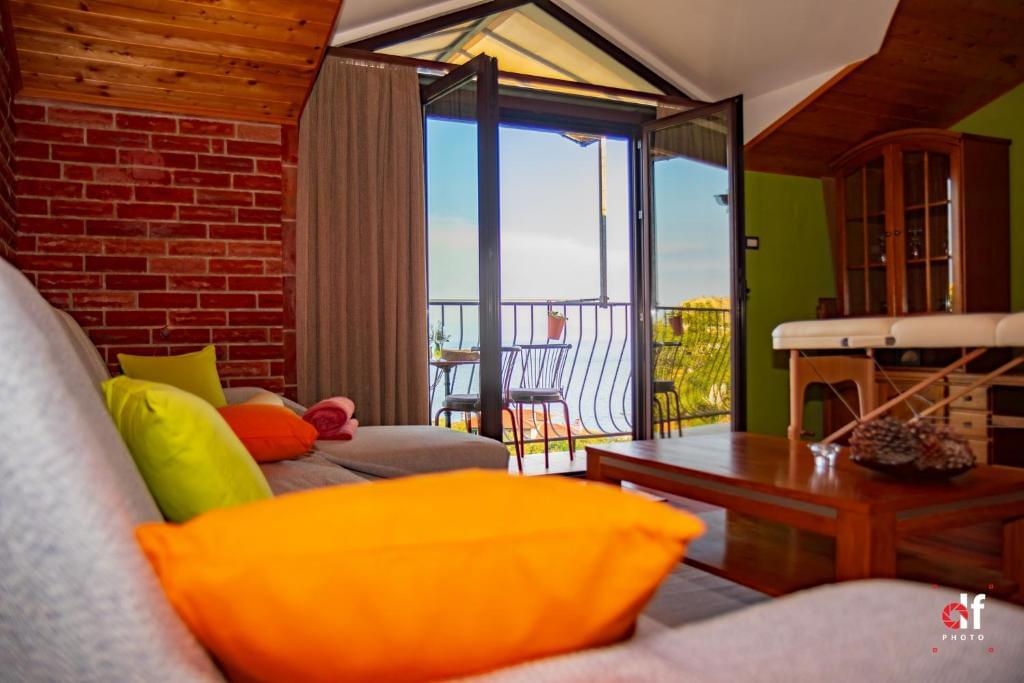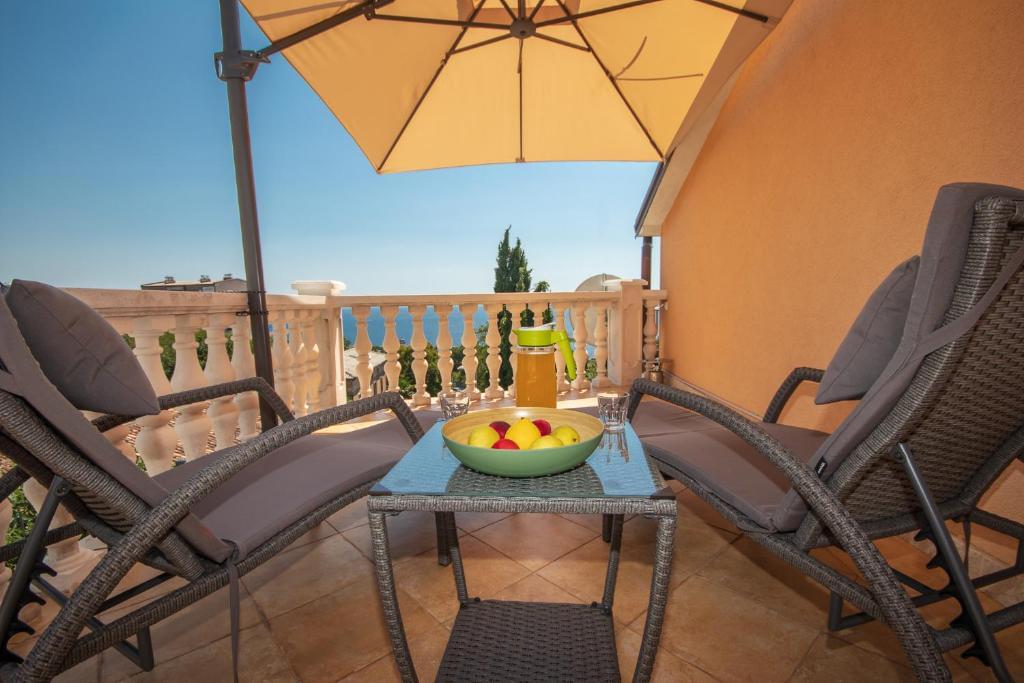 Apartment has 2 separate bedrooms, one is with king size bed, other one is with bed 120x200cm, bathroom, hallway, spacious livingroom with exit to terrace and balcony both with direct sea view, outdoor furniture, sun loungers and parasol, kitchen with all equipment, dining area. Apartment has 83m2, plus terrace (20m2) and balcony (6m2). Apartment has its own free internet – wifi, air condition, additional electric fan in bedroom. Family house is surrounded with big garden, outdoor furniture, grill, private parking.