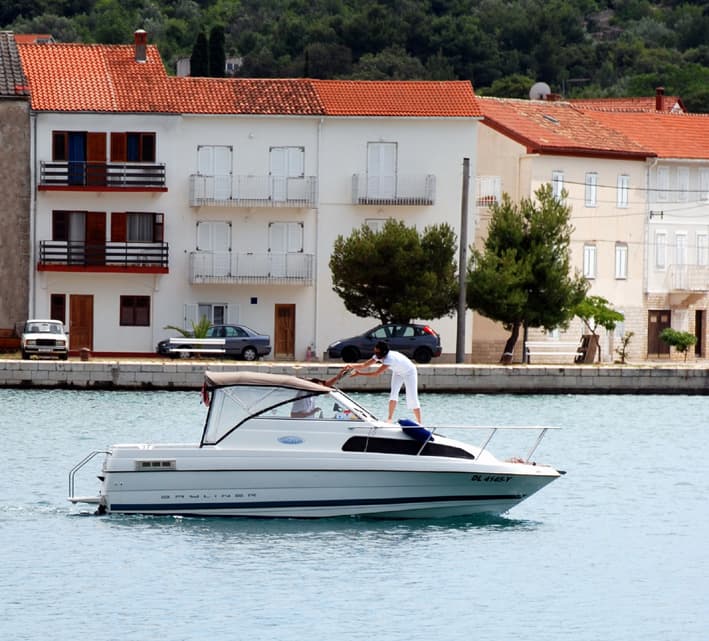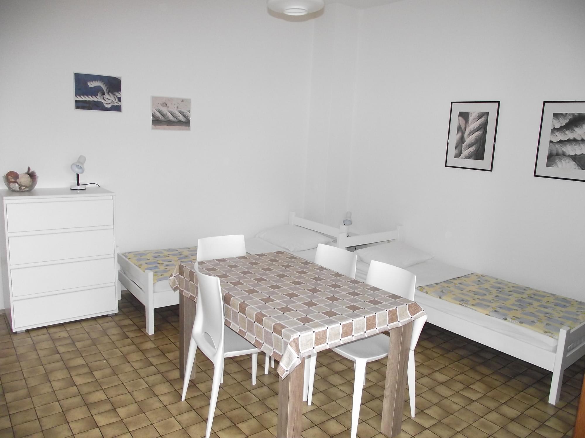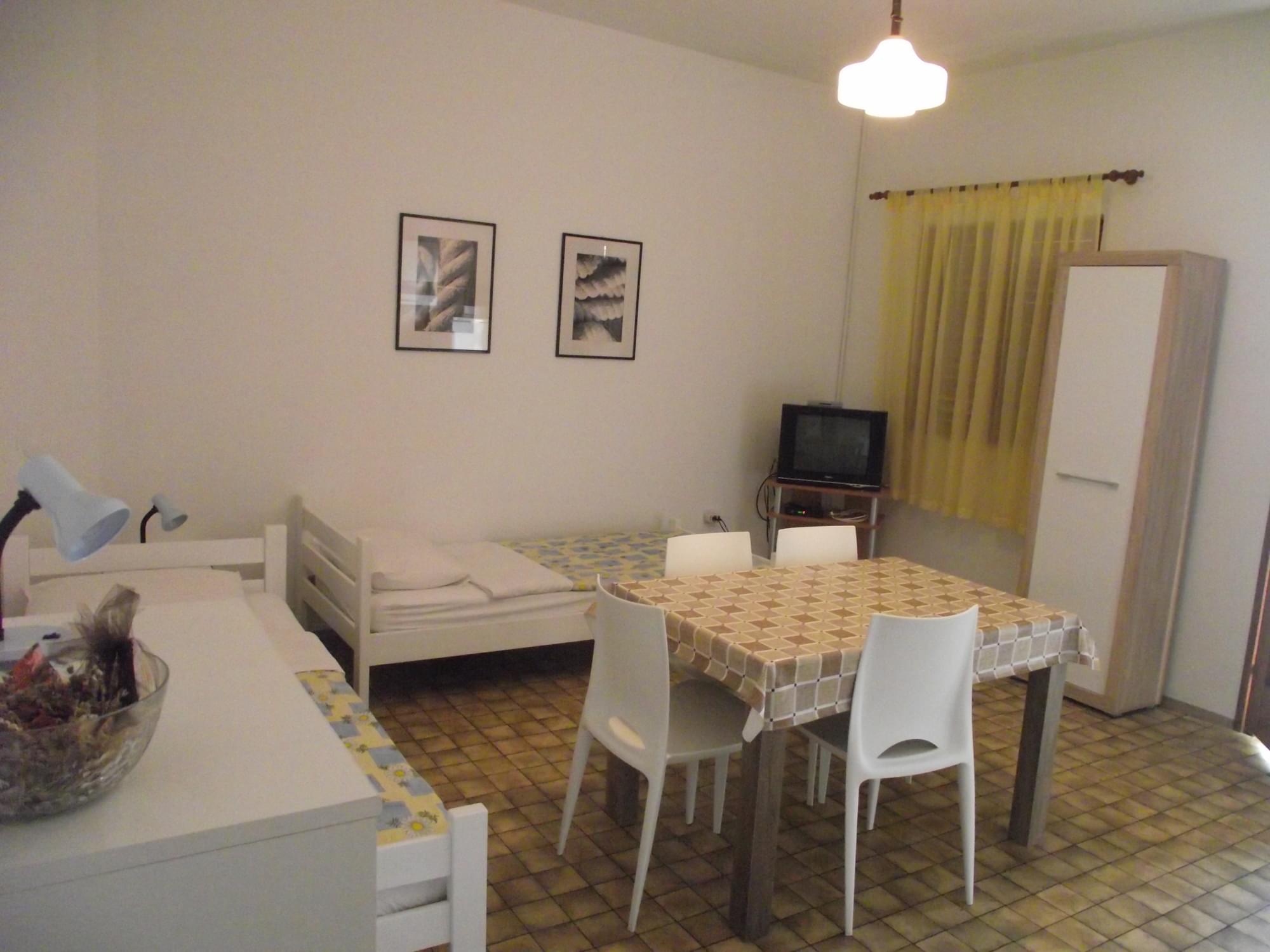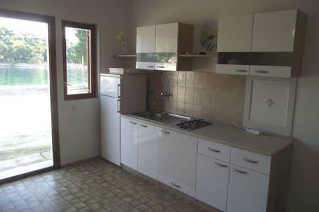 3 apartmana 2+2, svaki je za 2,3, ili osobe. Sastoji se od 1 spavaće sobe cca 14m2 s bračnim krevetom, kuhinje-dnevne sobe u jedno cca 25 m2 sa 2 normalna odvojena kreveta, kupaonioce, balkon s pogledom na more. Udaljenost od mora je 15m, a od najbliže plaže 70 m. CIJENA po dogovoru od 25 – 52 eura ovisno od termina i broja osoba.