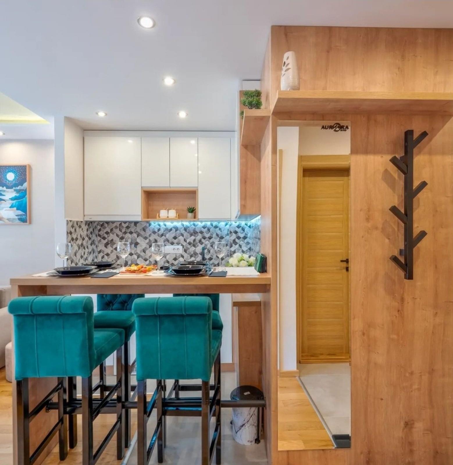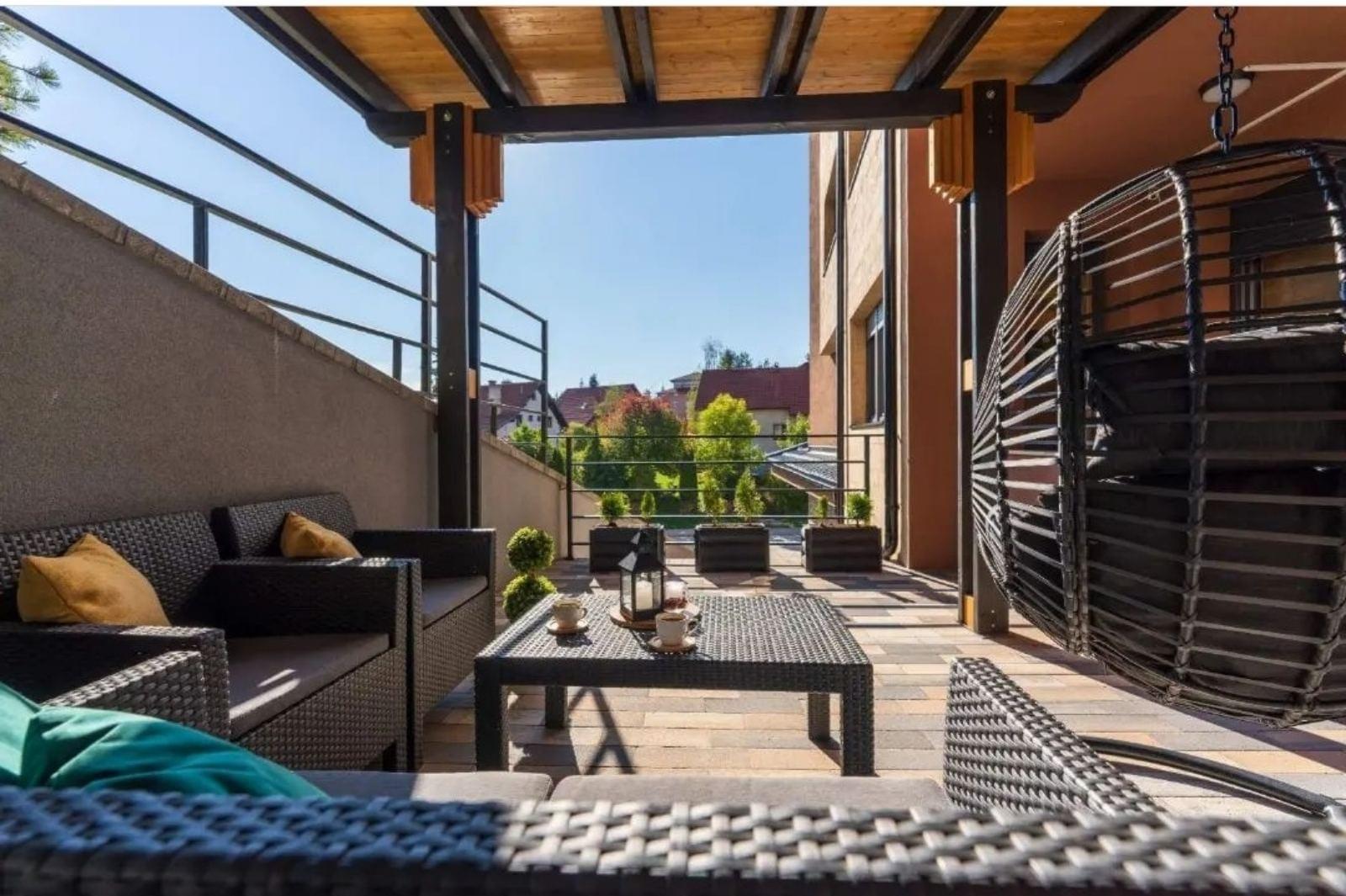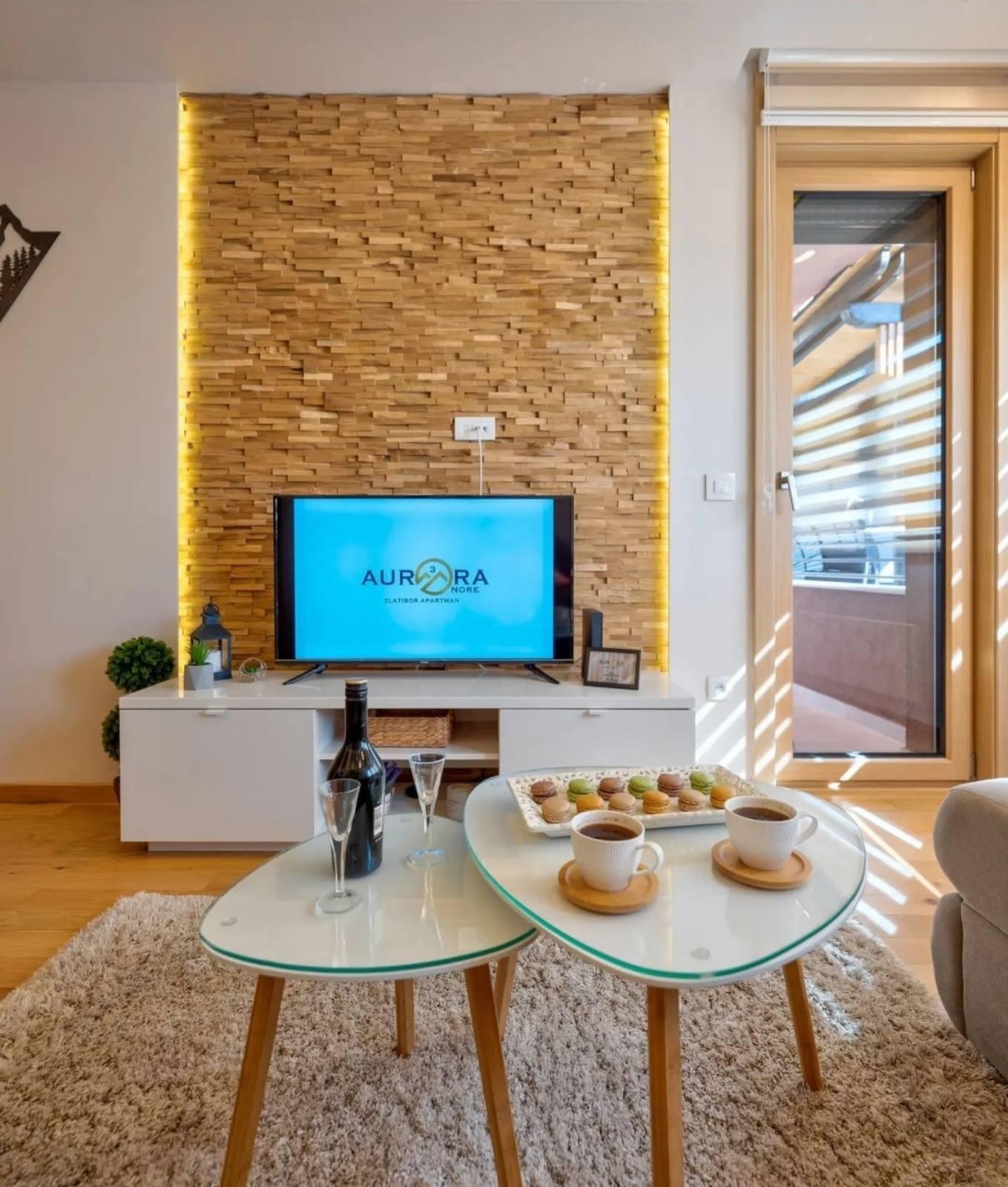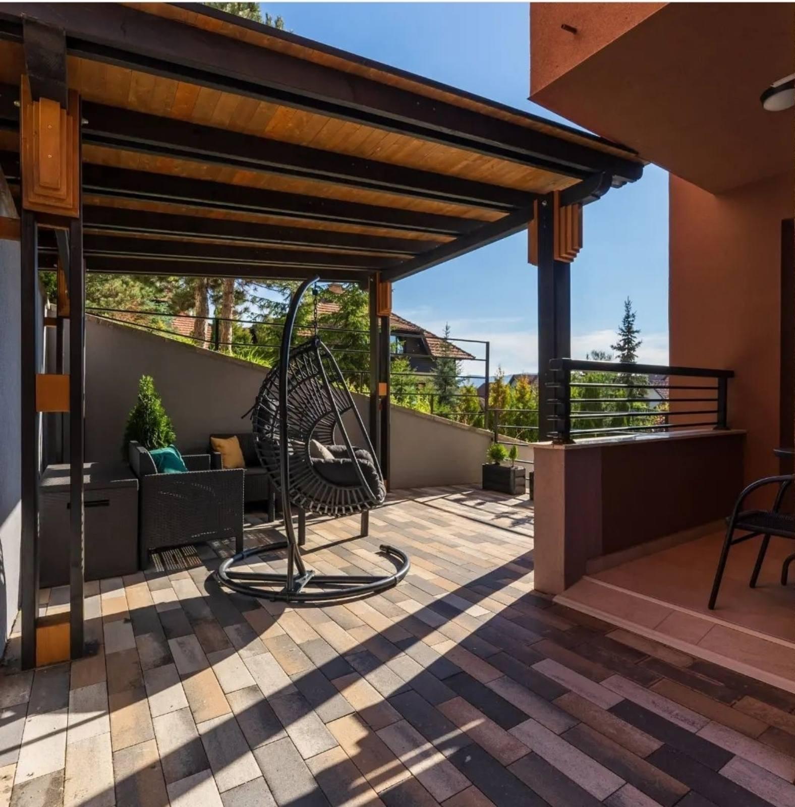 Luks apartman Aurora Onore Zlatibor Površina 36m2 Viogorska ulica Kapacitet 4+1 Apartman Aurora Onore poseduje hodnik, dnevni boravak, odvojenu spavaću sobu, u potpunosti opremljenu kuhinju, kupatilo i jedinstvenu terasu od preko 20m2 sa pergolom. i kompletom od ratana za sjedenje i ljuljaškom za kompletan ugođaj.