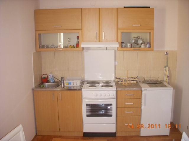 Prizemlje apartmana sadrži dnevni boravak sa kompletno opremljenom kuhinjom i sto za ručavanje za 6 osoba, frižider, električni šporet.