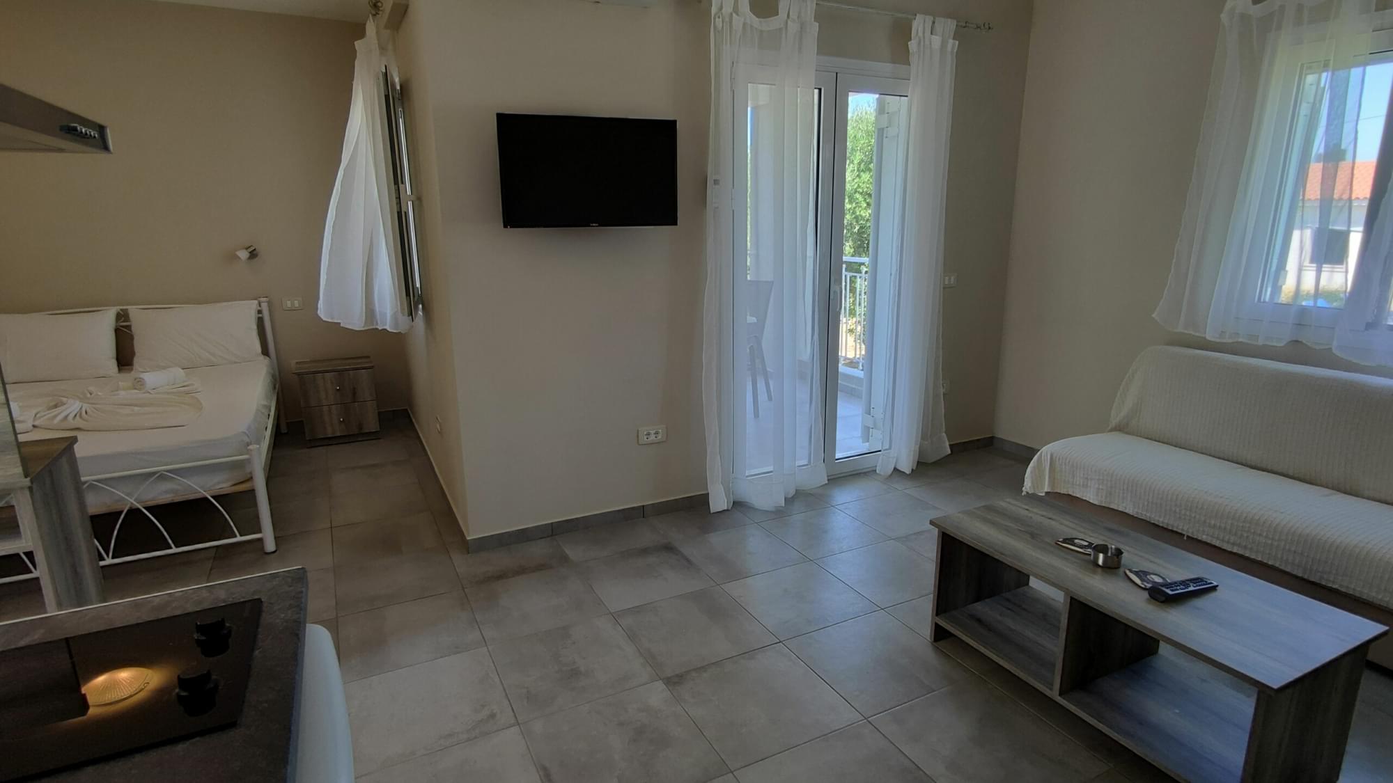 Superior Studio is an open plan apartment, has a double bed and a living room with a sofa that it can convert to bed and a rollaway bed if needed and can accommodate 4 persons. It also offers a small kitchen with hot plates, fridge, a bathroom with shower, air conditioning, TV, safe and free WiFi.