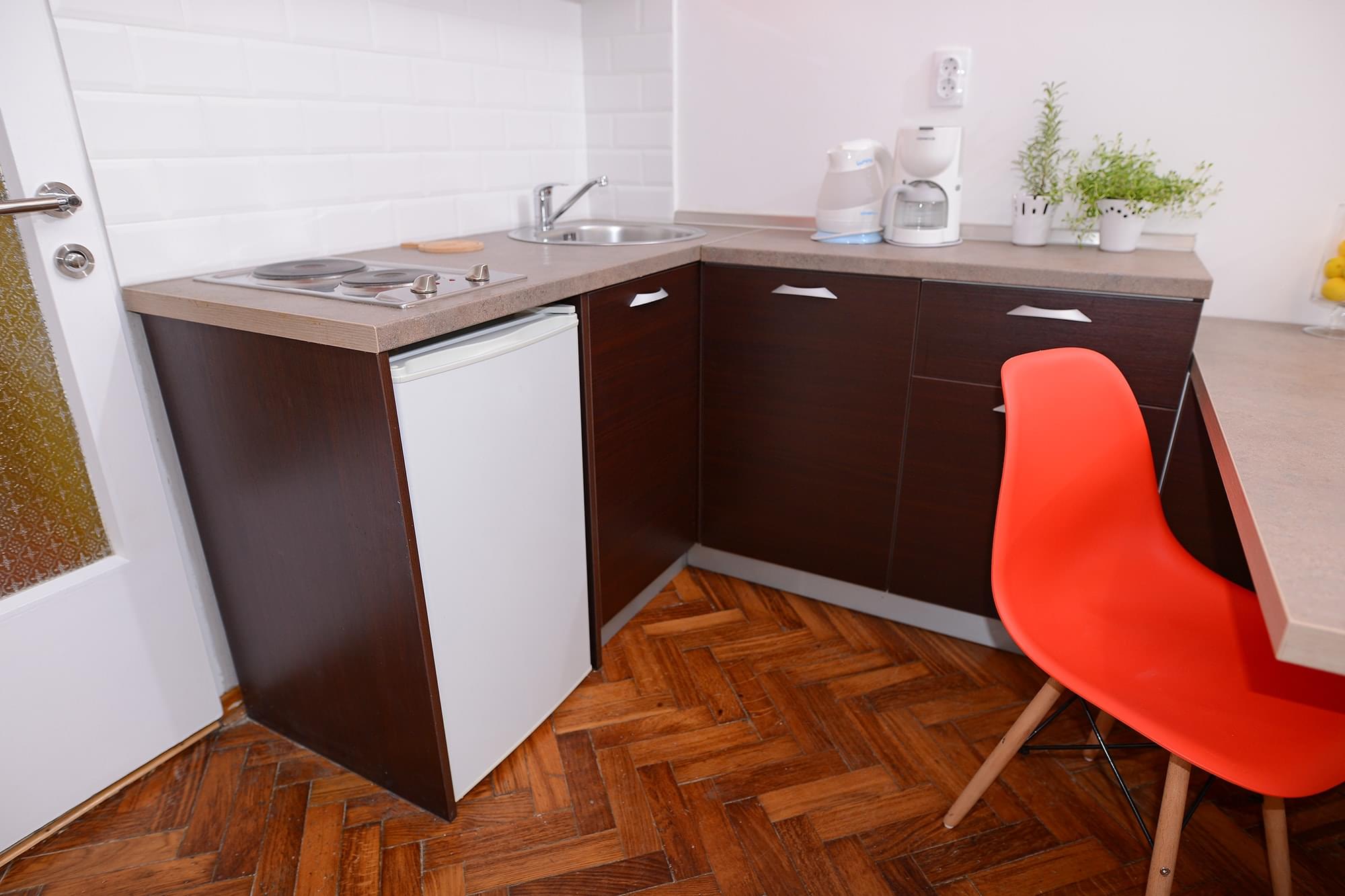 U donjem nivou su dva singl kreveta koji se po potrebi mogu spojiti u bračni krevet 180×200. Udobno se mogu smestiti 4 osobe. Kuhinja je potpuno opremljena sa delom za sedenje i obedovanje. Apartman je klimatizovan, ima LCD TV, besplatan WI-FI.