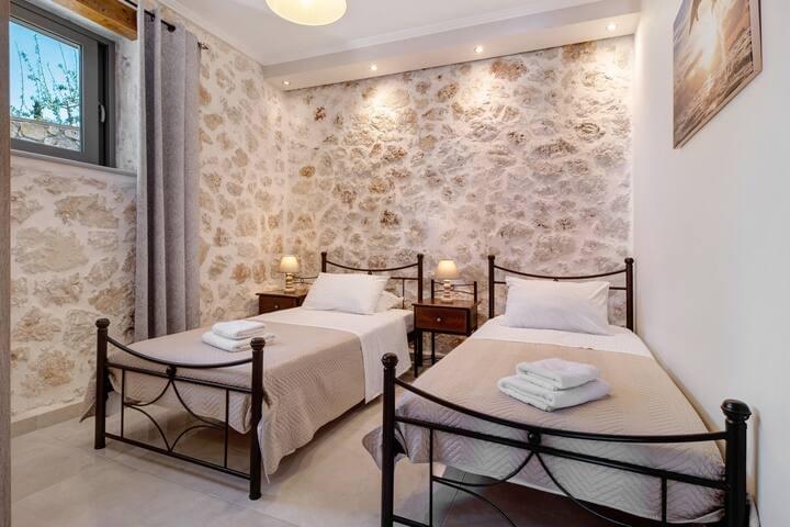 Continuing down the hallway you will find yourself in the bedrooms. On the left the comfortable bedroom with a double bed and a private bathroom with a shower, while on the right the bedroom with twin beds.