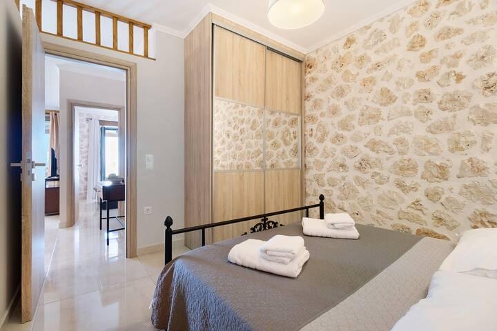 Continuing down the hallway you will find yourself in the bedrooms. On the left the comfortable bedroom with a double bed and a private bathroom with a shower, while on the right the bedroom with twin beds.