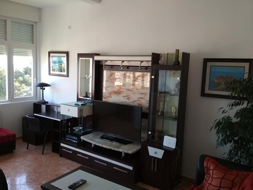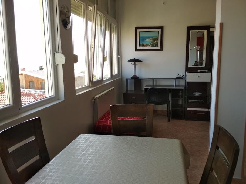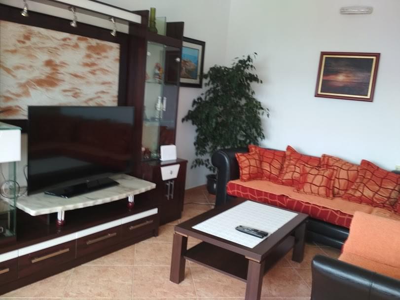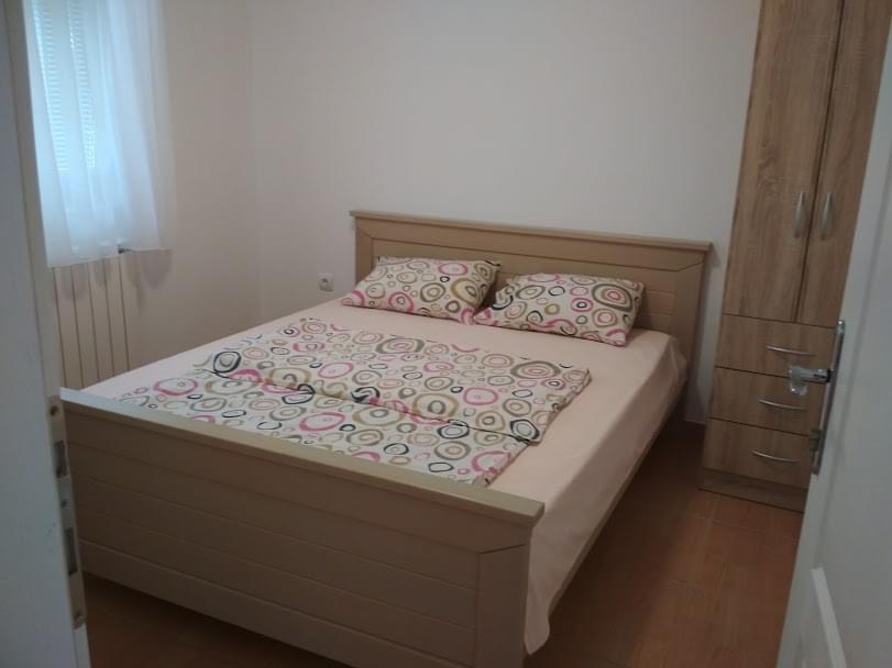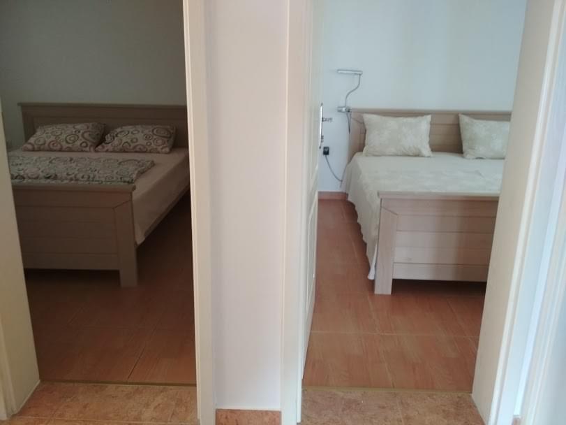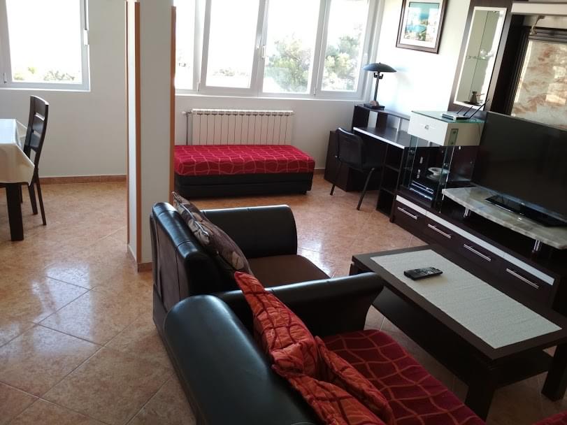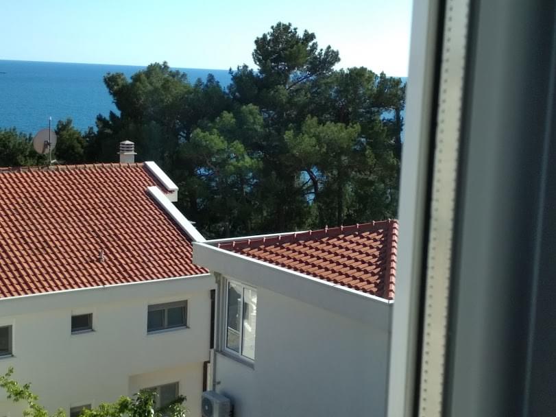 Апартман са погледом на море и град се налази на другом спрату виле удаљене 300м од плаже. Апартман је потпуно опремљен за удобан боравак 1-4 особе, има посебан улаз, ходник, дневни боравак, кухињу са трпезаријом, две спаваће собе, купатило. Апартман нема свој посебан балкон, али има целу предњу страну у стаклу -прозор- онда се види цео град, реон и море. Има терасу у дворишту. У дворишту је роштиљ и тераса са столовима. Поред куће је обезбеђен бесплатан паркинг. На путу до плаже и дуж плаже има много кафића, ресторана и маркета тако да се лако и удобно организују. Недалеко од куће иу пјешачкој доступности је неколико плажа, Жукотрлица, Тополица, Црвена плажа и Мала нудистичка плажа. Такође су недалеко и распоређени од 1-3км су центар града, пијаца, аутобуска и железничка станица. Аутобуско стајалиште за градски и међуградски саобраћај је недалеко од куће. Цена смештаја је од 35-80е и зависи од броја особа и сезоне.