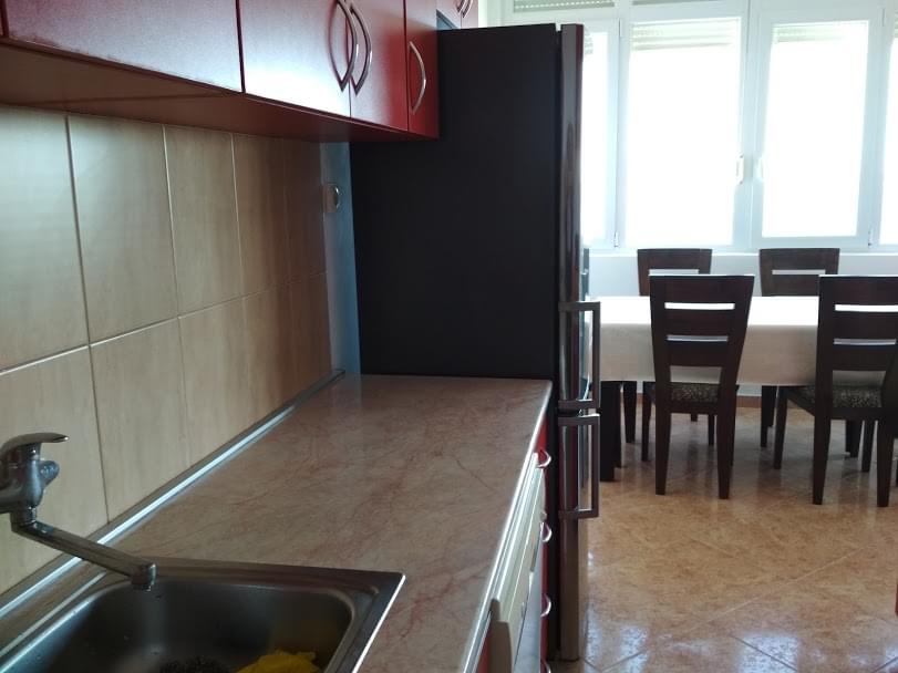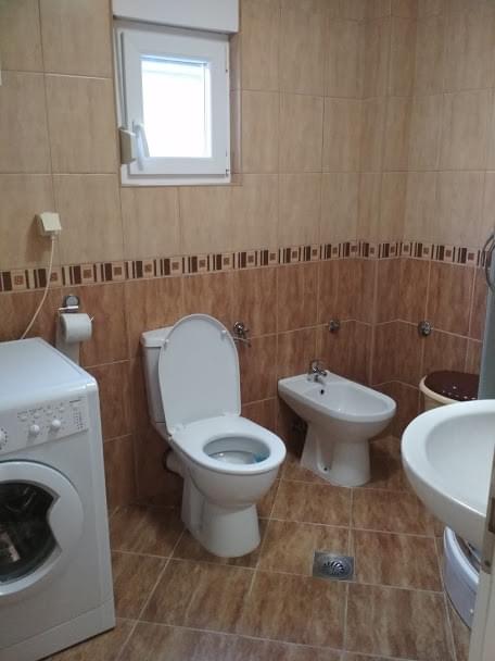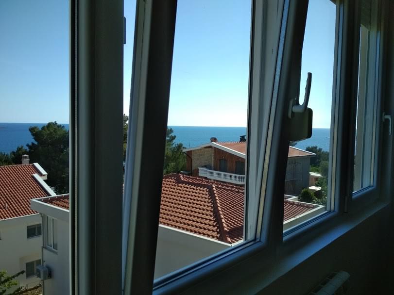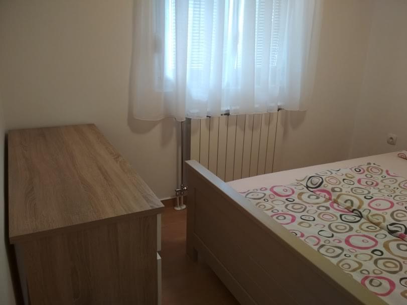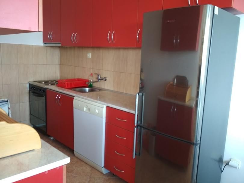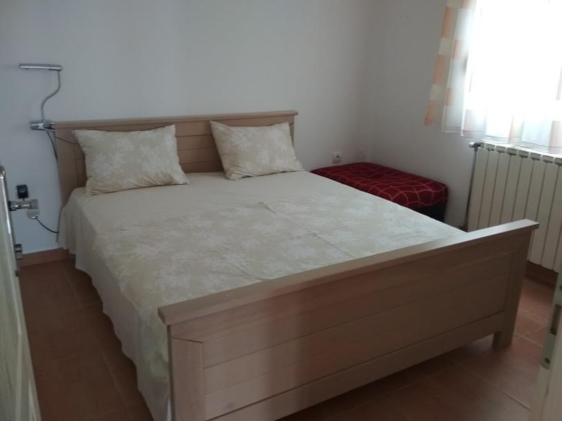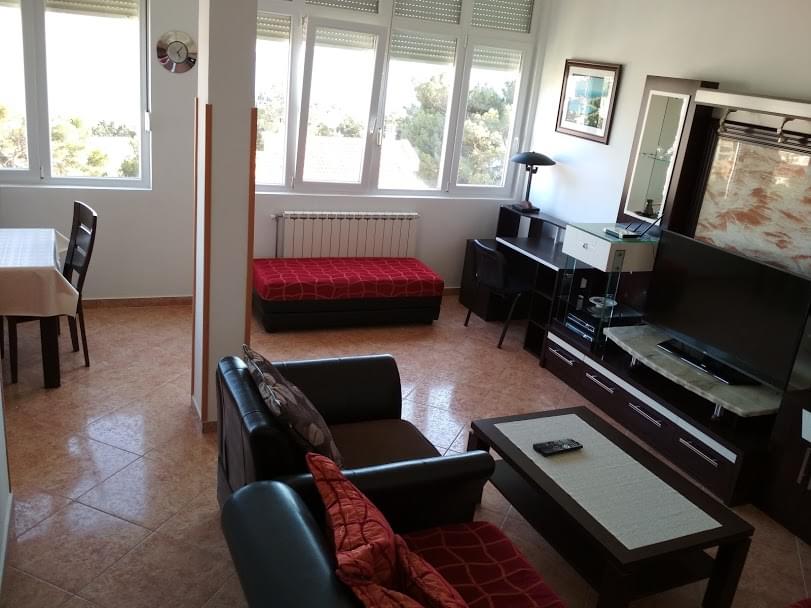 Апартман са погледом на море и град се налази на другом спрату виле удаљене 300м од плаже. Апартман је потпуно опремљен за удобан боравак 1-4 особе, има посебан улаз, ходник, дневни боравак, кухињу са трпезаријом, две спаваће собе, купатило. Апартман нема свој посебан балкон, али има целу предњу страну у стаклу -прозор- онда се види цео град, реон и море. Има терасу у дворишту. У дворишту је роштиљ и тераса са столовима. Поред куће је обезбеђен бесплатан паркинг. На путу до плаже и дуж плаже има много кафића, ресторана и маркета тако да се лако и удобно организују. Недалеко од куће иу пјешачкој доступности је неколико плажа, Жукотрлица, Тополица, Црвена плажа и Мала нудистичка плажа. Такође су недалеко и распоређени од 1-3км су центар града, пијаца, аутобуска и железничка станица. Аутобуско стајалиште за градски и међуградски саобраћај је недалеко од куће. Цена смештаја је од 35-80е и зависи од броја особа и сезоне.
