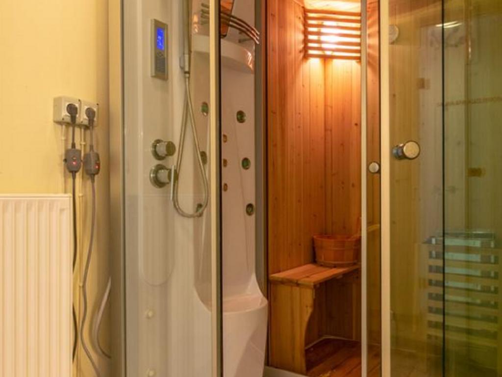 - Sauna for two persons with hydro-massage shower – direct access from downstairs part.