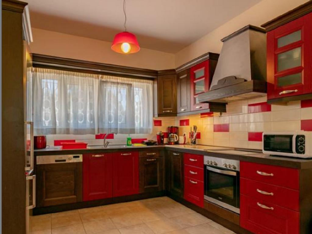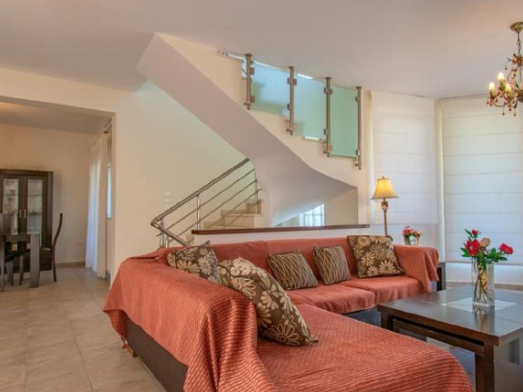 - Consists of two double bedrooms, two WC/showers, kitchenette, refrigerator, washing machine and living-dining area – two entrances (one from upstairs main villa with interior stairs and one external entrance from the big garden). The downstairs part can be also independent from the upstairs part of the villa locking the  door to interior stairs.