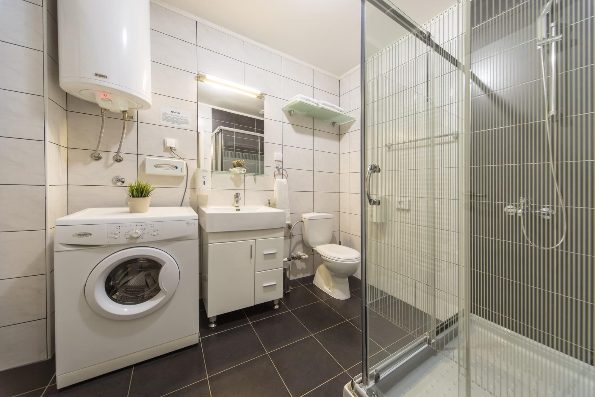 Moderno opremljen studio, površine 43m2 pruža potpuni komfor bez pregradnih zidova. Kapacitet studija je do 4 osobe. Studio sadrzi francuski ležaj, dnevni boravak sa sofom na razvlačenje, LCD TV, trpezarijski sto sa stolicama, kompletno opremljenu kuhinju sa mašinom za sudove, kupatilo sa tuš kabinom, ugradni plakar, klima uređaj, Wi-Fi
