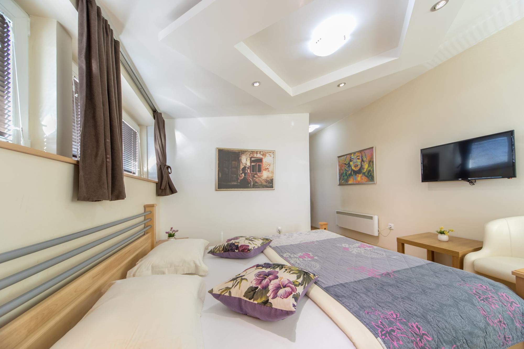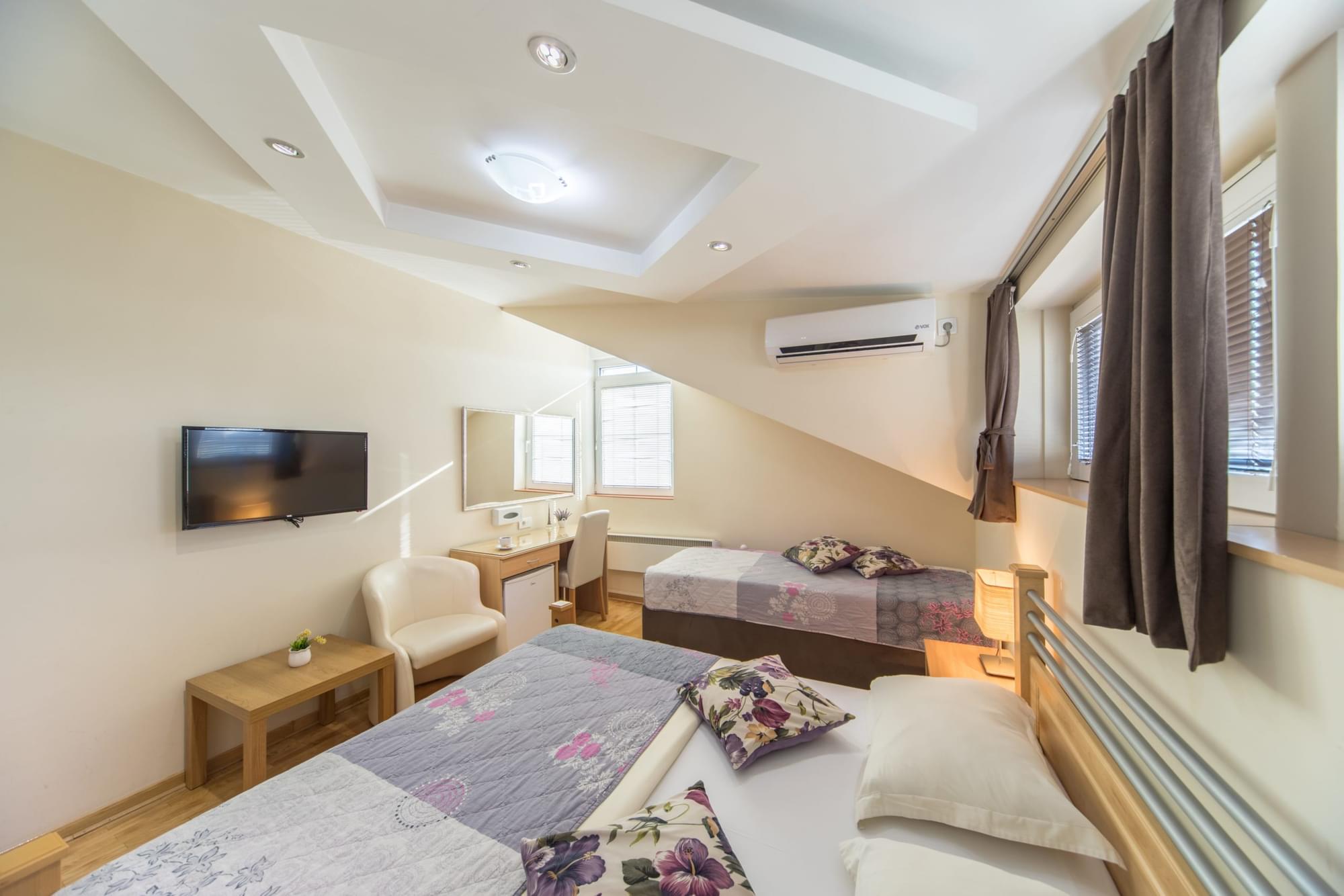Zvučno izolovana soba, kapaciteta do 3 osobe je odličan izbor za kraći boravak. Površine 20 m2, soba sadrži francuski i single ležaj sa udobnim dušecima, LCD TV, Klima uređaj, frižder, ugradni plakar, kupatilo sa tuš kabinom, Wi-Fi.