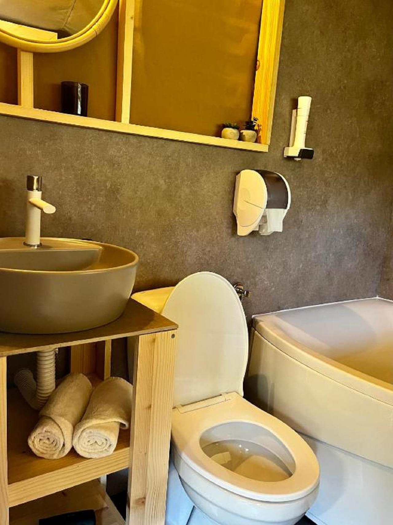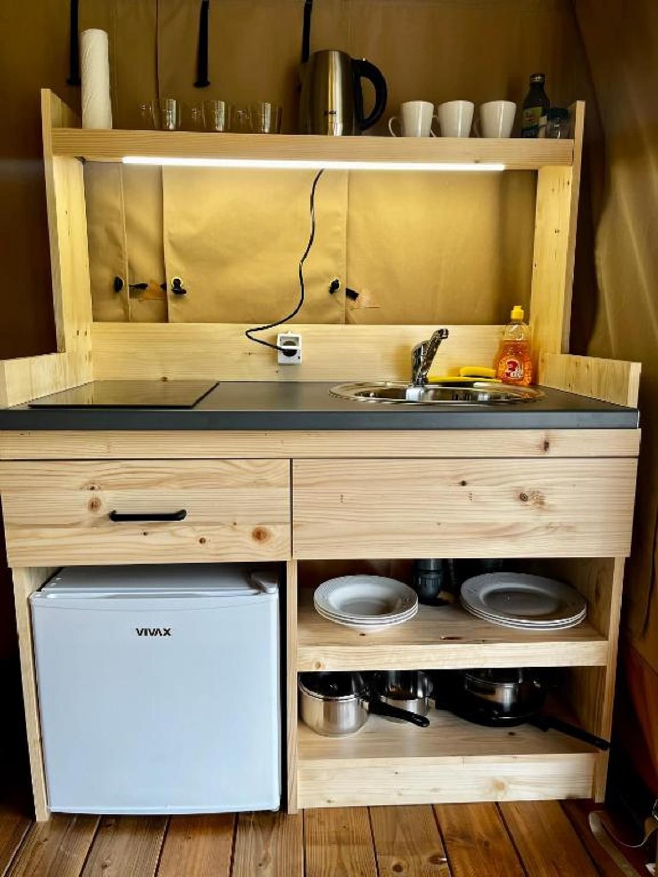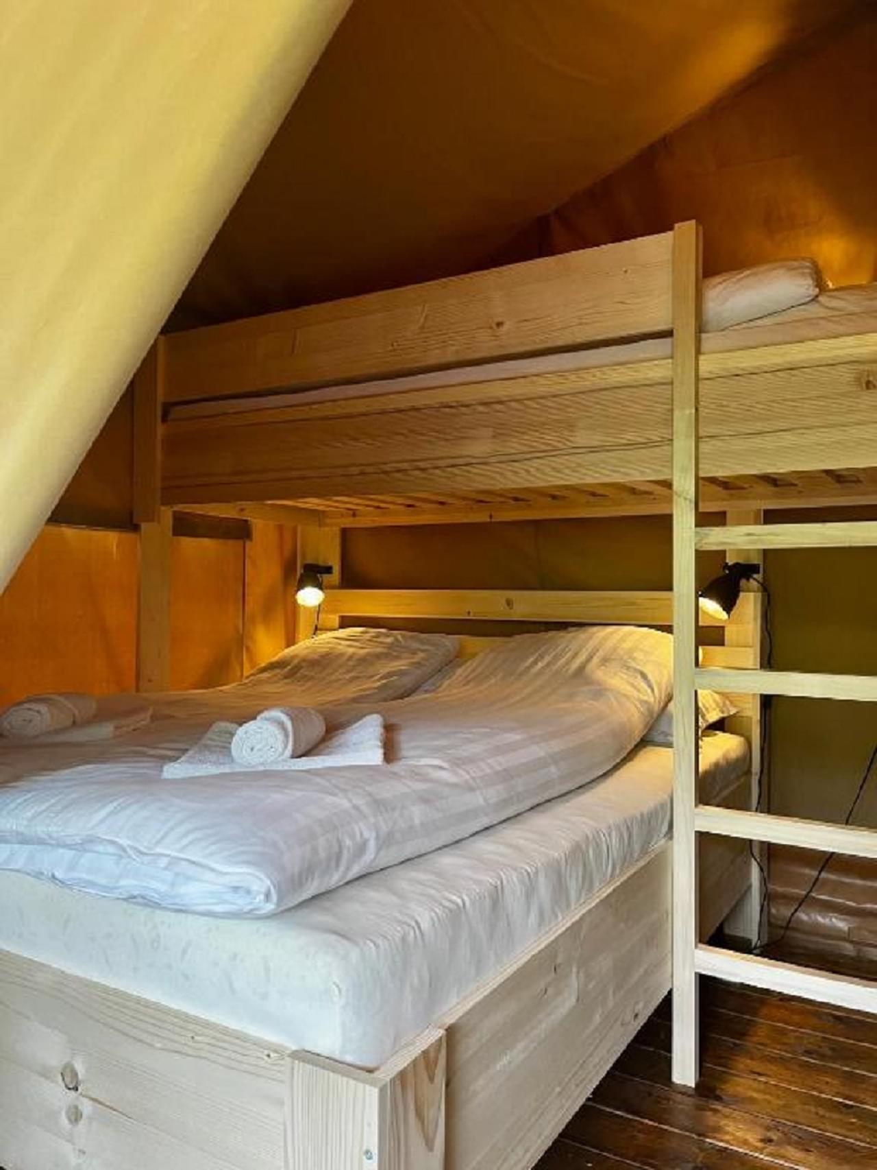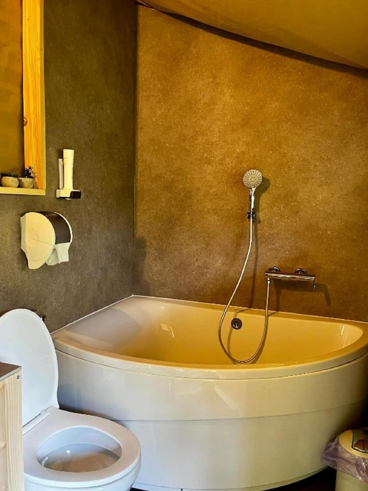 This unit accommodates 2 guests + 1 extra and offers more space with a private bathroom. Each tent features a bedroom with a double bed and a bunk bed in the same room, a living area with dining table, fridge, sink with hot and cold water, stovetop, kettle, cutlery, and 220V power outlet. Every tent has its own bathroom with a bathtub and stunning lake views from every corner.