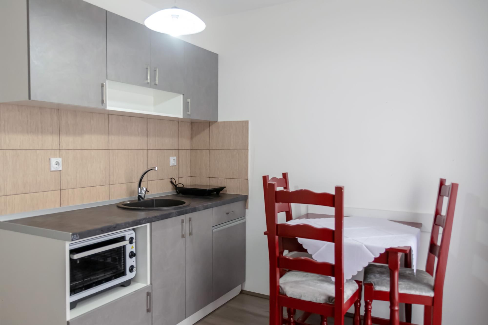 Kuhinja je opremljena svim osnovnim aparatima i posuđem koje je potrebno za pripremu obroka.