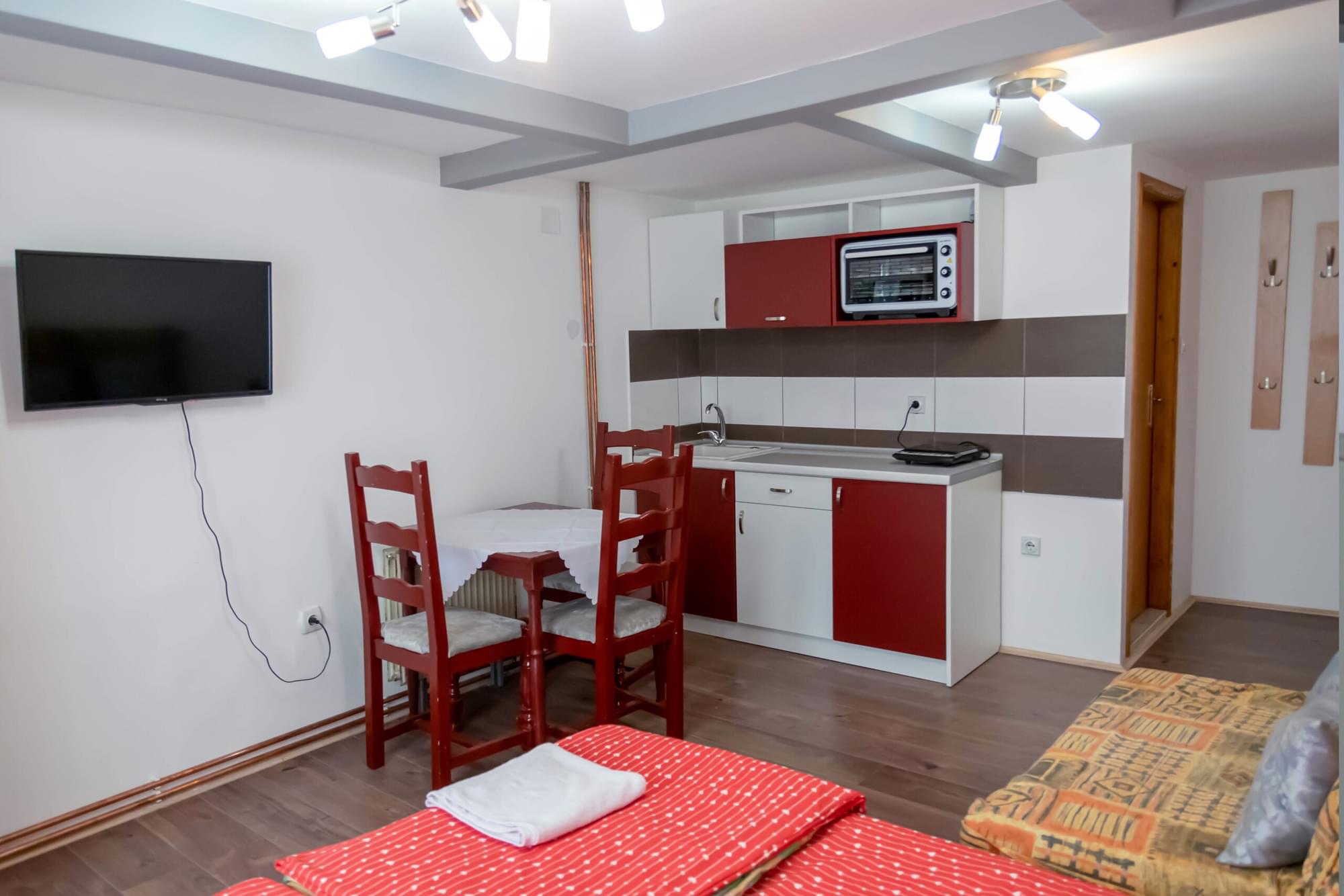 Студио се налази на првом спрату и опремљен је са два једноособна кревета са удобним душецима и помоћним лежајем, што омогућава добар сан и одмор. Ту је и тоалет са тушем, као и све потребне тоалетне потрепштине као што су пешкири, сапуни и шампони. Кухиња је опремљена свим основним апаратима и посуђем које је потребно за припрему оброка. Студио такође има и ТВ, Ви-Фи, као и друге погодности које ће гостима омогућити удобан и пријатан боравак. У склопу објекта постоје две заједничке просторије и тераса, намењене за дружење и опуштање. Апартмани Гора су идеалан избор за оне који желе удобност и могућност припреме оброка током свог боравка.
