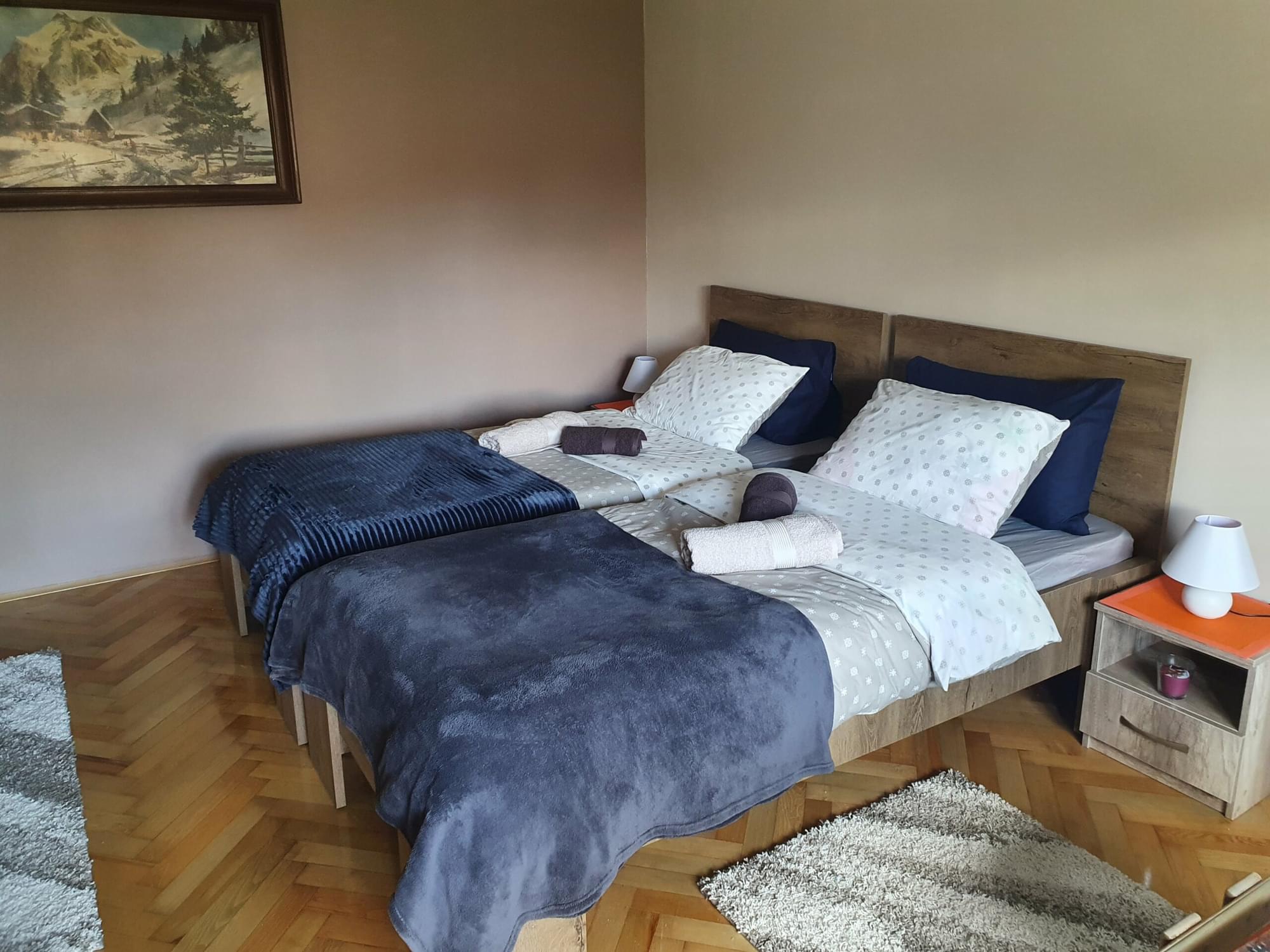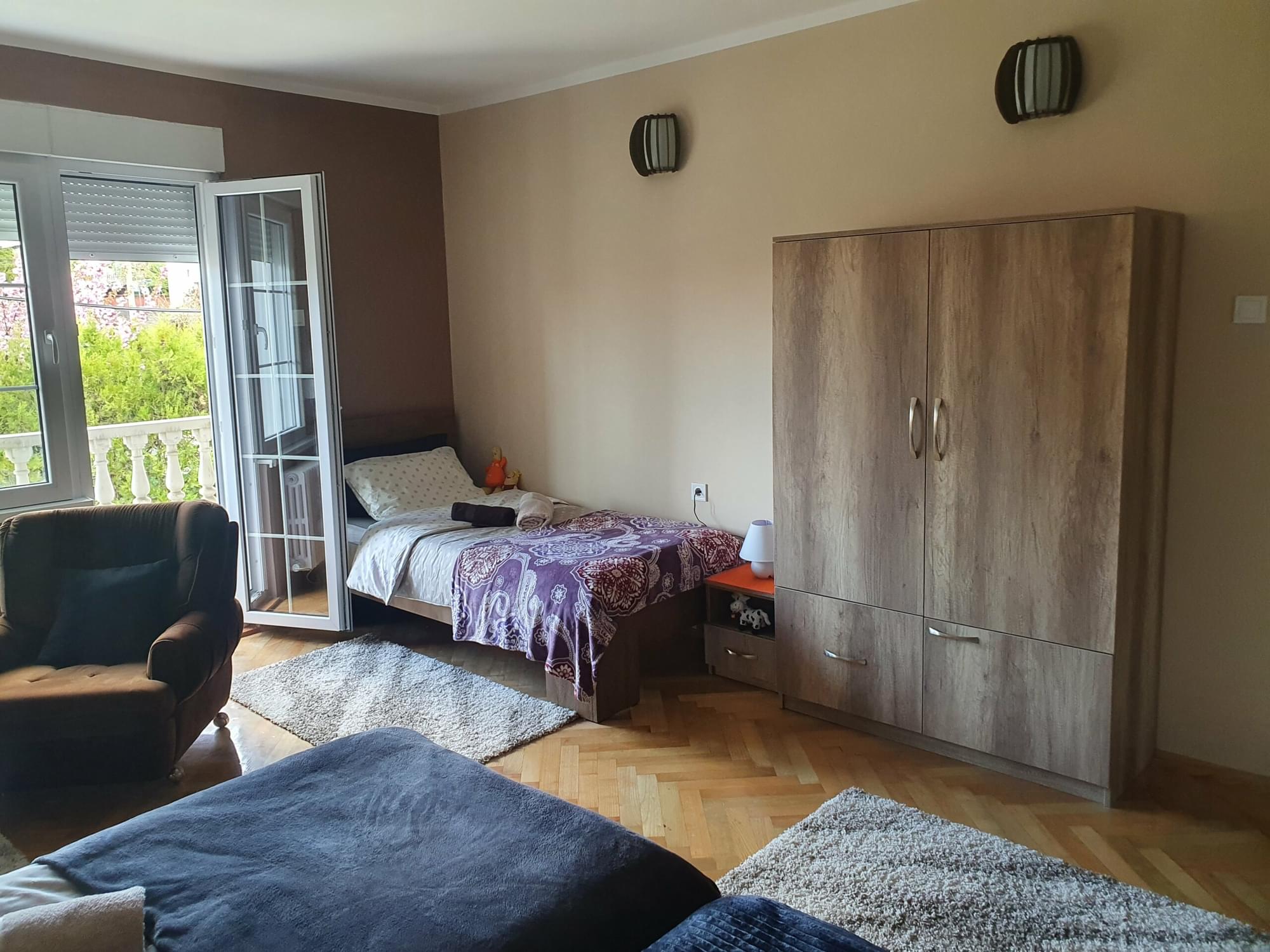 Dvokrevetna sa televizorom i foteljama za sedenje, pri čemu moderan ambijent stvara lepu atmosferu. Pored toga, soba ima i sopstveno kupatilo, kao i hodnik sa ormanom i cipelarom.