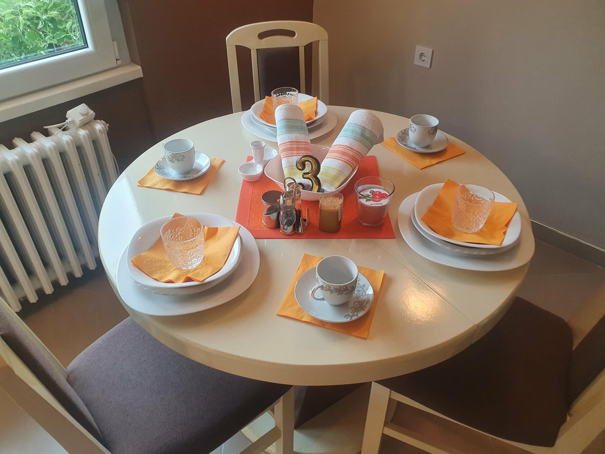 Kuhinja-trpezarija je zajednička za sobu 2 i 3, i poseduje sve što je potrebno za spremanje hrane, stolove za ručavanje i moderan televizor.
