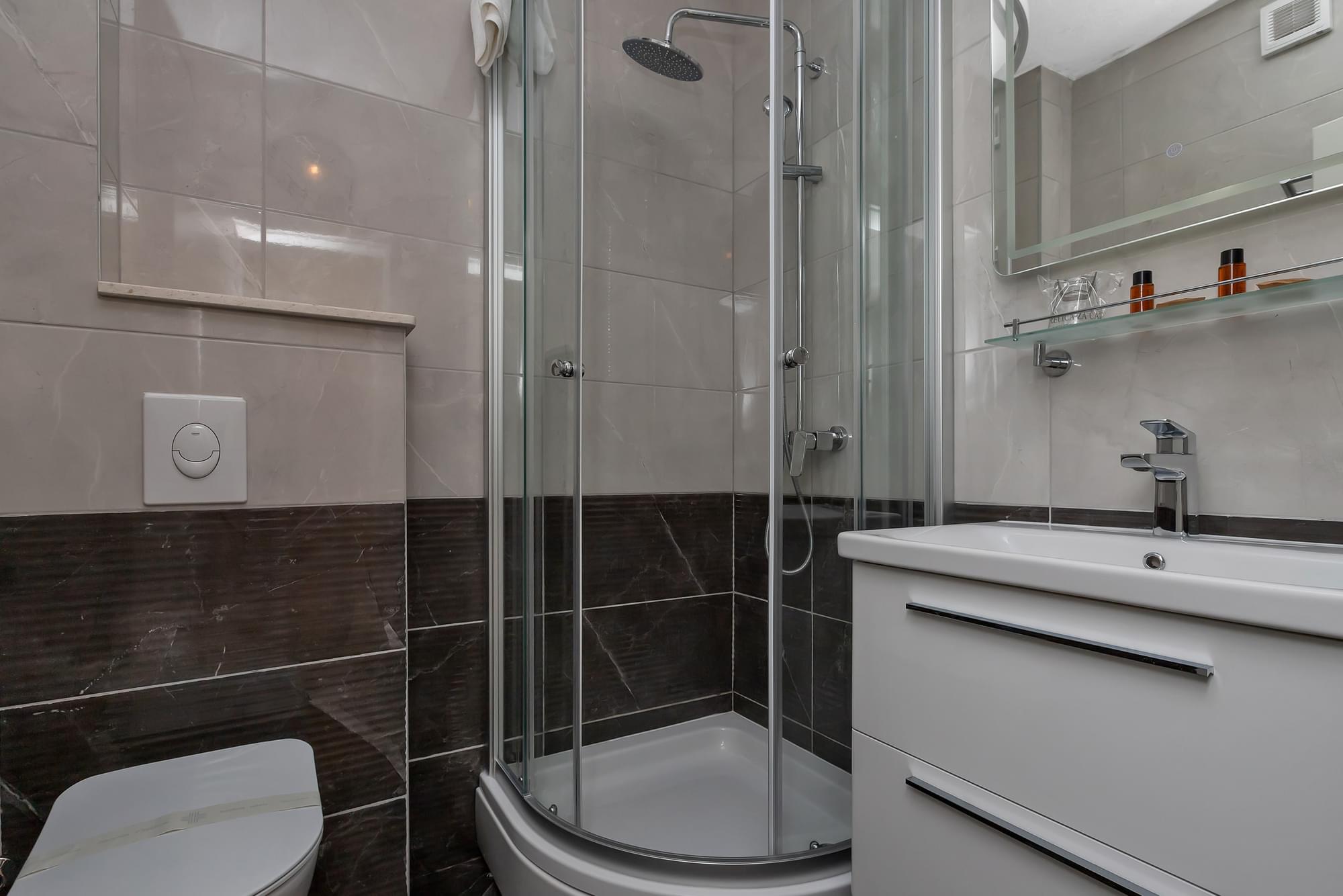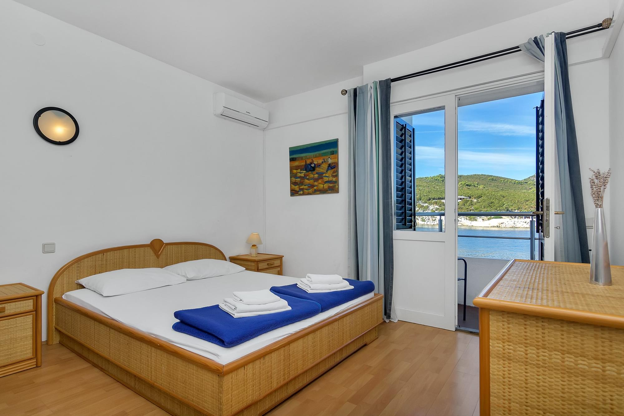 Soba ima vlastiti balkon i prekrasan pogled na zaljev i Jadransko more, vlastitu kupaonicu s tušem, bračni krevet, krevet na kat, klimu uključenu u cijenu i satelitske kanale. Wi-Fi je dostupan u cijelom objektu i besplatan je za goste.