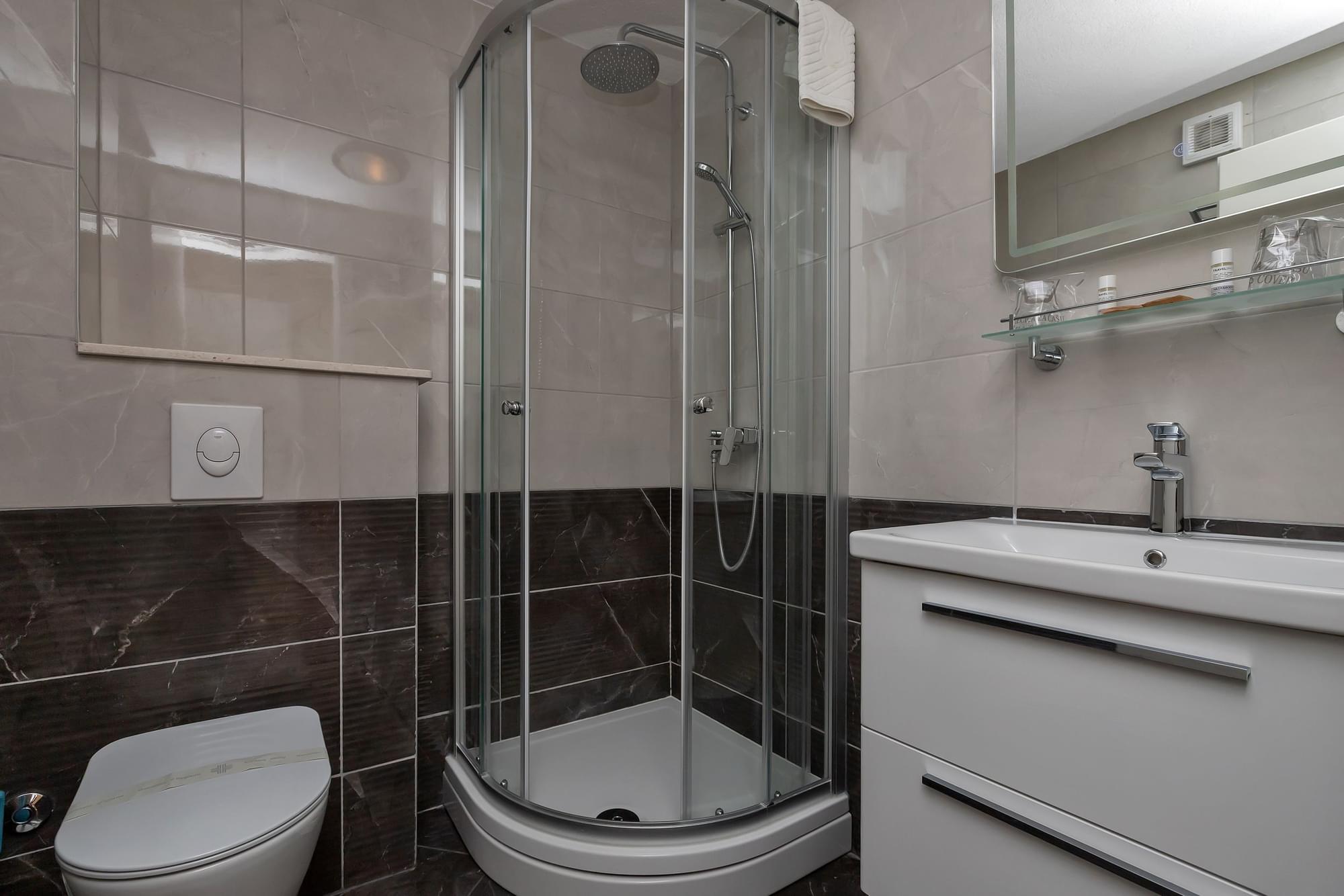 Soba ima vlastiti balkon i prekrasan pogled na zaljev i Jadransko more, vlastitu kupaonicu s tušem, bračni krevet i pomoćni ležaj, klimu uključenu u cijenu i satelitske kanale. Wi-Fi je dostupan u cijelom objektu i besplatan je za goste.