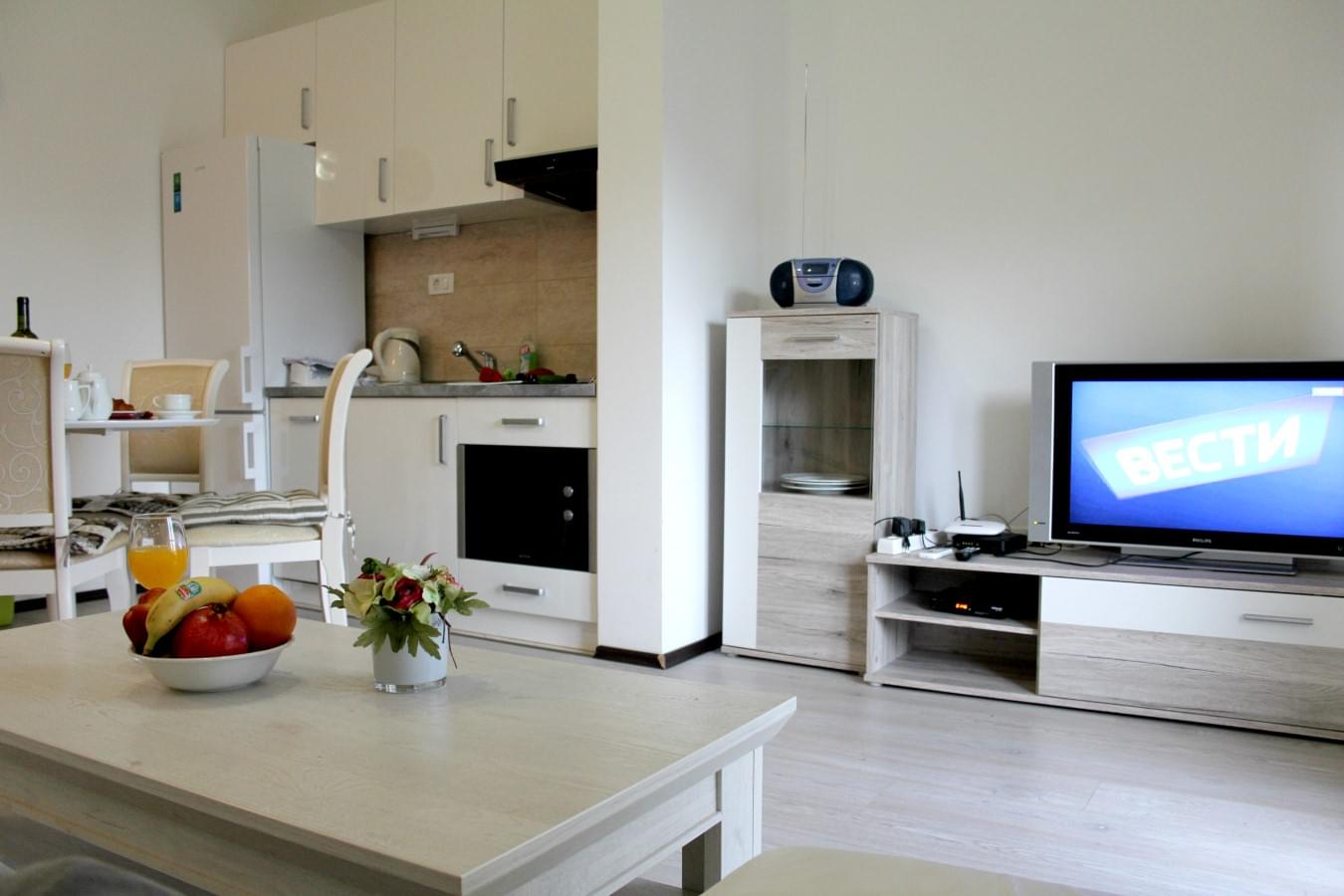 Apartment of 45 m2. One bedroom with two beds that you can put together or separately according to your wishes. A fully equipped kitchen and a bathroom. In the living room – a folding sofa which can sleep two people.