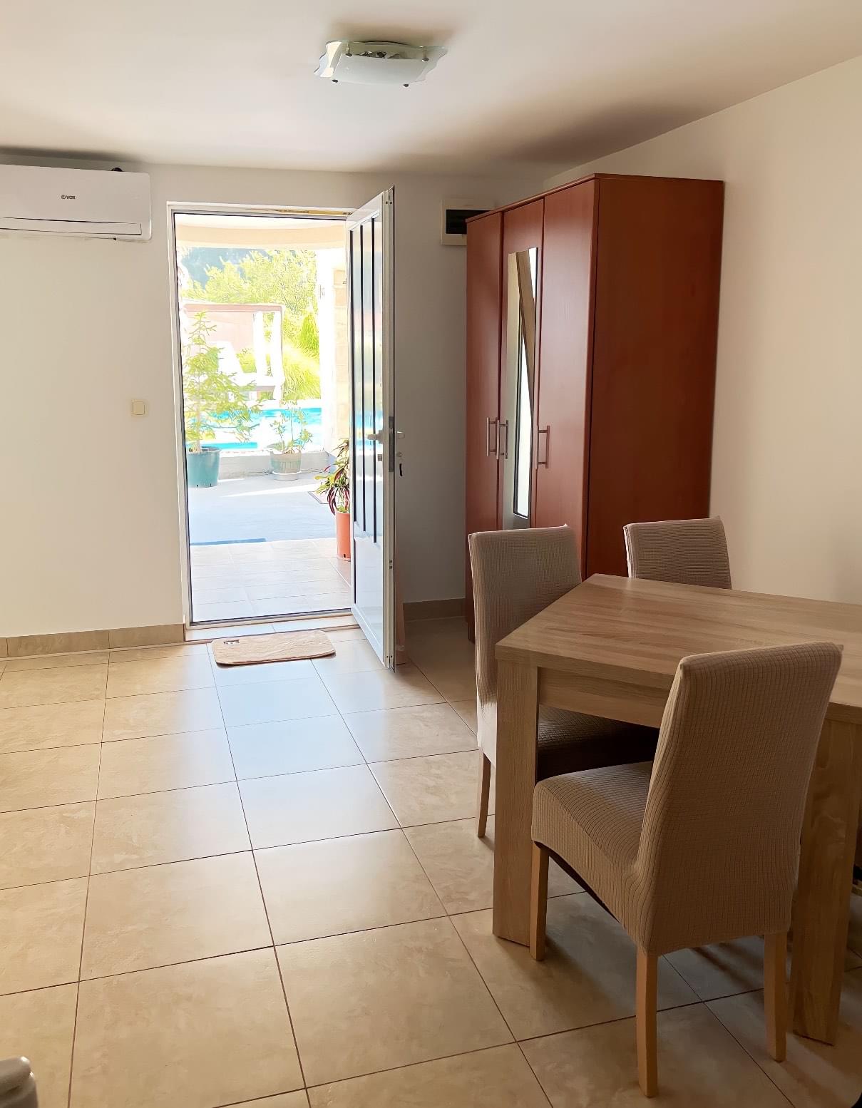 Dobrodošli u naš udobni jednosobni apartman, vašu oazu udobnosti i opuštanja! Smješten u prizemnom dijelu naše vile, apartman od 50 kvadrata pruža sve što vam je potrebno za savršen odmor. Uživajte u prostranom dnevnom boravku, opremljenom udobnom ugaonom garniturom i modernim detaljima, idealnom za druženje ili opuštanje uz omiljenu knjigu ili film.