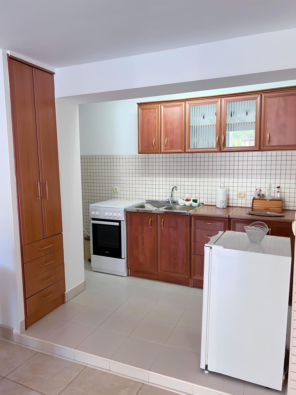 Naša potpuno opremljena kuhinja omogućava vam da sami pripremate ukusne obroke, dok će kupatilo s modernim sadržajima osigurati svježinu i udobnost. Spavaća soba je oaza mira, s udobnim krevetom koji će vas omotati u toplinu i udobnost nakon uzbudljivog dana. Iako apartman ne pruža pogled na more, njegova udobnost i praktičnost nadoknađuju svaku očekivanu želju.