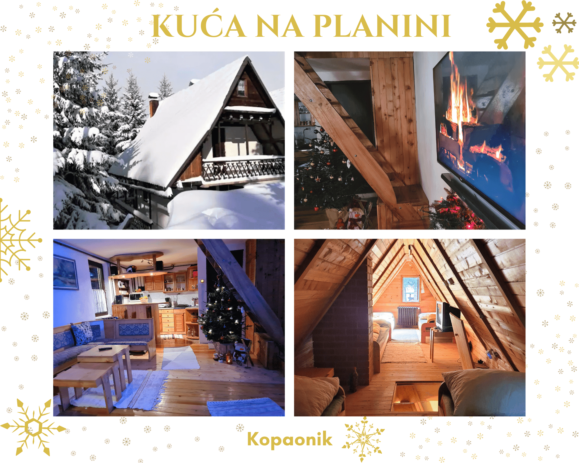 Privatna kuća gde imate u potpunosti svoj mir i izolaciju, okružena šumom i borovim jelama. Kuća sadrži 4 etaže, smeštaj kapaciteta za 10 osoba, sopstveni parking i dvorište sa spoljnim kaminom. Idealna za porodice, veće grupe ljudi i parove koji žele svoju privatnost. Dvostruko grejni sistem, etažno grejanje na pelet i struju, podno grejanje, omogućava vam da podesite željenu temperaturu kuće. Osećajte se kao u svom domu, uz kablovsku televiziju, wifi, šank kuhinjom, odvojenom kuhinjom i trpezarijom, ušuškanim potkrovljem, posebne sobe za spavanje, i sve prateće elektronske uređaje.