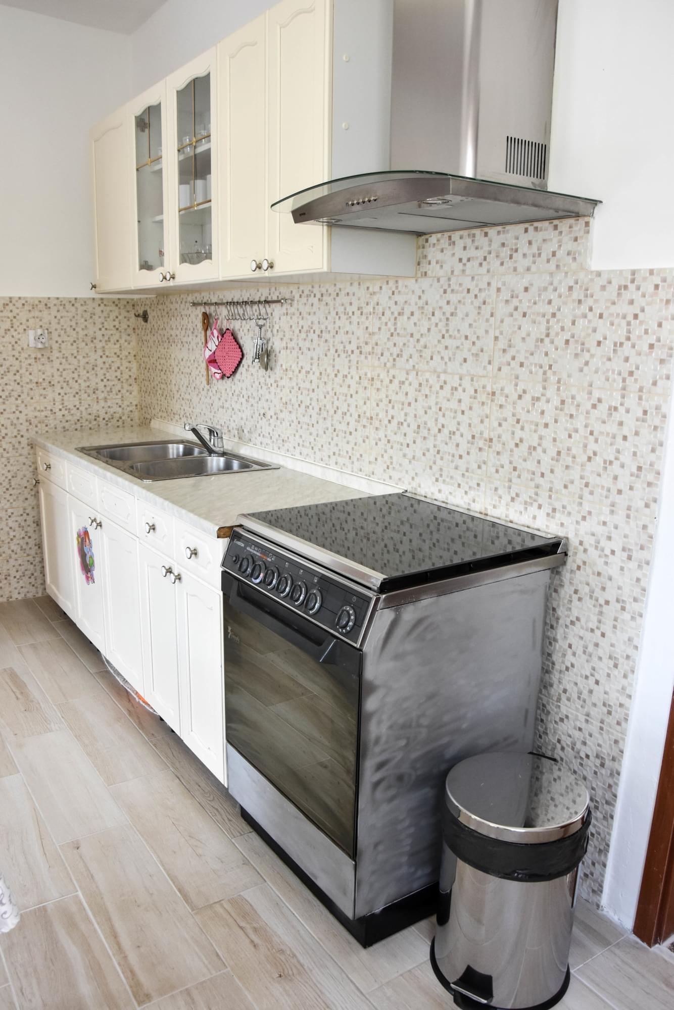 U lijepo uređenom apartmanu je garaža u sklopu kuće, sa garažnim vratima. Dvije sobe, jedna sa krevetičem za dijete. Kao i kada za bebu i stolica za sjedenje. Kupaona i wc posebno. Kuhinja i dnevni boravak sa TV-internetom. Izlaz je na balkon koji je spojen sa dvorištem. Sve je ograđeno i sigurno. Kamin i veliki stol u dvorištu, sa dvije ležaljke. Pješčana plaža je 5 minuta hoda od apartmana, kao i dućan i centar grada.