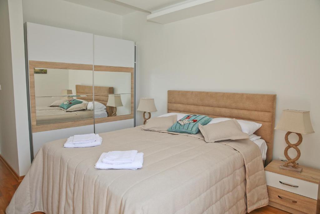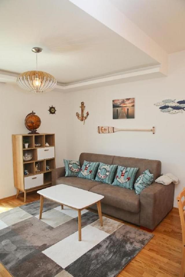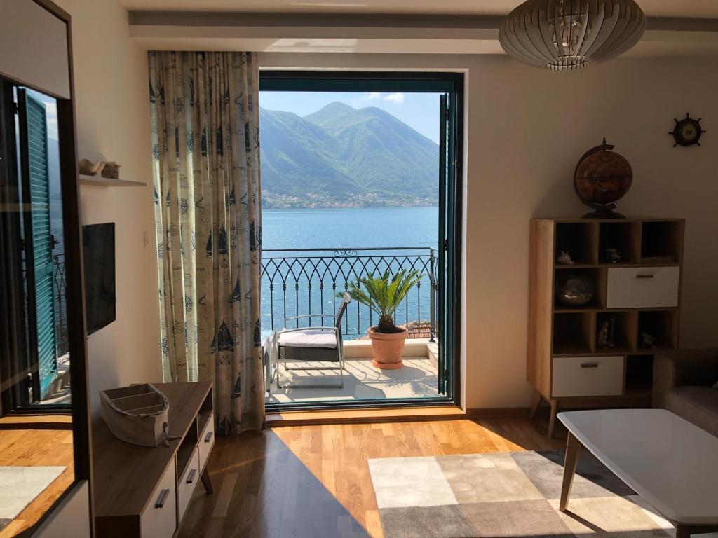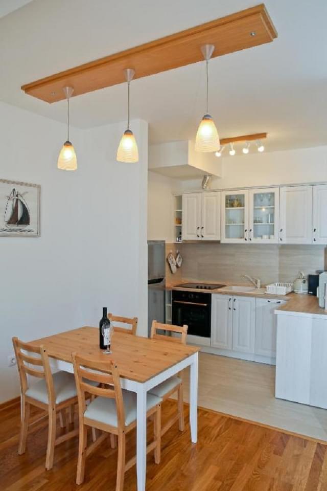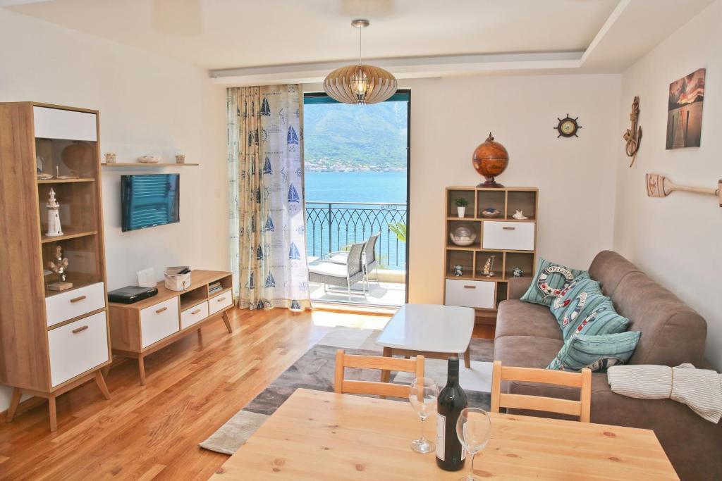 Stan je jednosoban, 55 m2, na prvoj liniji do mora. Izlaz na terasu je iz dnevnog boravka i iz spavaće sobe, a sa terase se pruža pogled na ceo zaliv.