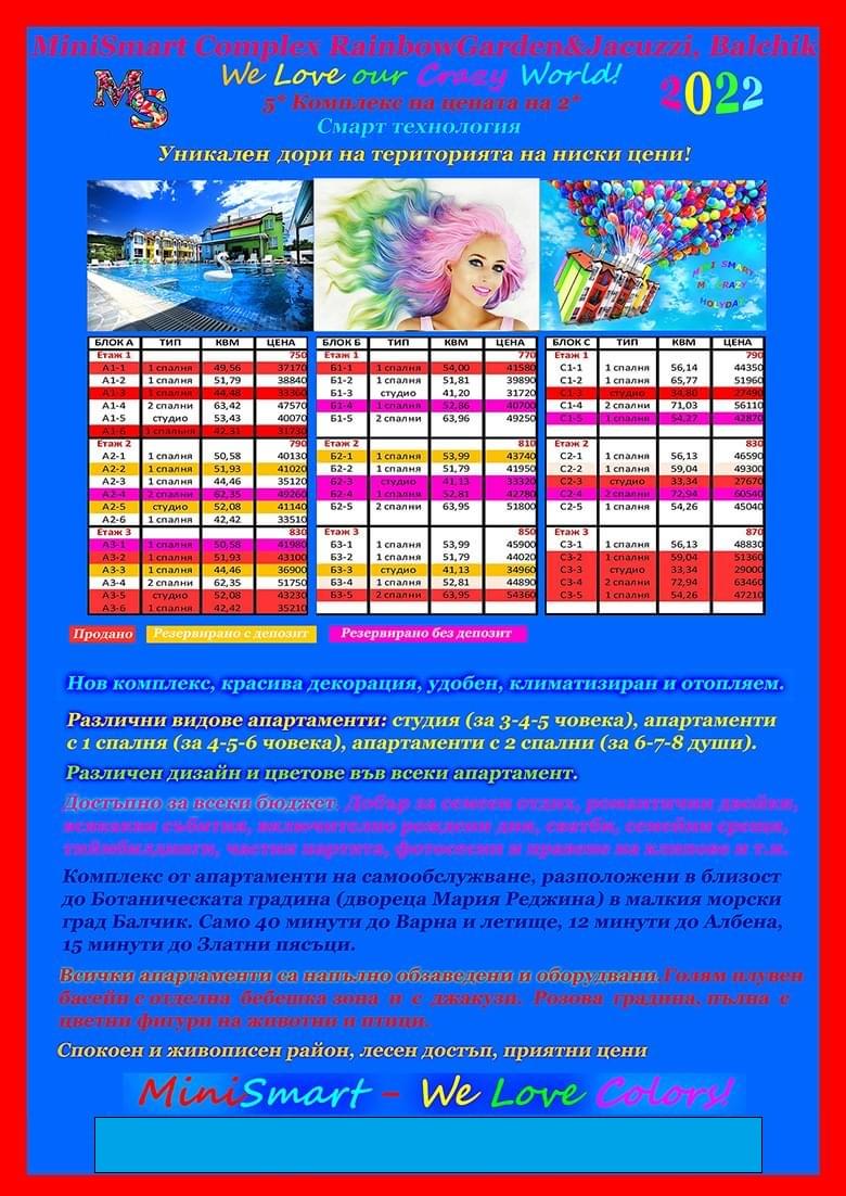 There is a wide range of apartments from different types: studio for 4 and 5, apartments with 1 bedroom for 4-5-6 pers, apartments with 2 bedrooms for 6 and 7 pers.