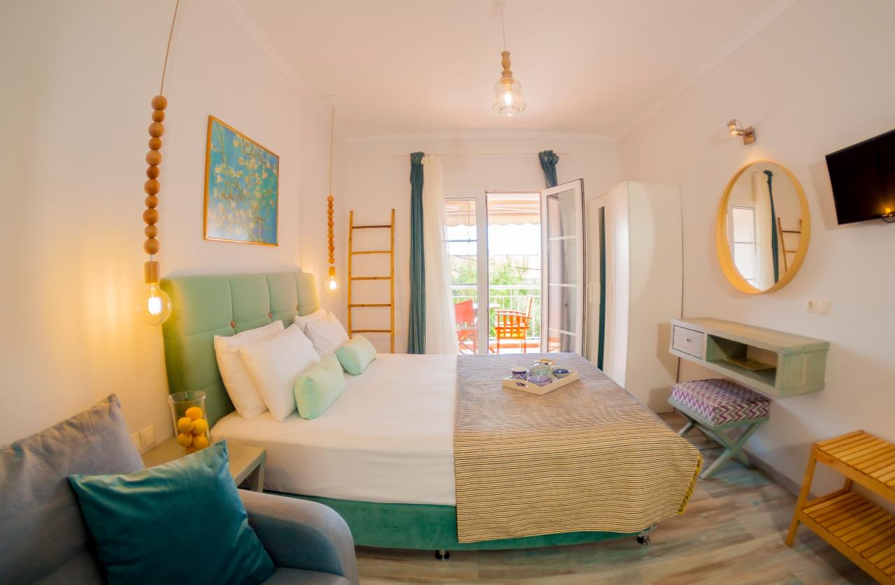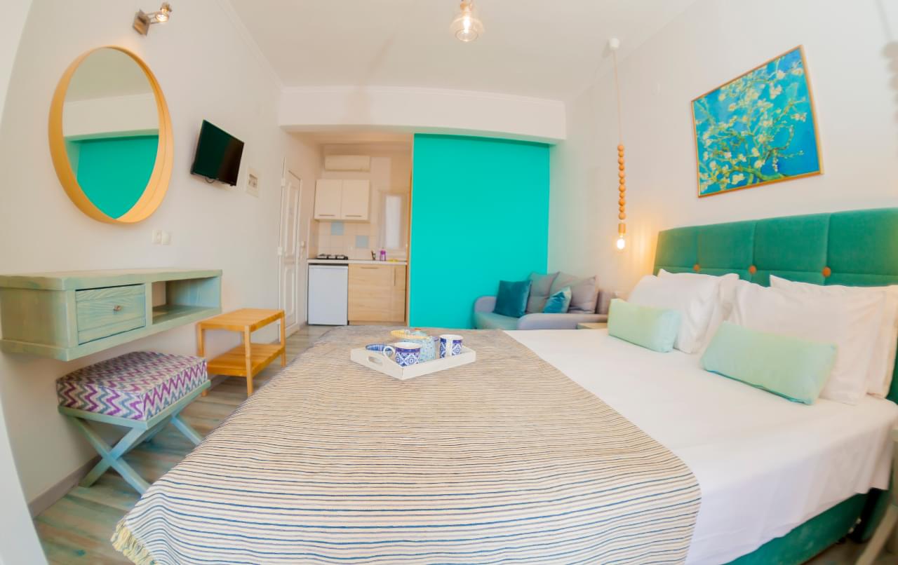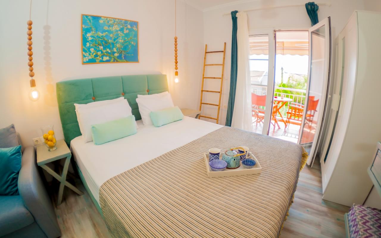 With a double bed and a sofa that it turns to a double bed. A/C, TV, balcony with sea view. Ideal for 2people or parents with a kid.