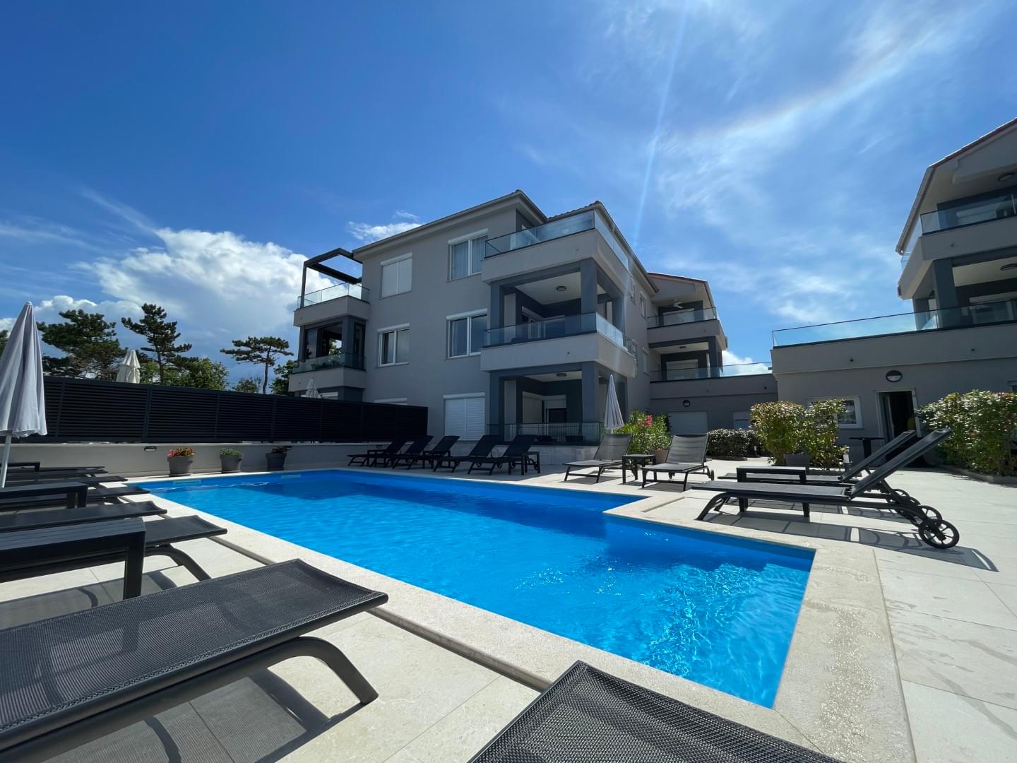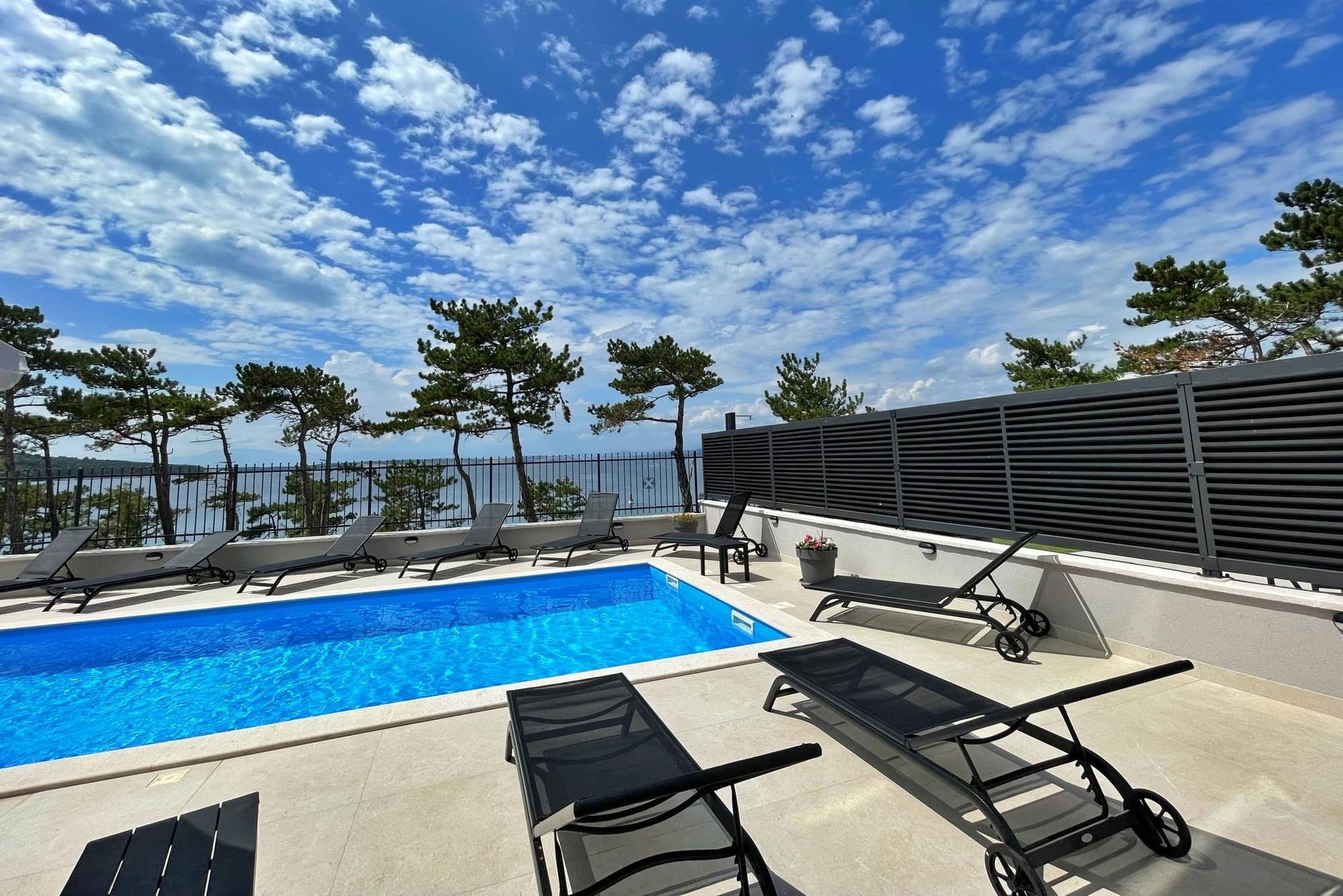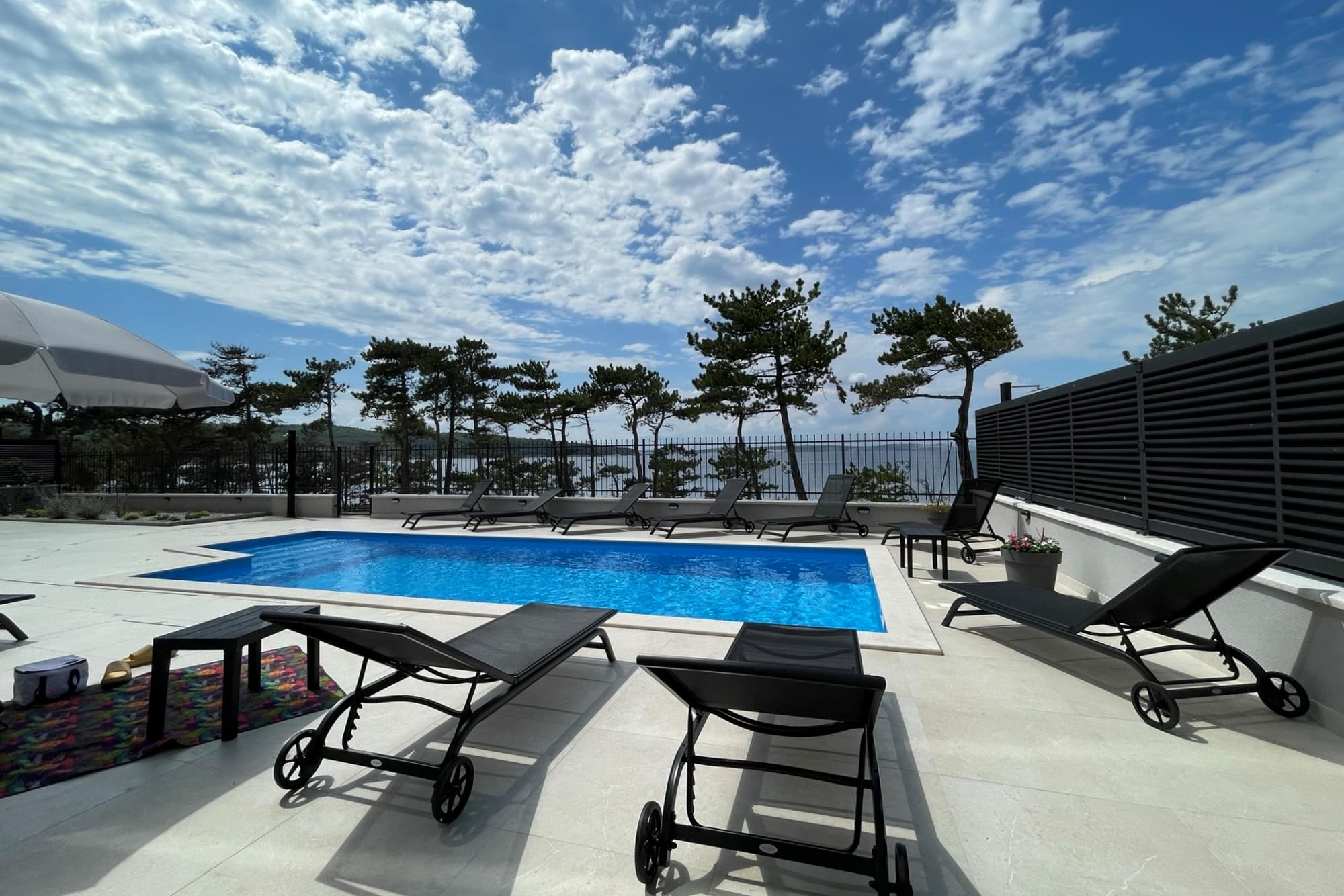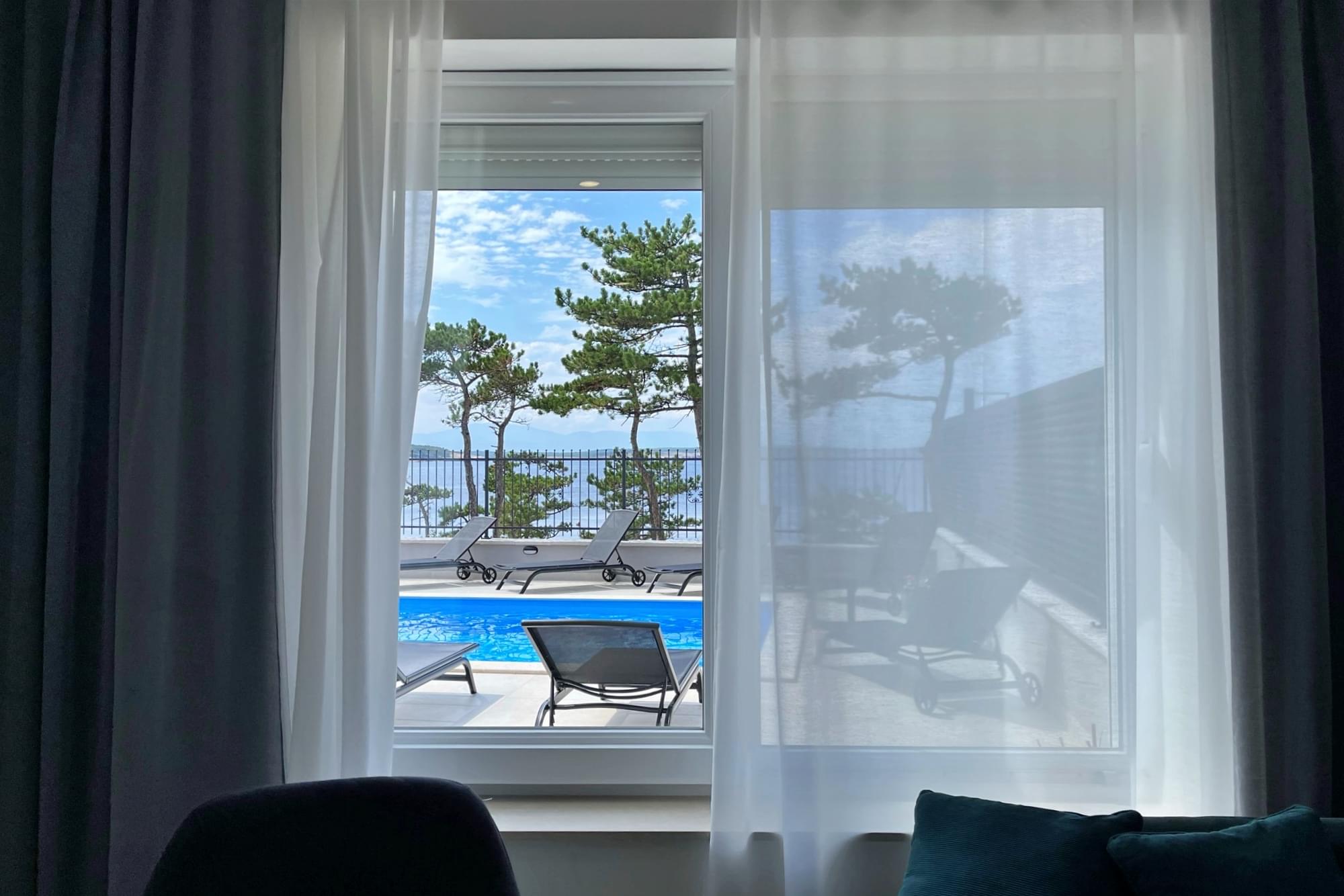 This luxury apartment with a panoramic sea view is located in a building complex and in a peaceful area. The building has a large saltwater pool (40 m2) for all the guests in the house to use. On the ground floor of the building guests can rest on beach loungers next to the pool.