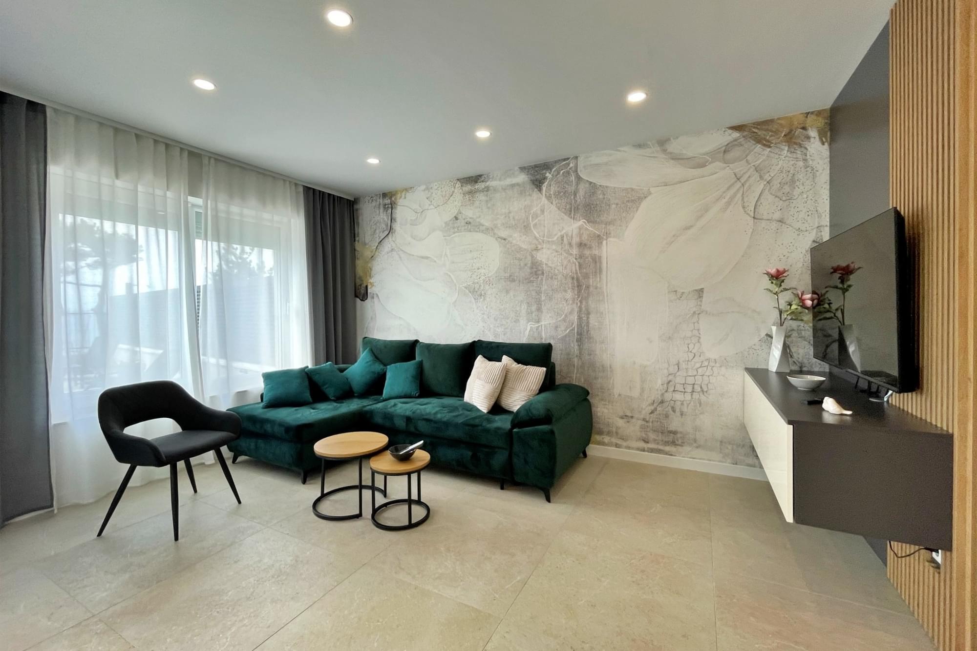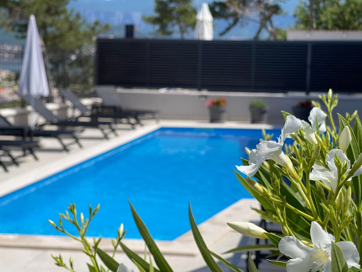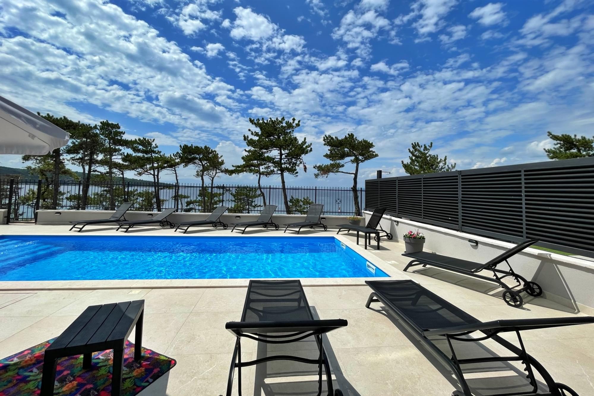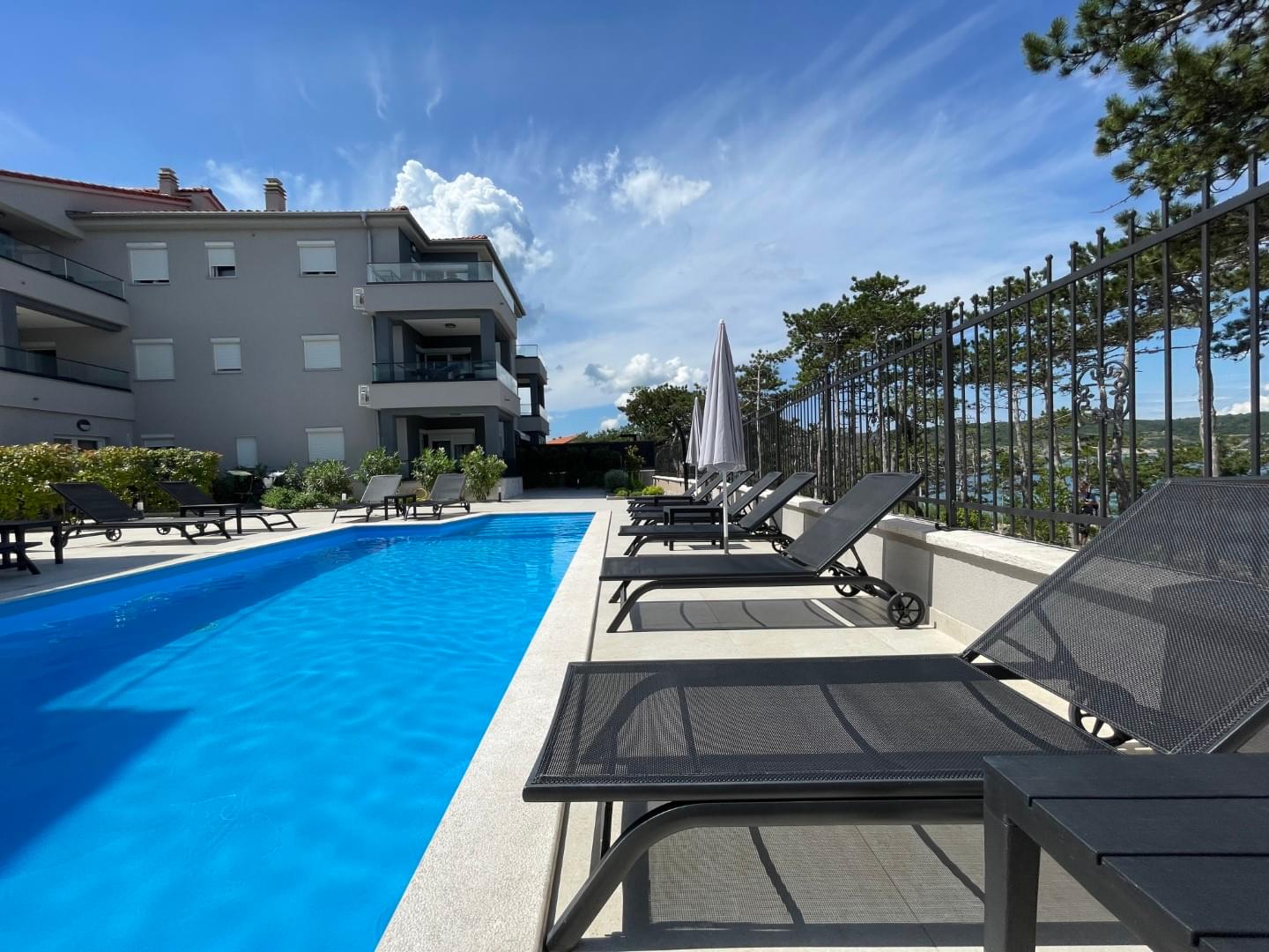 This luxury apartment with a panoramic sea view is located in a building complex and in a peaceful area. The building has a large saltwater pool (40 m2) for all the guests in the house to use. On the ground floor of the building guests can rest on beach loungers next to the pool.