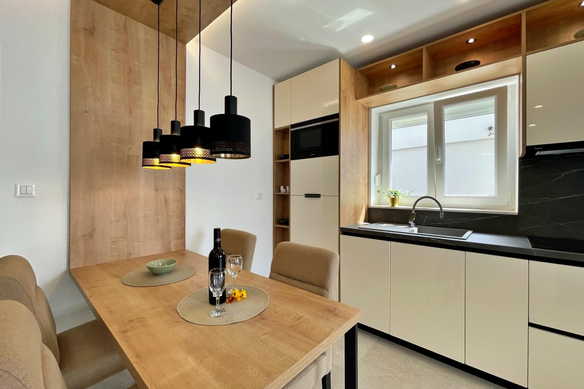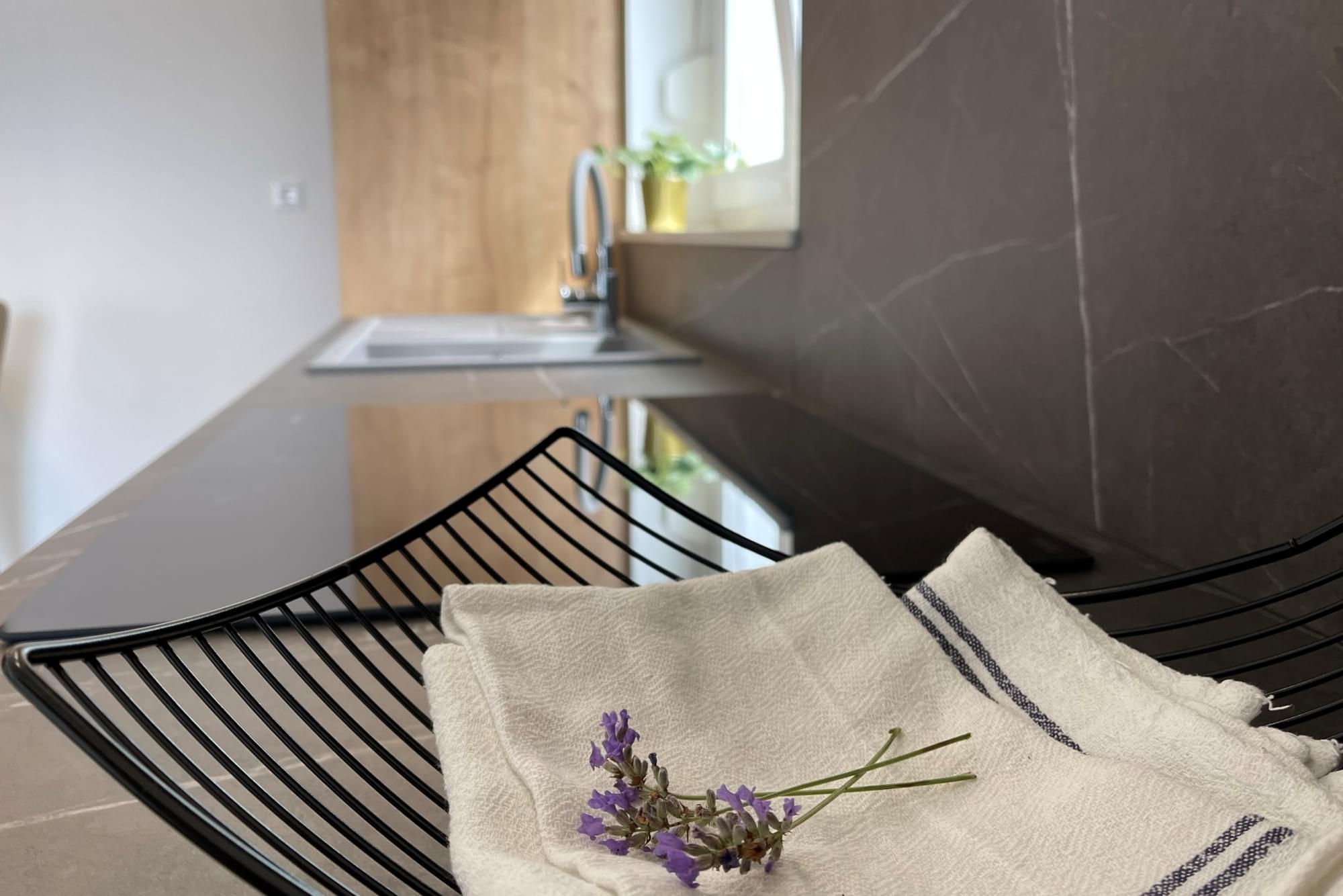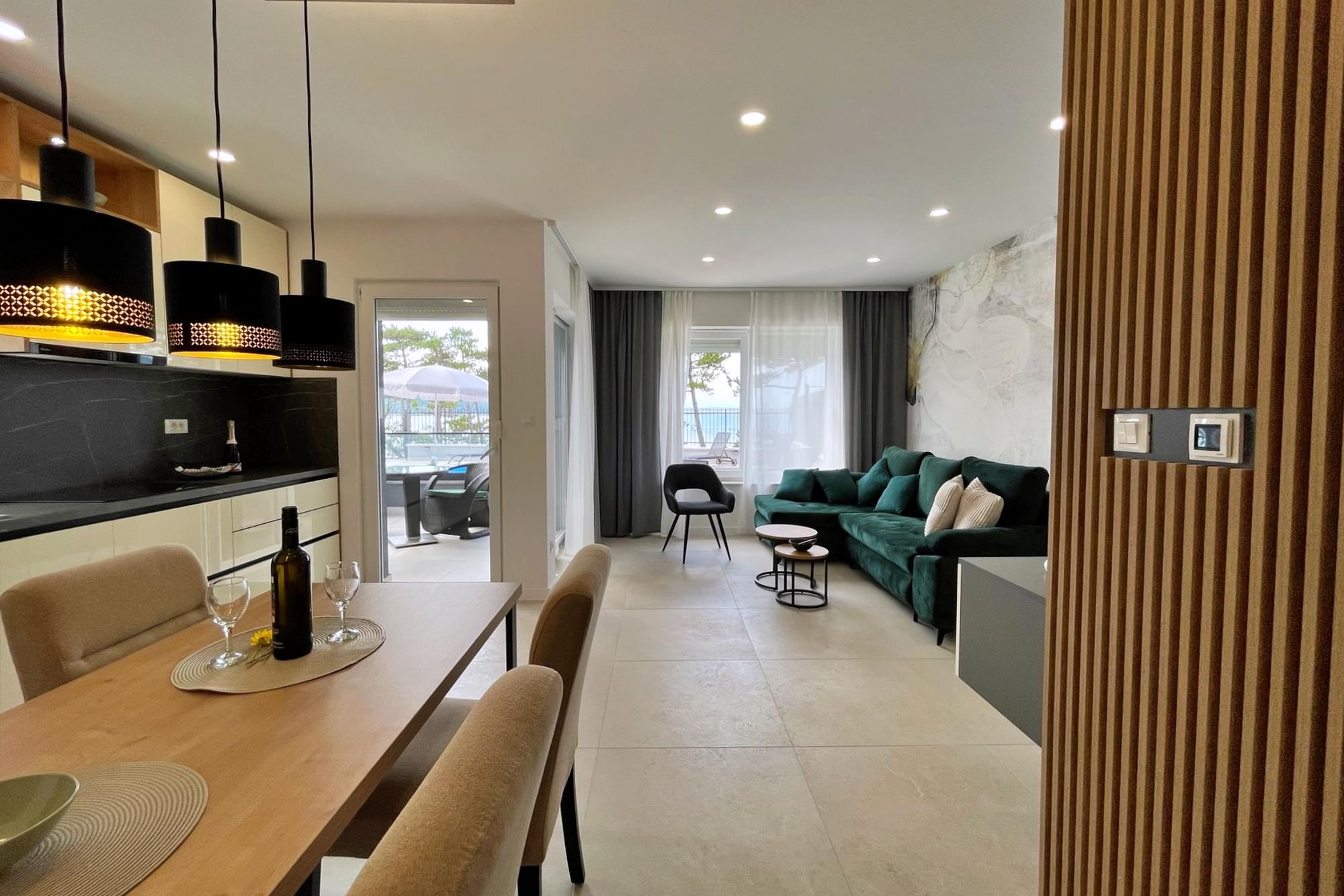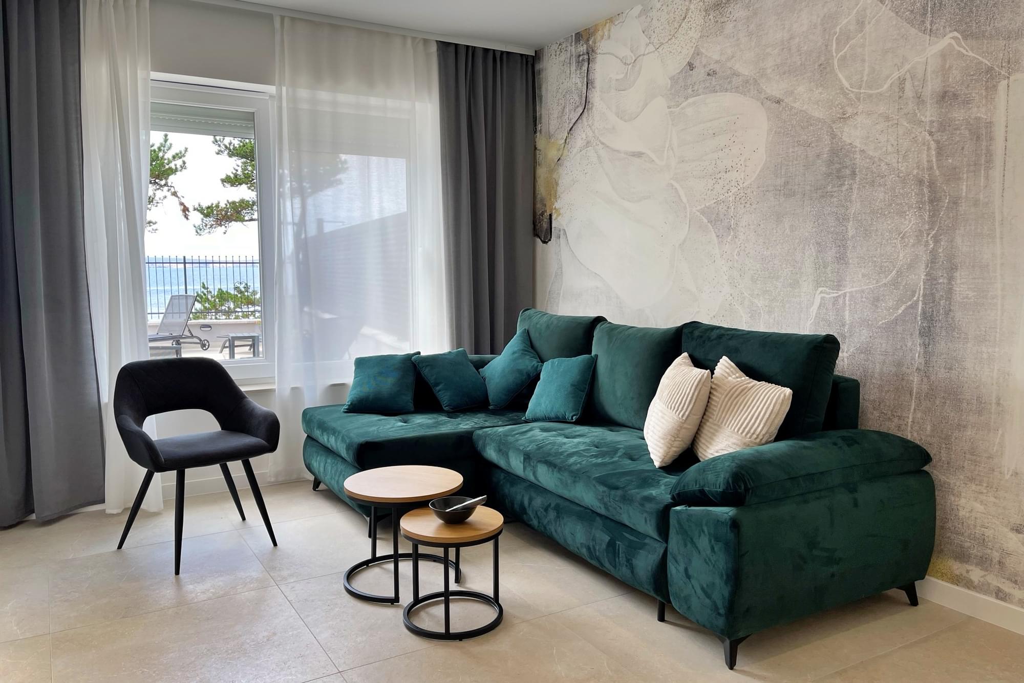 The apartment is located on the ground floor and has a private parking behind the building. There is also a large pebble beach in the immediate vicinity, and a great restaurant just across the street, which also offers a selection of local specialties. This apartment is located on the ground floor and can accommodate a maximum of 2 people. It is modernly equipped with two A/C units and two Smart TVs with satellite programs (in the living room and bedroom). Bed linen and towels are provided. The kitchen has an induction hob with all necessary dishes, a fridge with a separate freezer, a coffee machine, a toaster, a kettle, a dishwasher, and a microwave oven. The apartment has a terrace (10 m2) with outdoor furniture and a sea view.