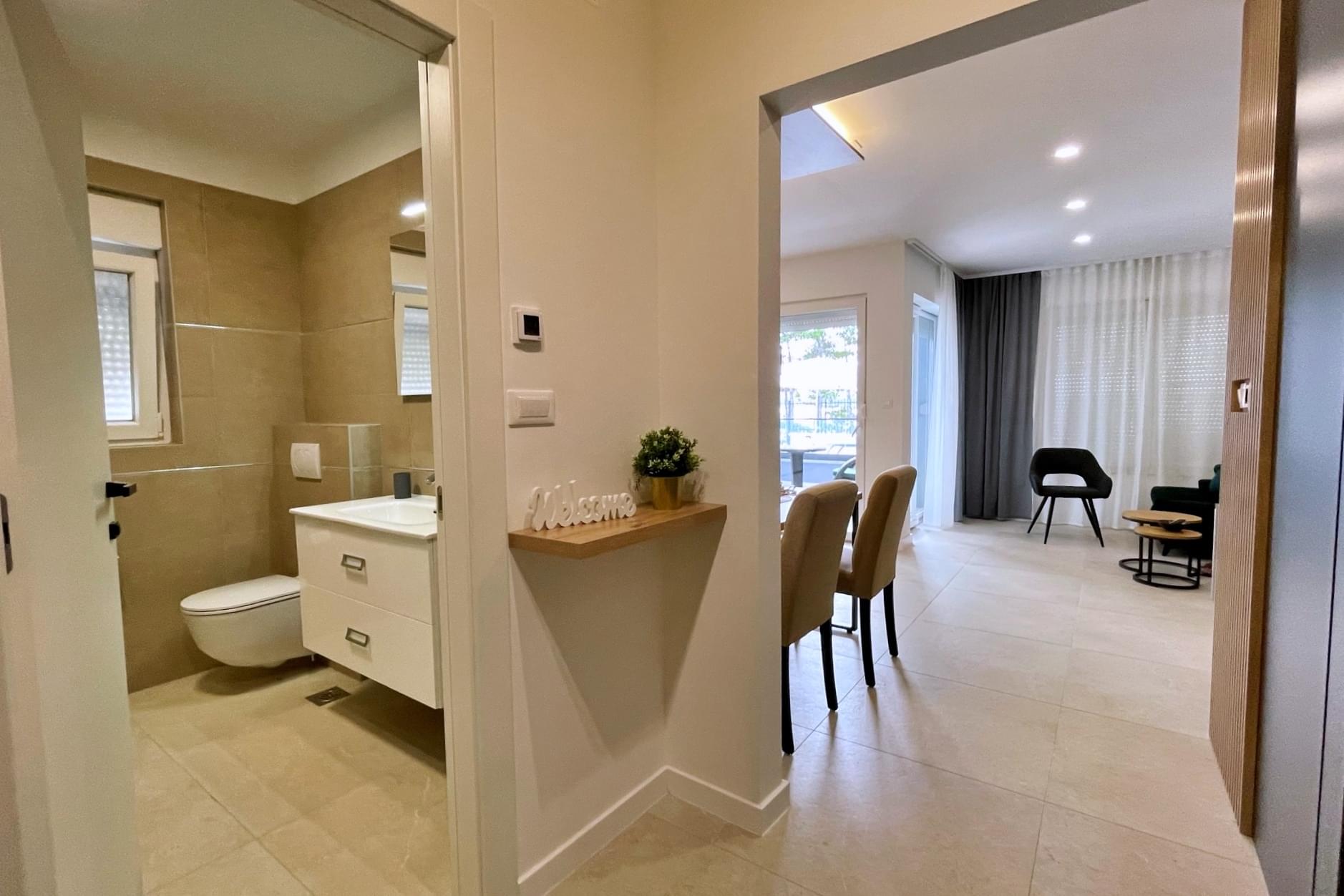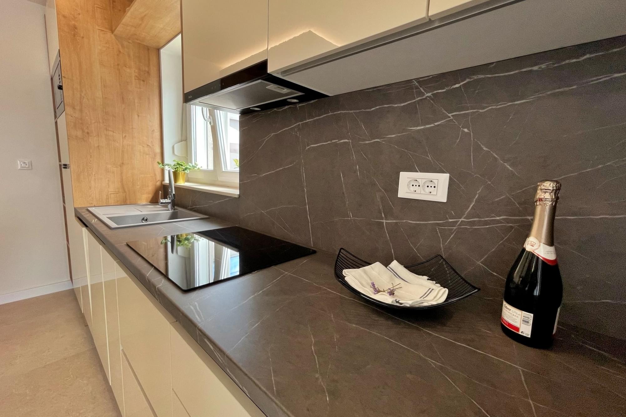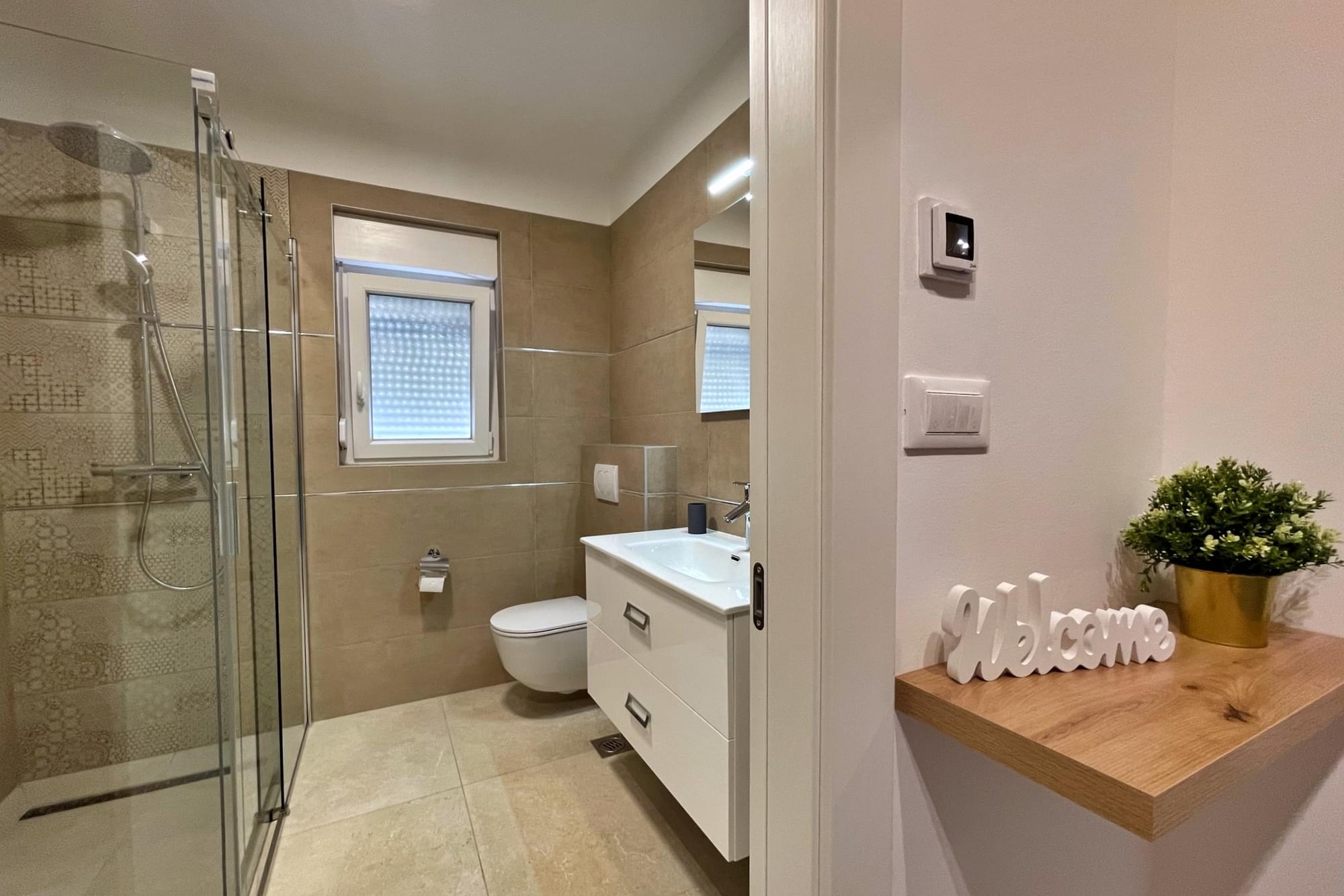 The apartment is located on the ground floor and has a private parking behind the building. There is also a large pebble beach in the immediate vicinity, and a great restaurant just across the street, which also offers a selection of local specialties. This apartment is located on the ground floor and can accommodate a maximum of 2 people. It is modernly equipped with two A/C units and two Smart TVs with satellite programs (in the living room and bedroom). Bed linen and towels are provided. The kitchen has an induction hob with all necessary dishes, a fridge with a separate freezer, a coffee machine, a toaster, a kettle, a dishwasher, and a microwave oven. The apartment has a terrace (10 m2) with outdoor furniture and a sea view.