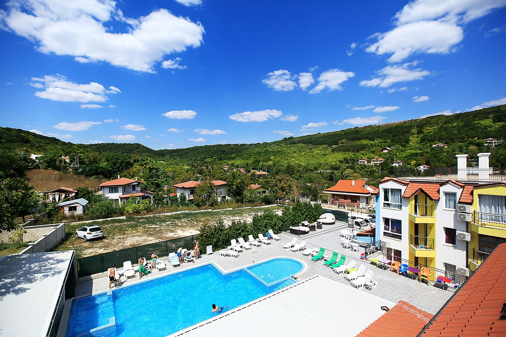 There is a large swimming pool with a separate children’s zone and jacuzzi, an equipped pool terrace, two covered areas for relaxation with TV and music, barbecue.