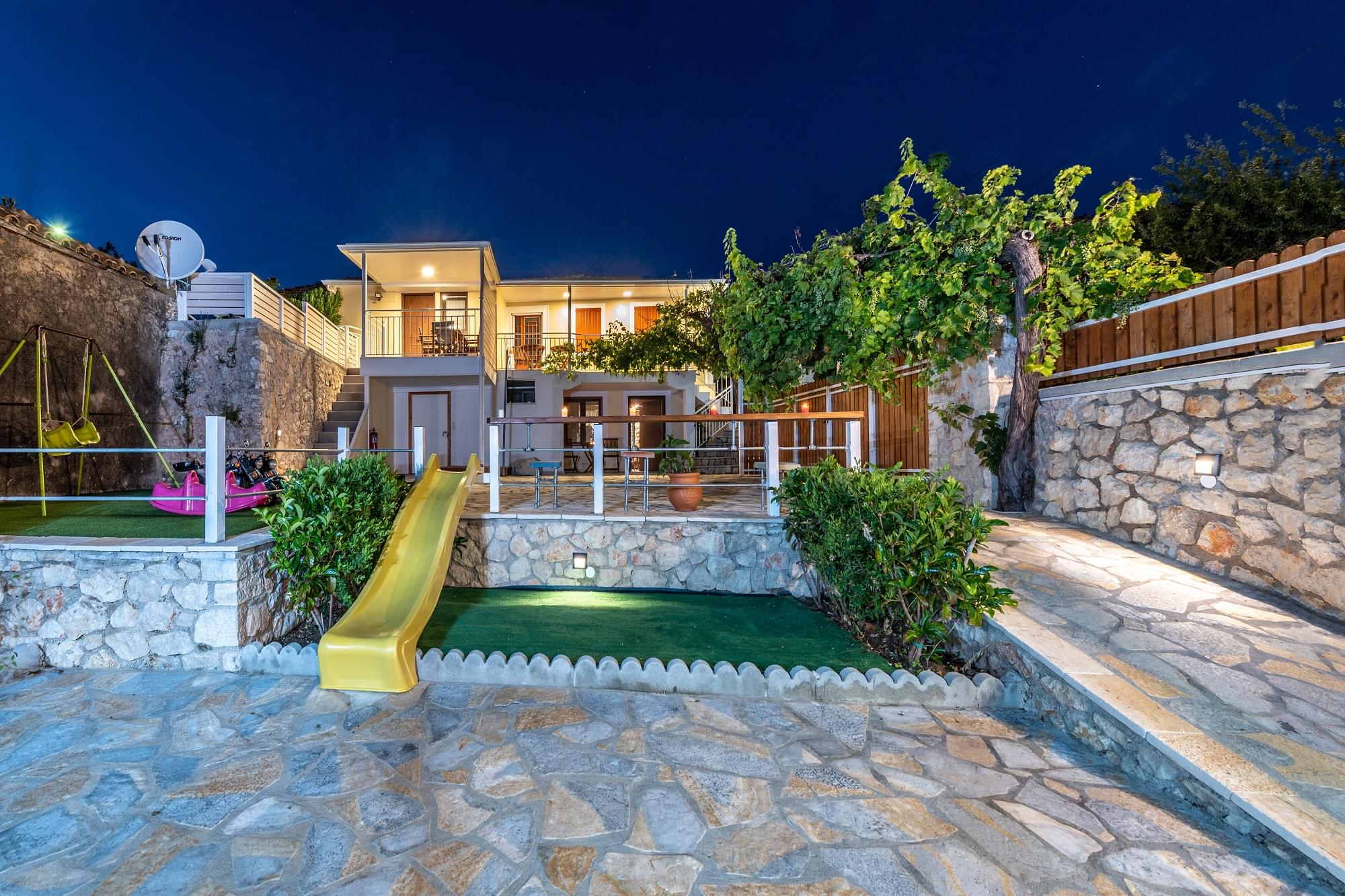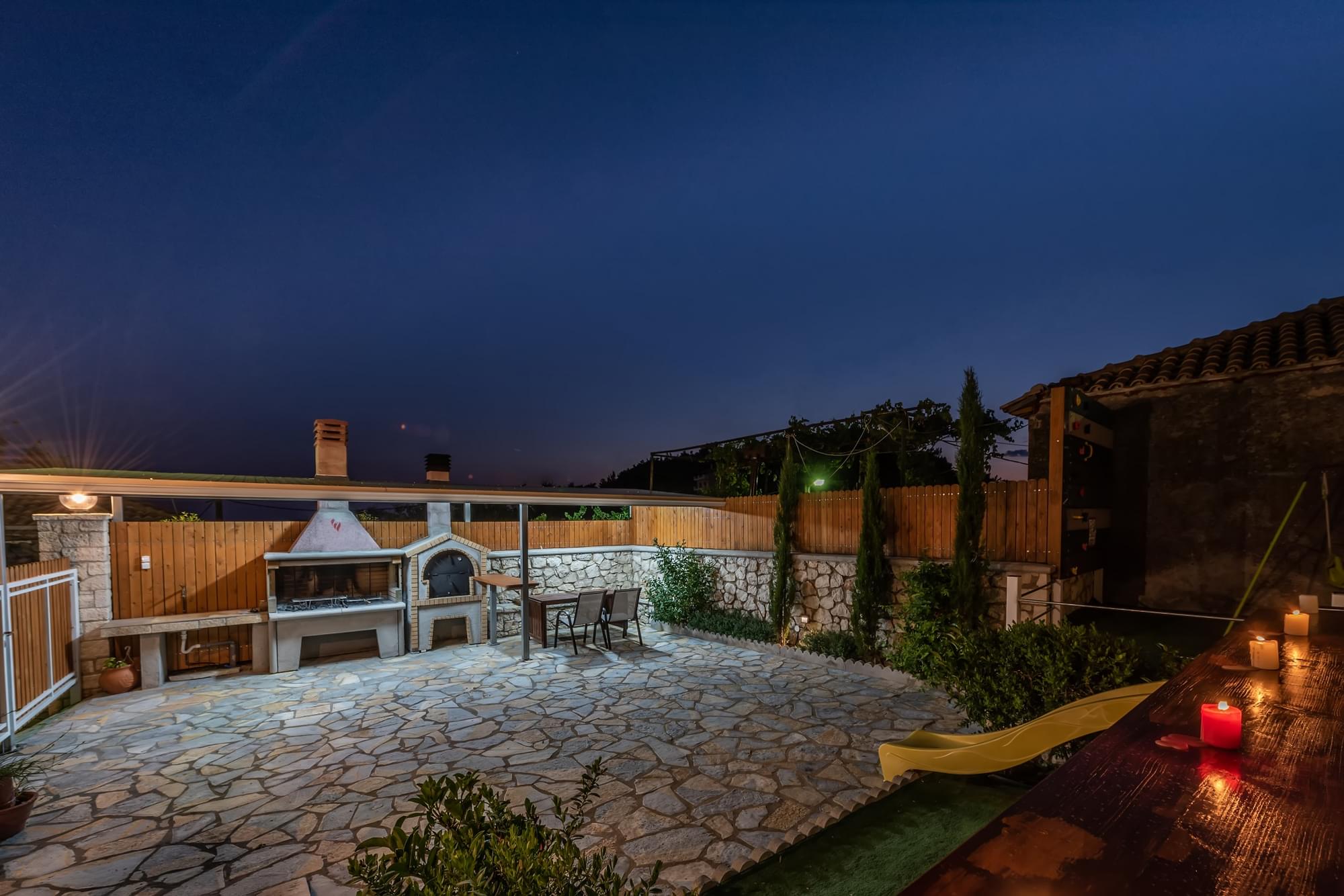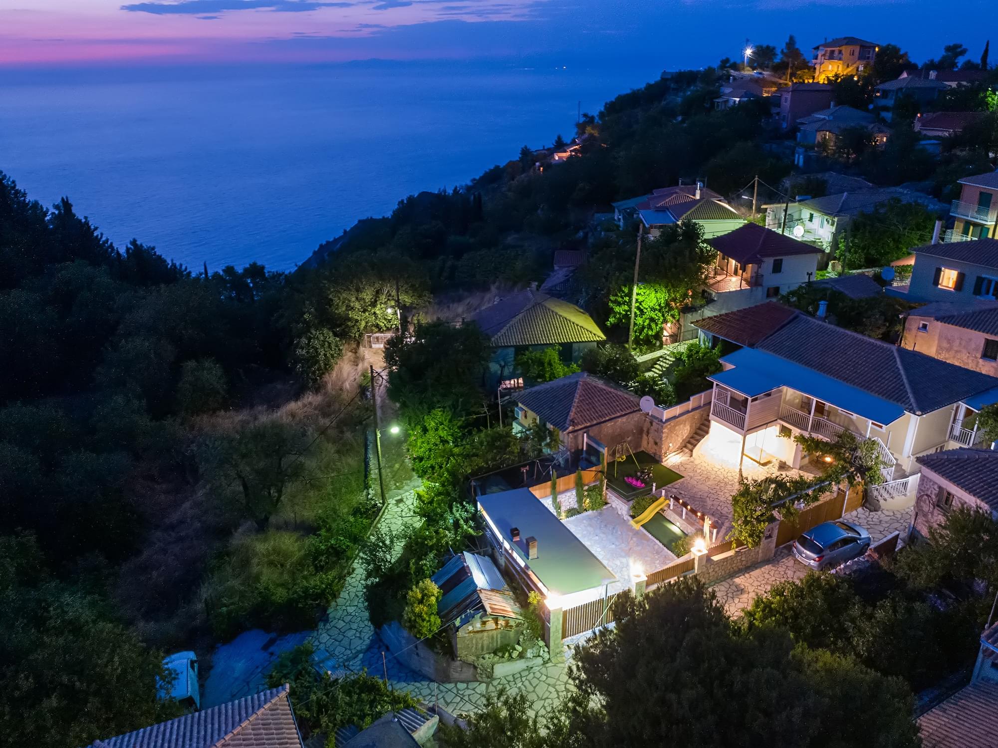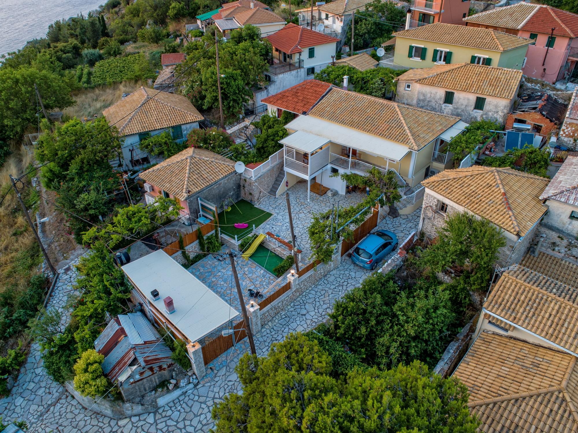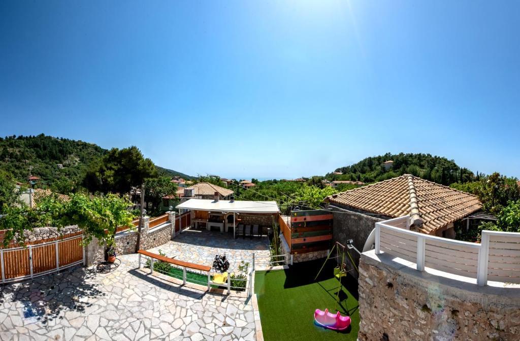 “Matafia’s house” is a self-combined building with two apartments. It is located in a very calm neighborhood but too close to the taverns, coffee shops and mini markets of the village, just 200-300m. From the first floor you can enjoy the nice view of the amphitheatrically village till the immense Ionian Sea. In the yard you can enjoy your meals as you can find BBQ. Moreover, your kids can have fun in our private playground. There is parking place about 150m from the house.