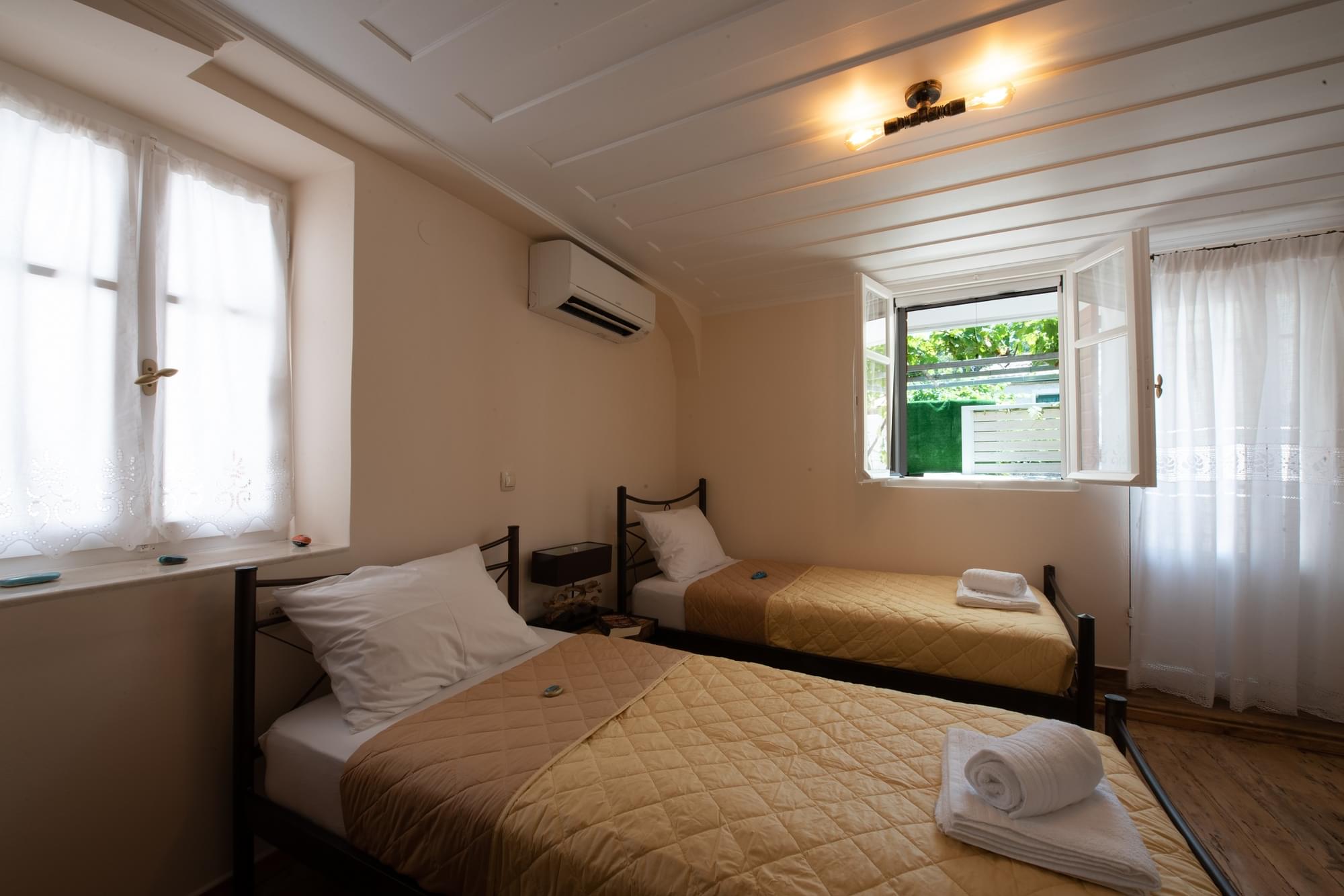 Nikos’s house is built in the middle of the 20th century and accommodated for years the family of Nikolaou and Vasili Karidi. Nikos, the grandson of the family, decides to keep many of the traditional elements and especially the stoned ground floor and the traditional wooden floors and ceilings. Moreover, he chose the best materials to make the house functional and comfortable. Inspired from his kids, he made the yard appropriate for carefree family holidays.