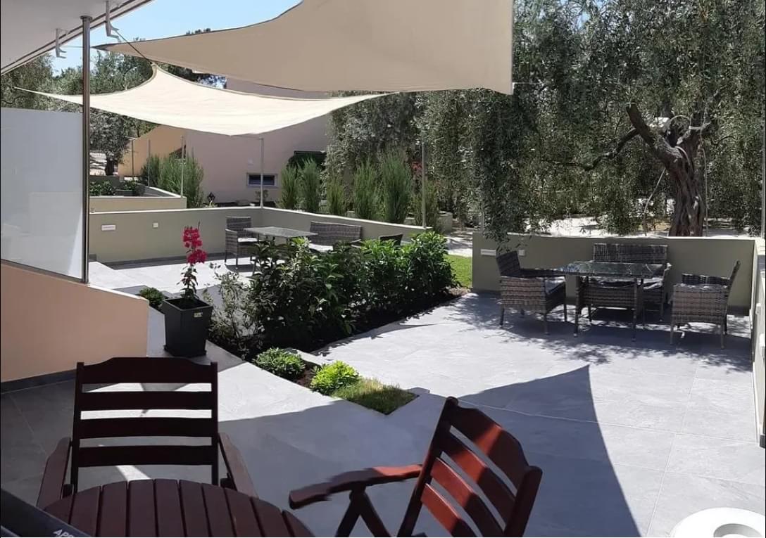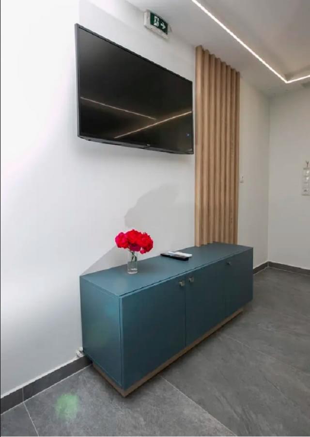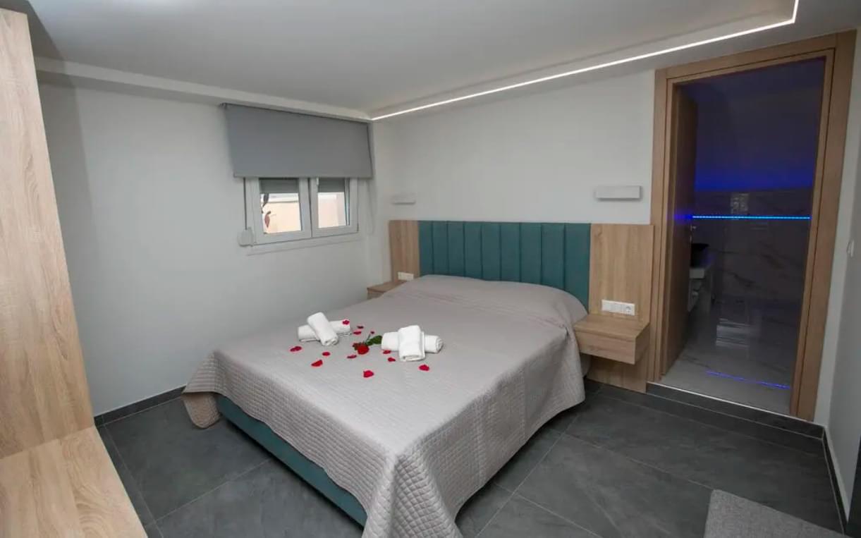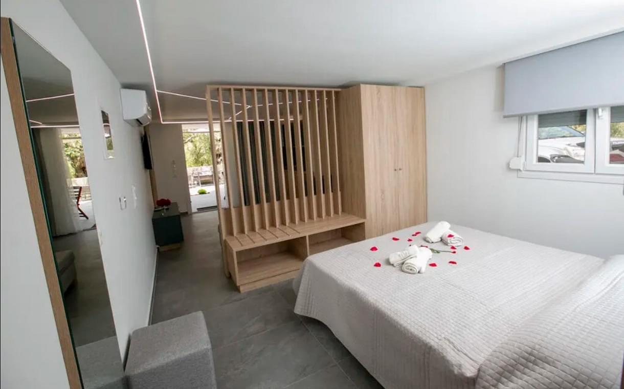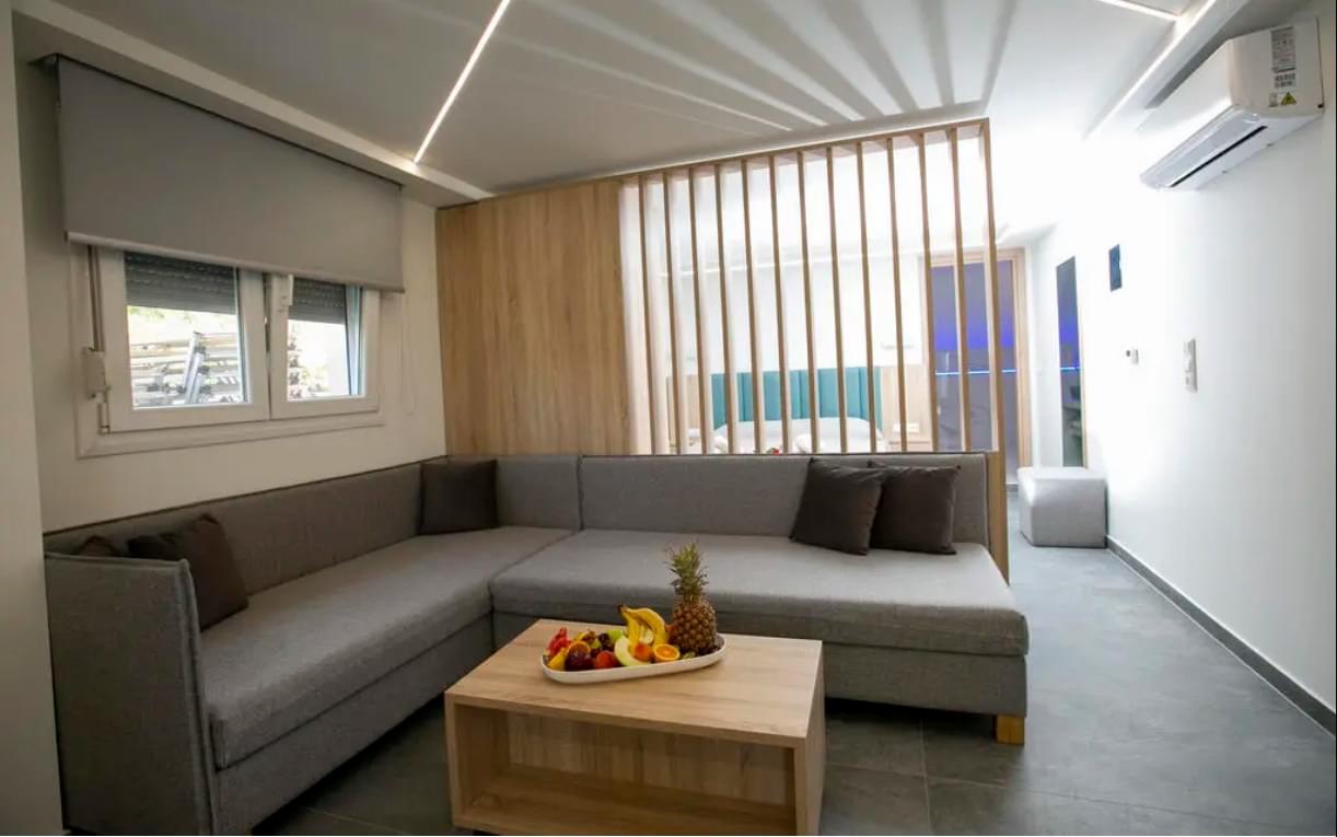 The deluxe suite has a single layout design with a comfortable double bed but there is also a large sofa bed. The suite has a small equipped kitchenette with a fridge. It also has air conditioning, satellite TV, hairdryer, safe and all the other necessary amenities that will make you feel like home. In addition, the private bathroom is spacious and is equipped with a shower cabin as well as a jacuzzi. Finally, the suite has direct access to the furnished private garden-yard.