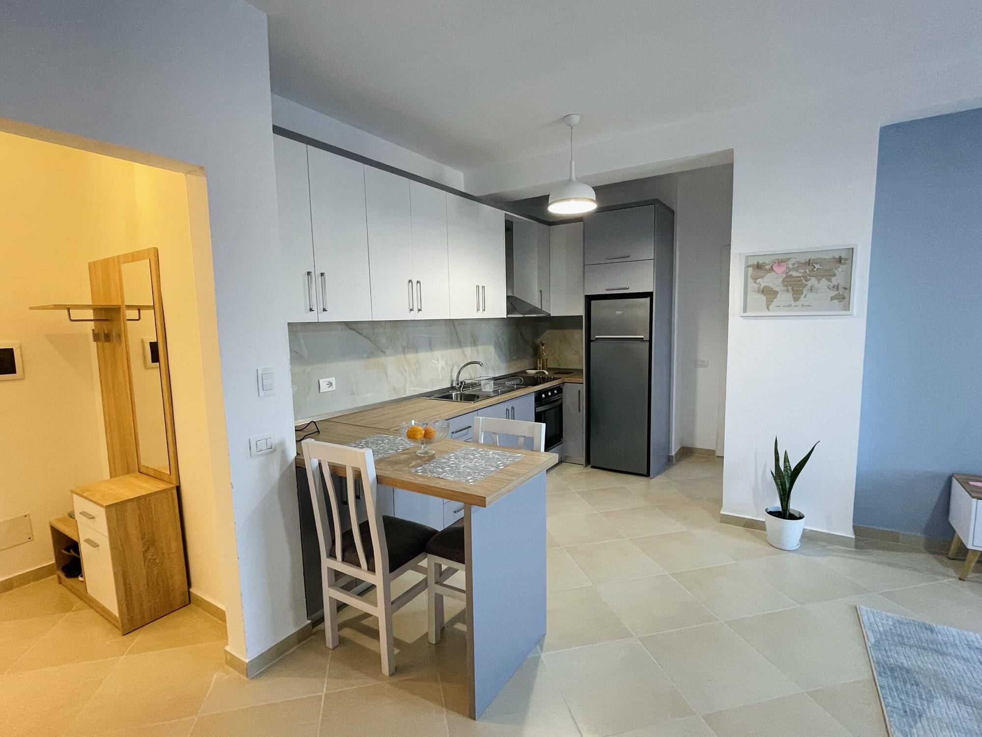 Clean, spacious, and at the center of the city, with the right calm atmosphere for guests preparing themselves to explore the good out there! The kitchen is equipped with all the amenities needed even for a long stay, we also provide a laundry machine. After exploring the roundabouts of Divjake, you can enjoy the evening with a nice view of the sunset.